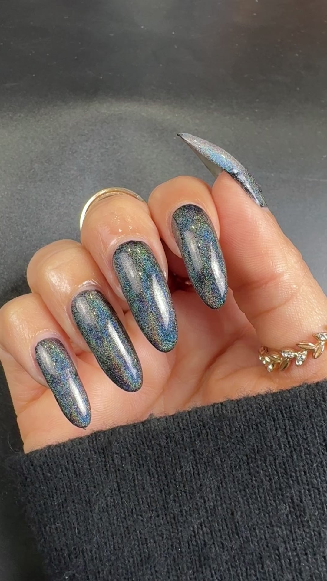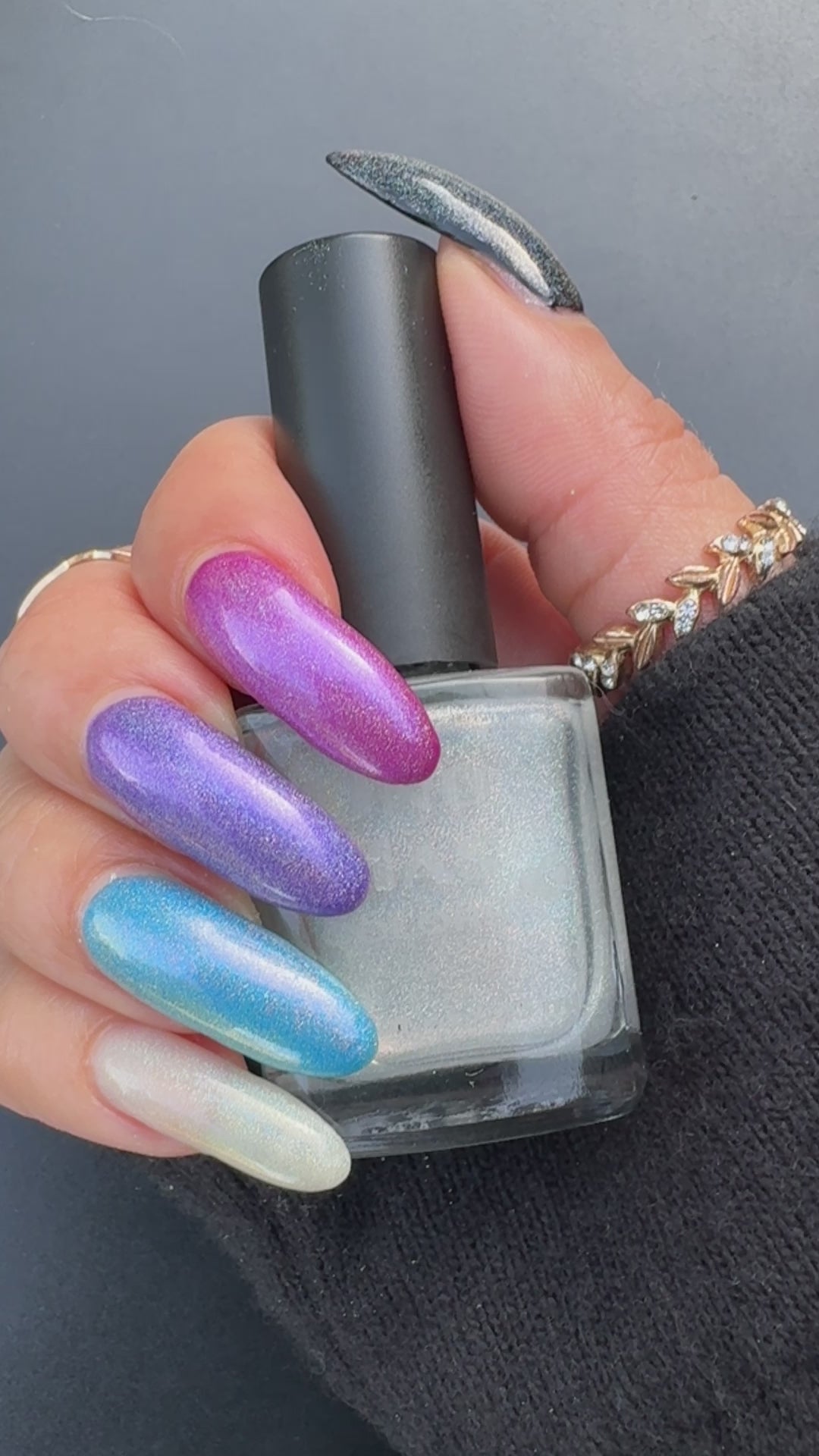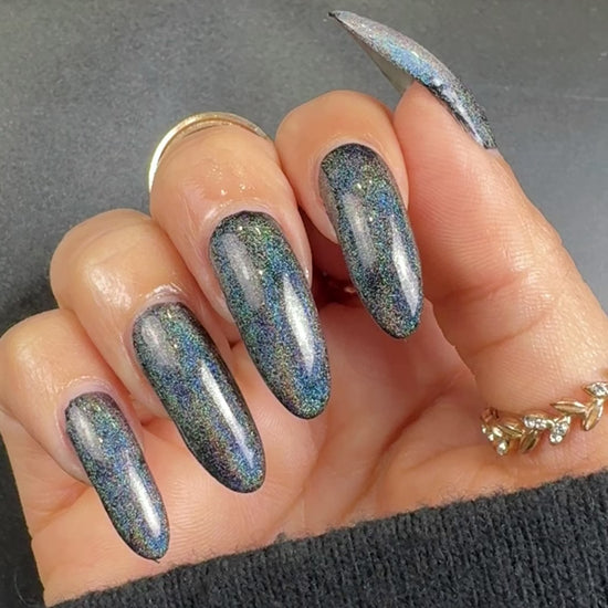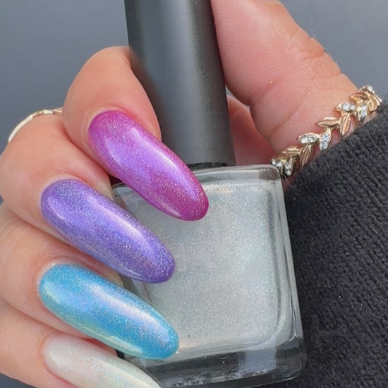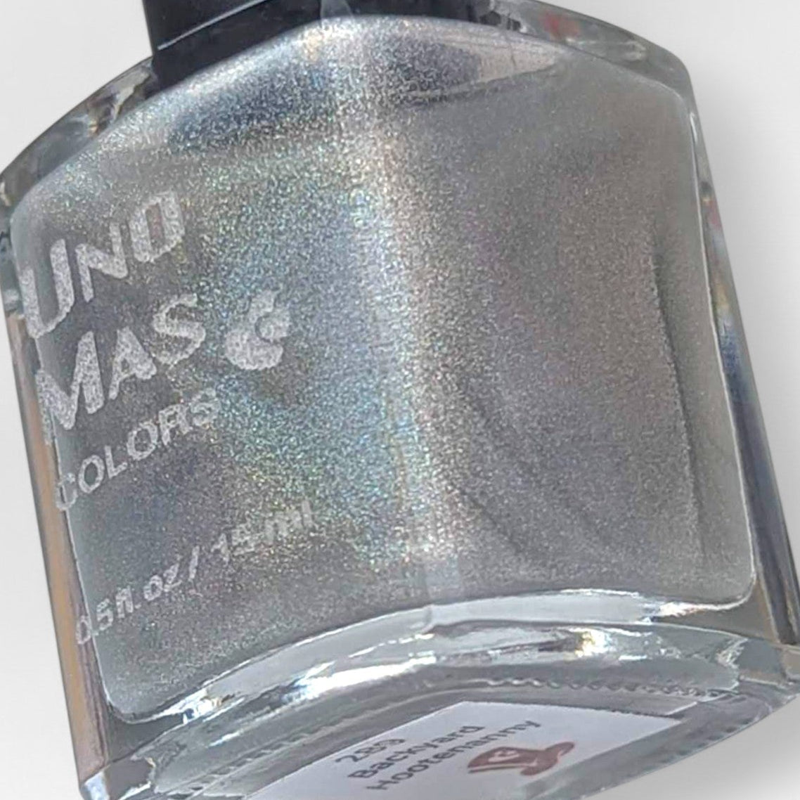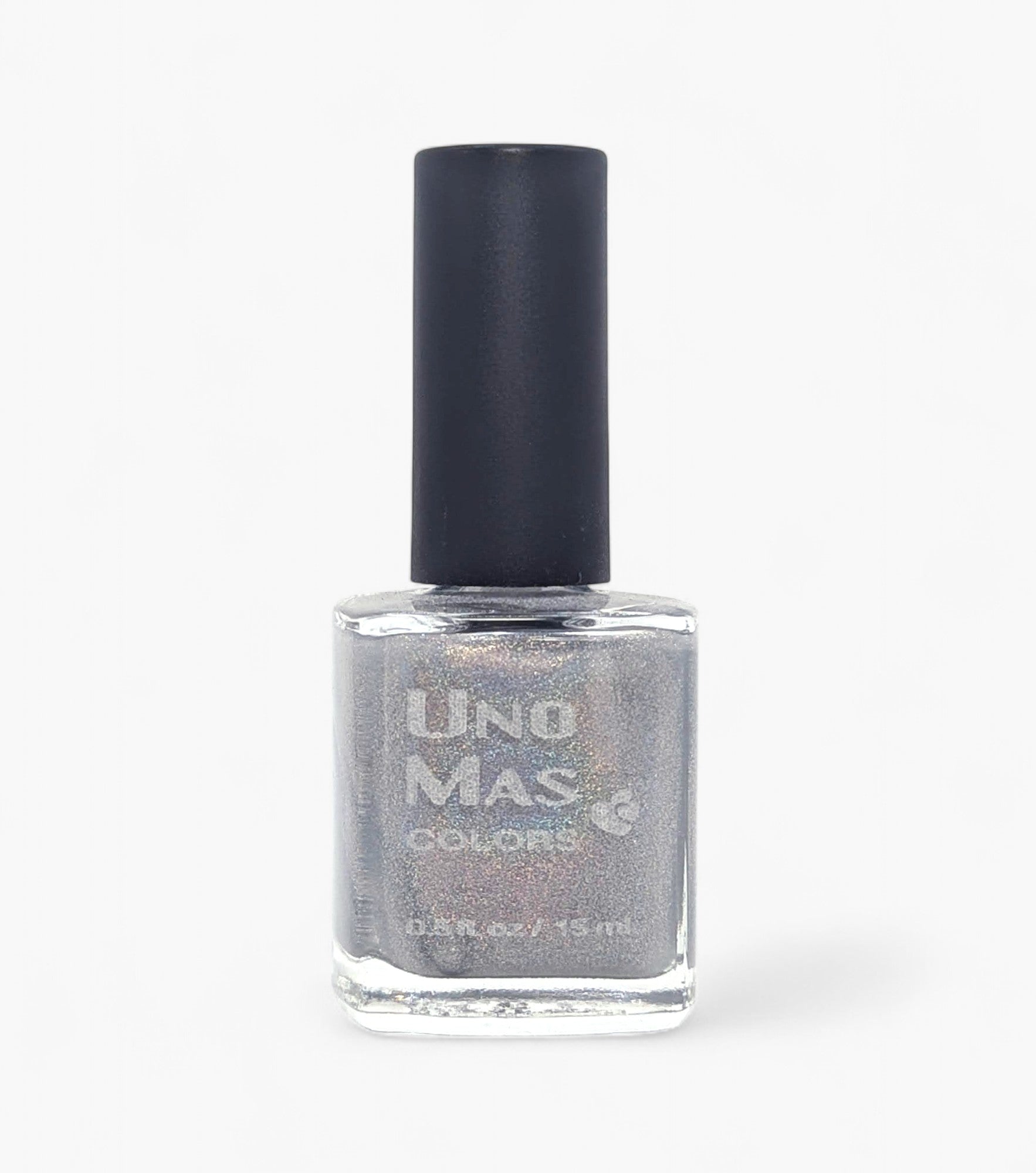 We suggest trying a single coat over any of your favorite Uno Mas color polishes to make a unique combination. Use additional coats to get a stronger holographic effect.