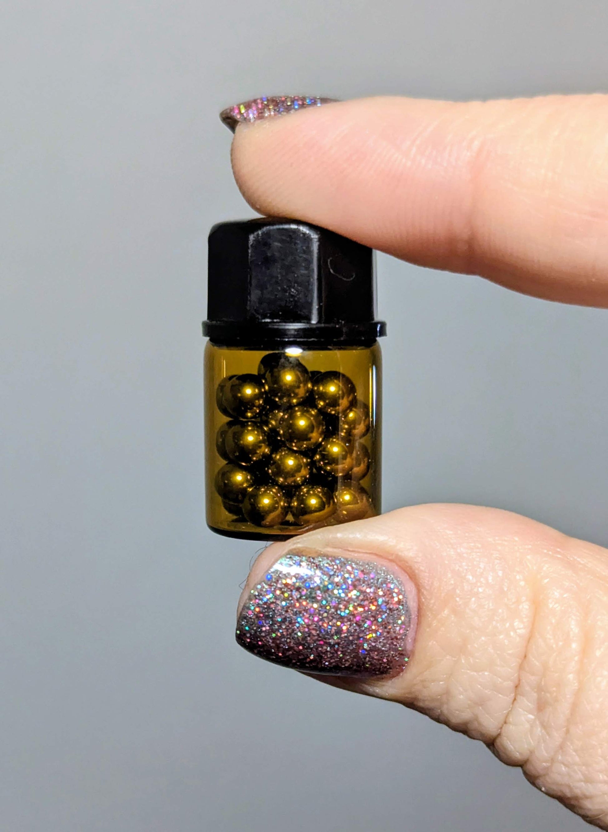 This is an adorable bottle with ~30 stainless steel balls that won't rust in your polish. You don't need these for Uno Mas polishes but now you can buy a handful instead of 2,000 at a time, just in case another brand no longer includes them.