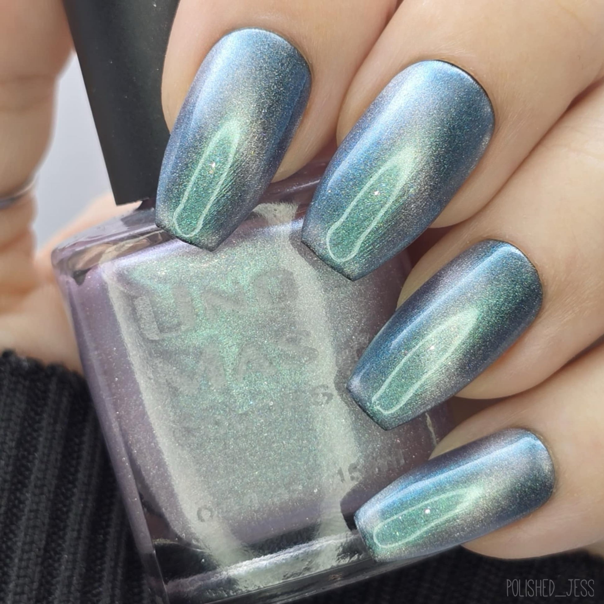 This polish contains a magnetic holo pigment that is simply too much fun for words. It does a great cat eye and looks fantastic as a velvet so get creative and see what else you can do! When magnetized, this polish reveals a base of silky lavender purple shimmering with blue/green.