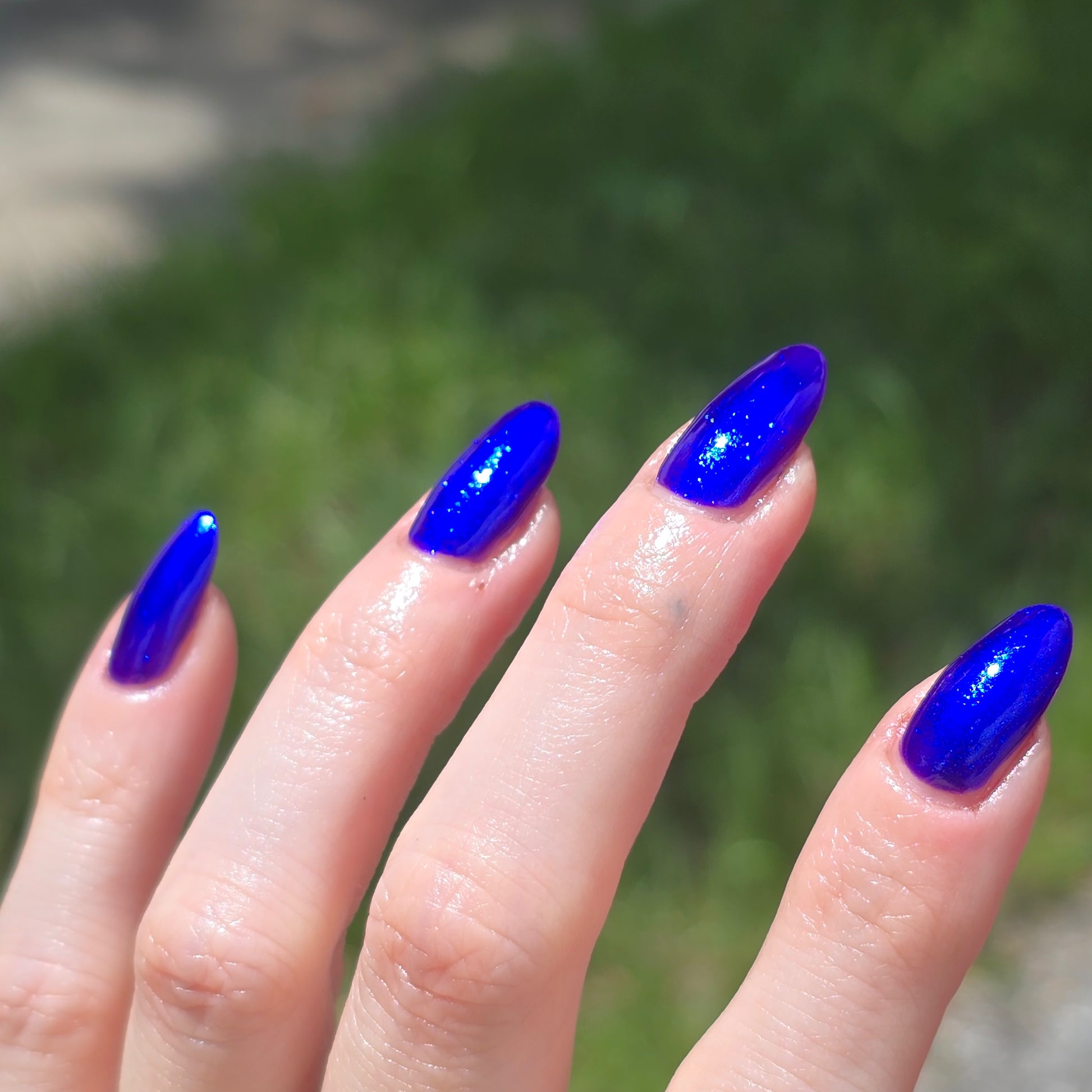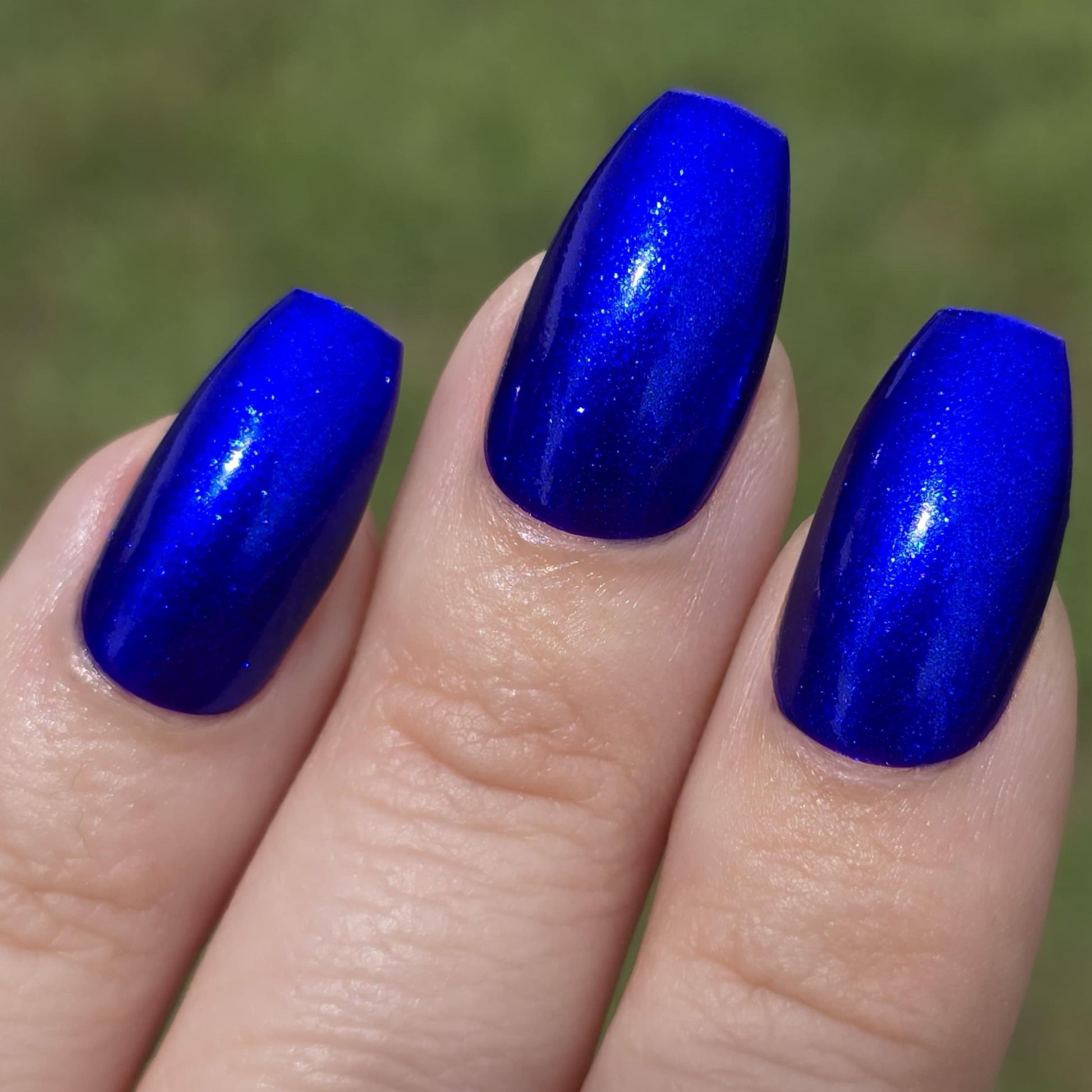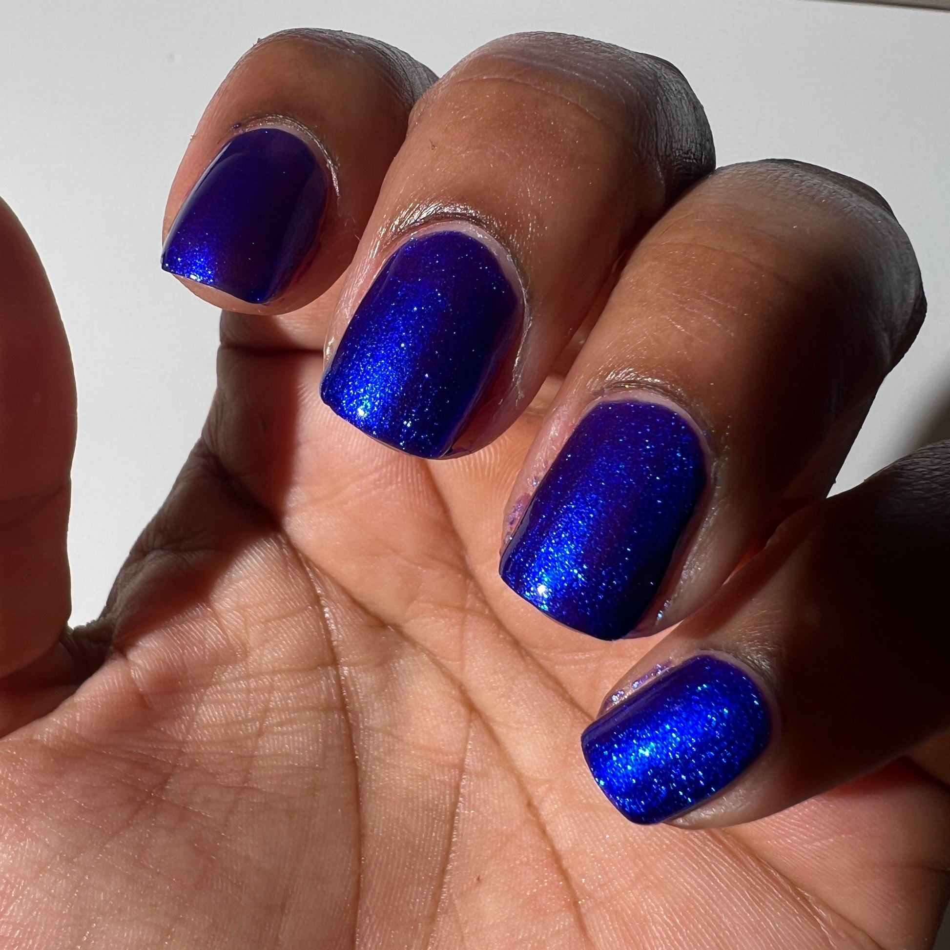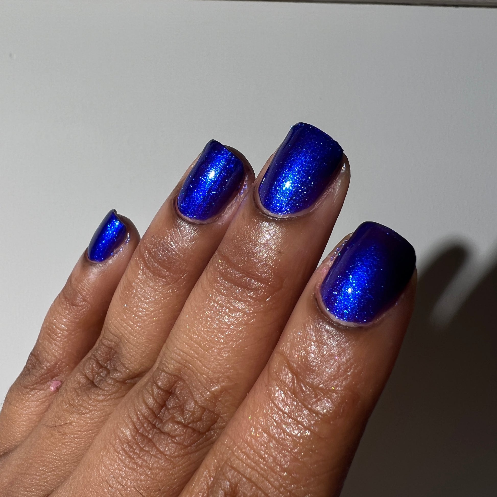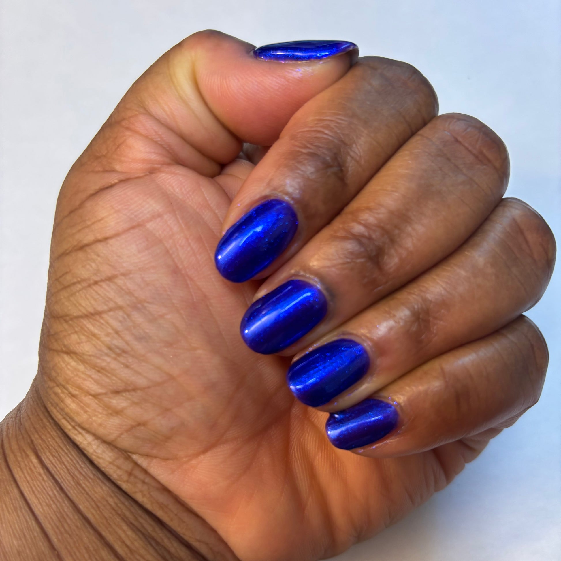 This is a shimmery, sparkly blue, with a hint of purple that will catch you off guard when you least expect it. It goes on smooth, completely opaque in 2 coats.