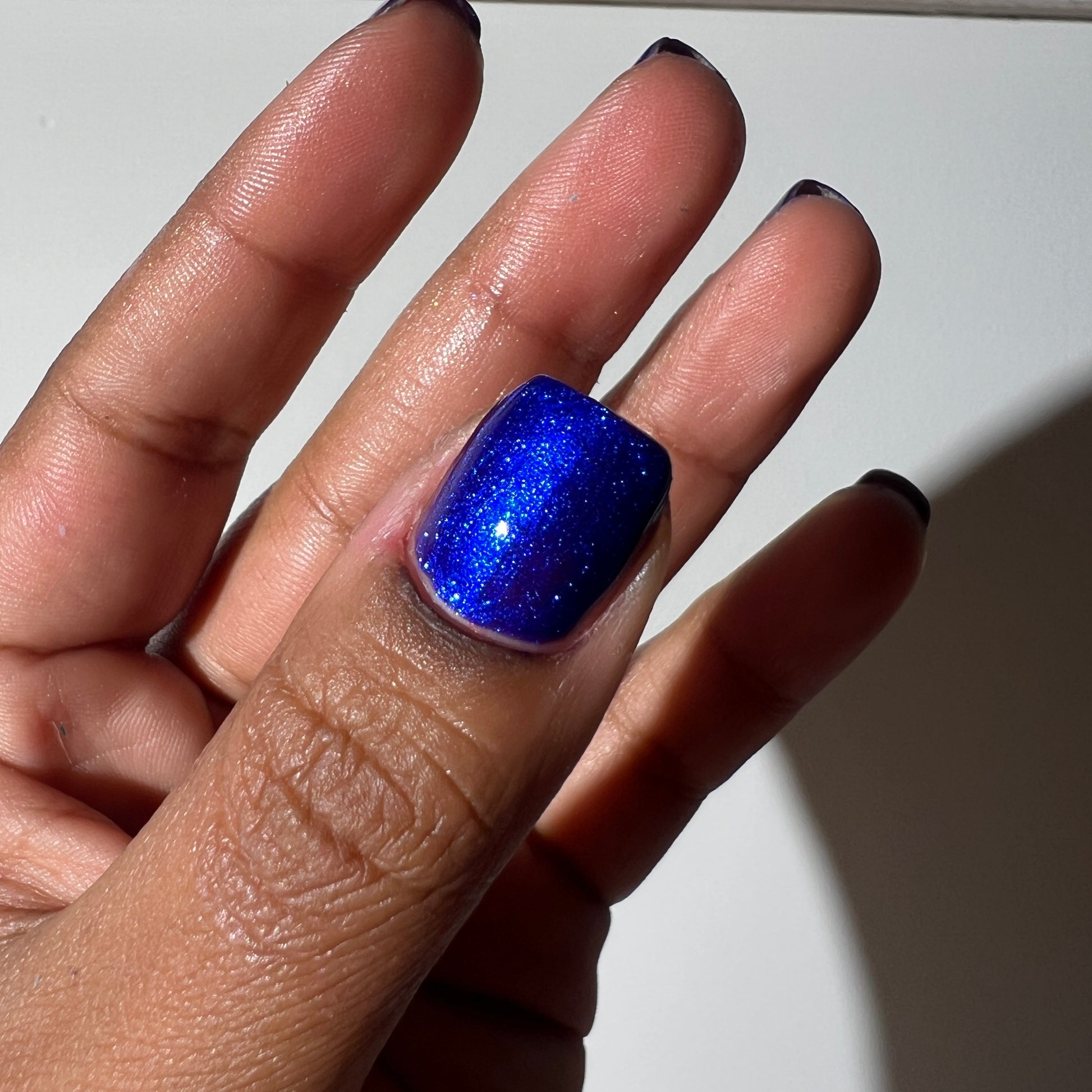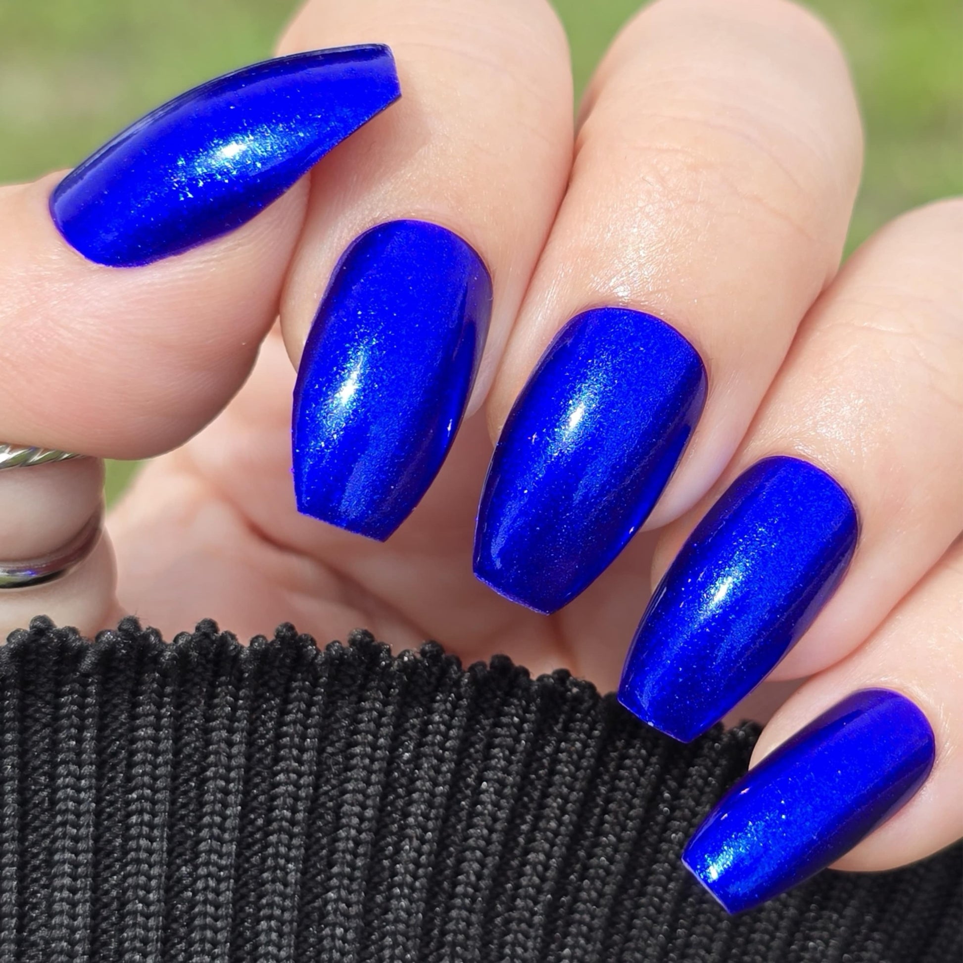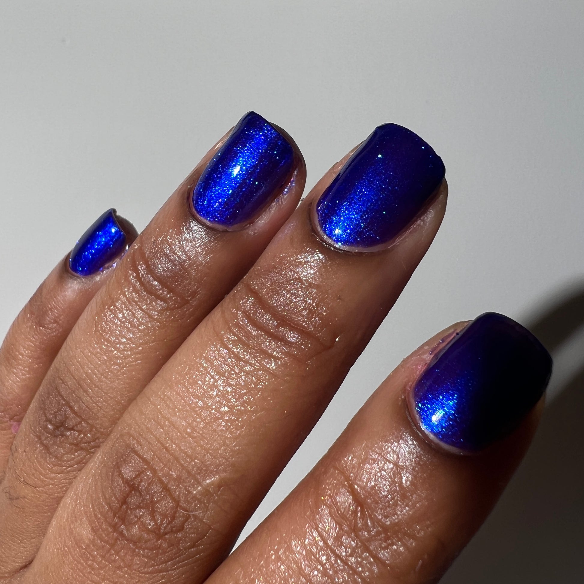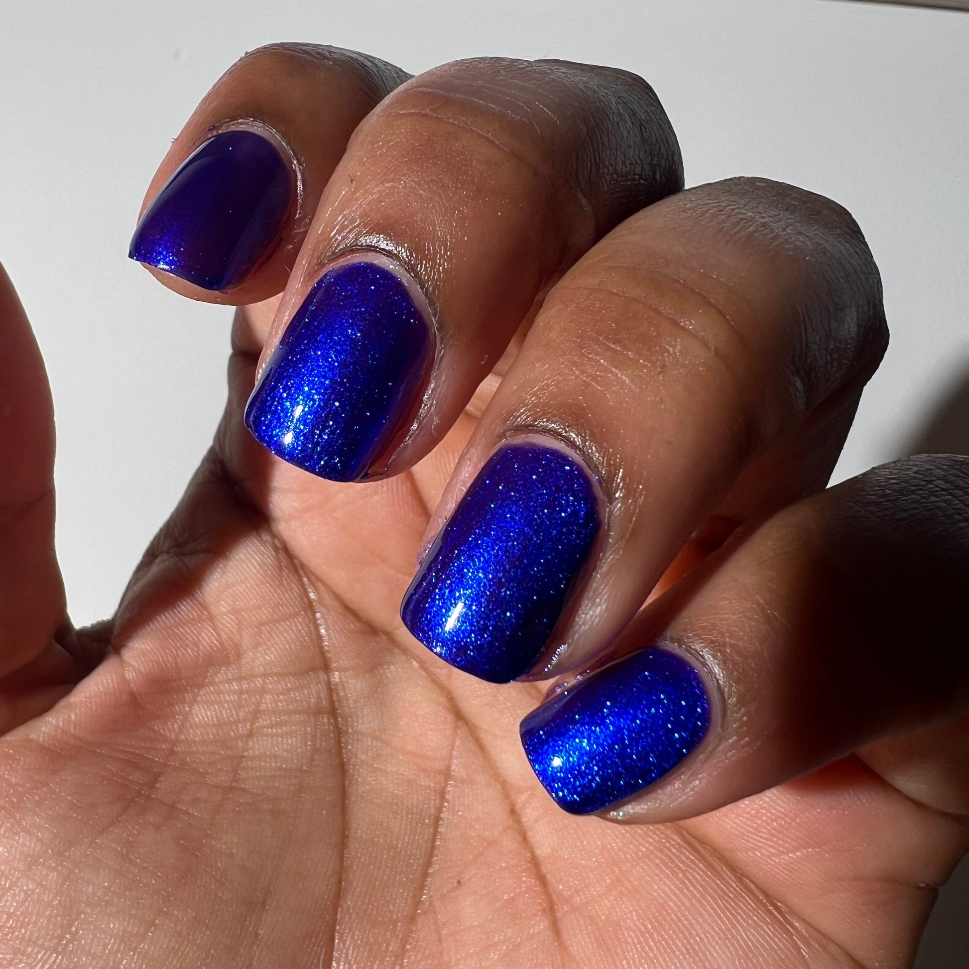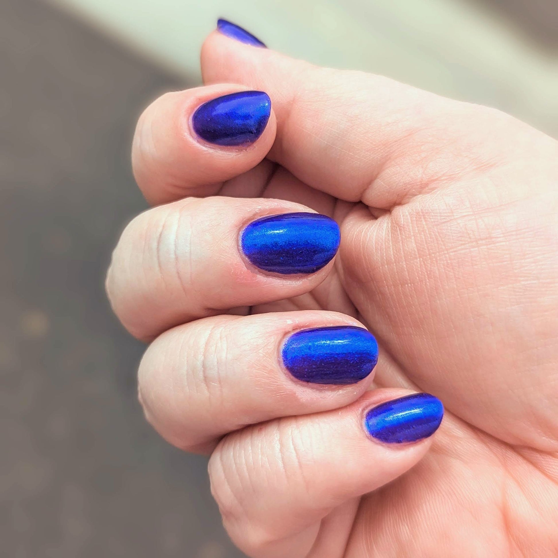This is a shimmery, sparkly blue, with a hint of purple that will catch you off guard when you least expect it. It goes on smooth, completely opaque in 2 coats.
