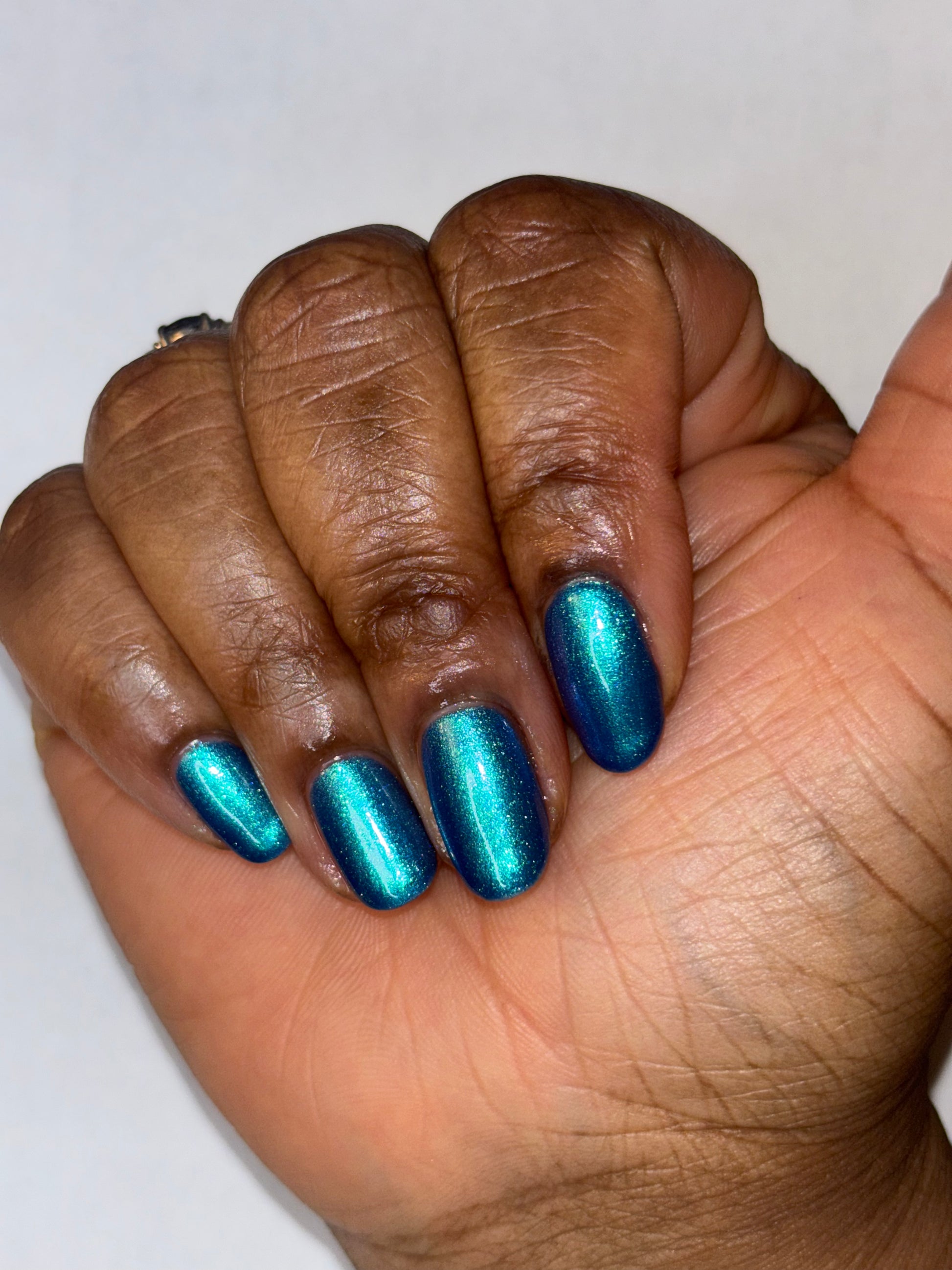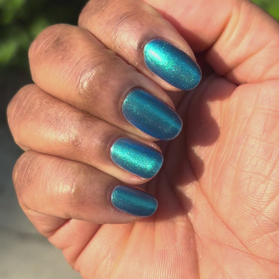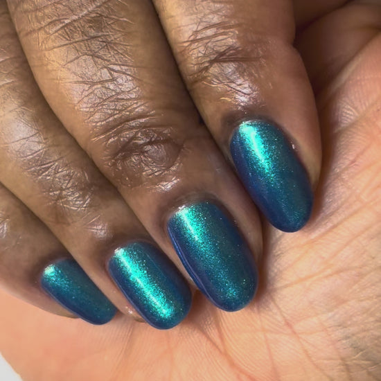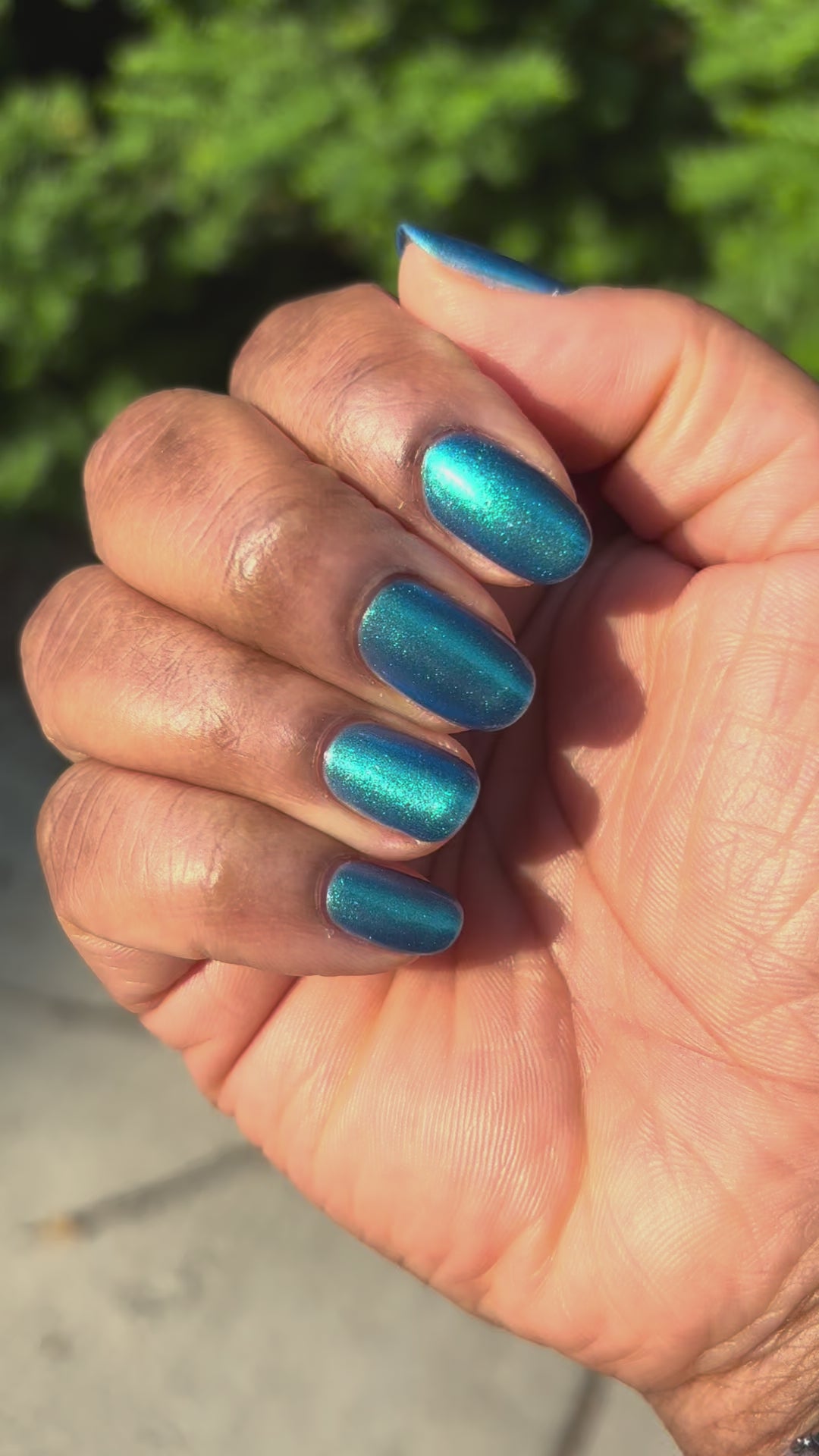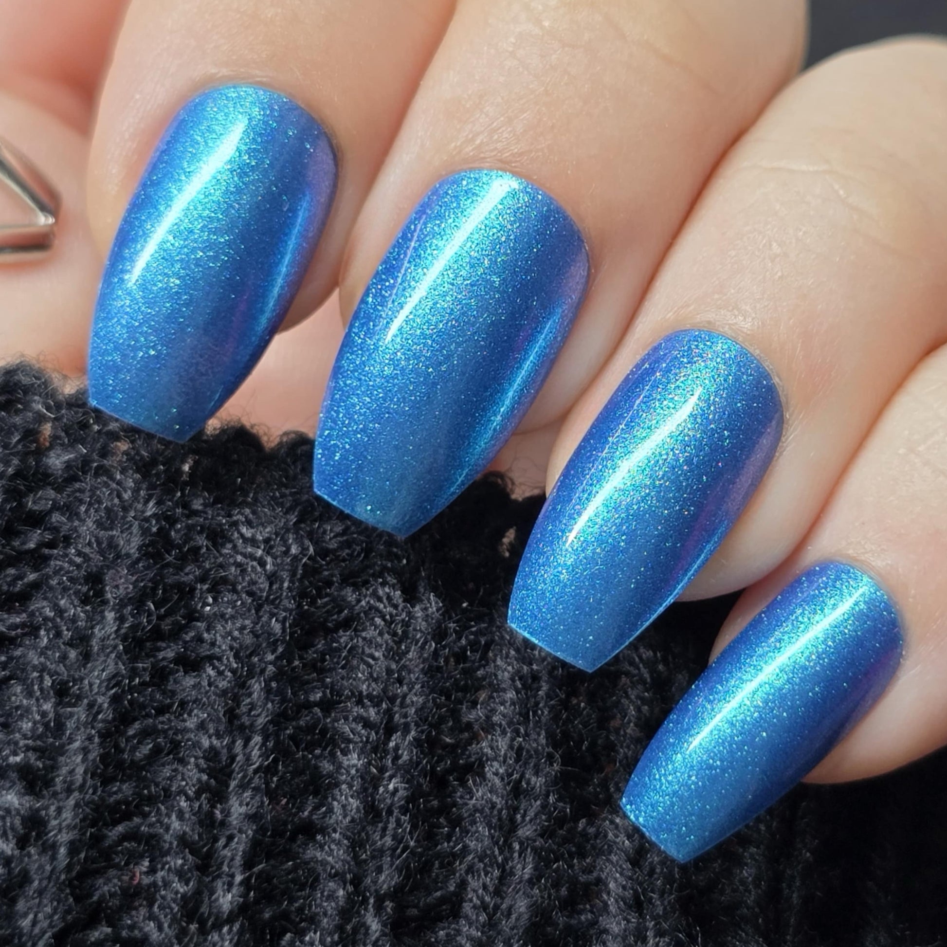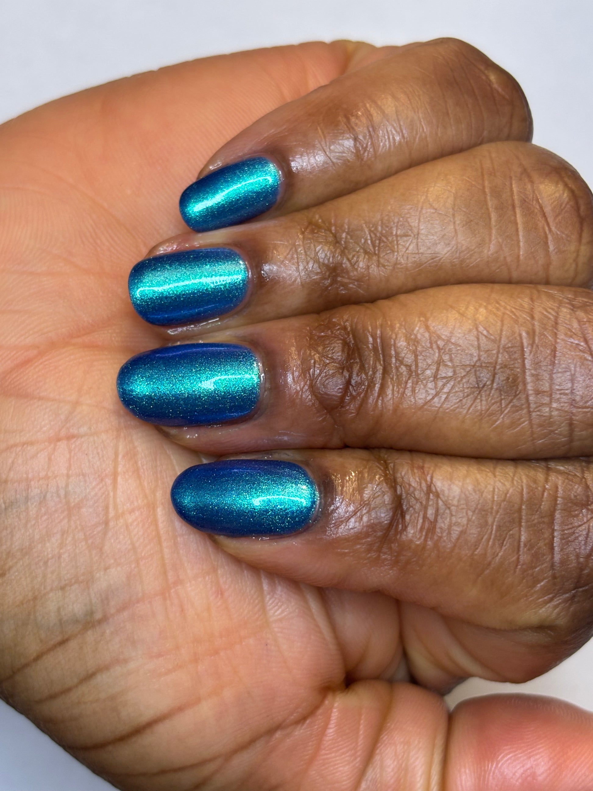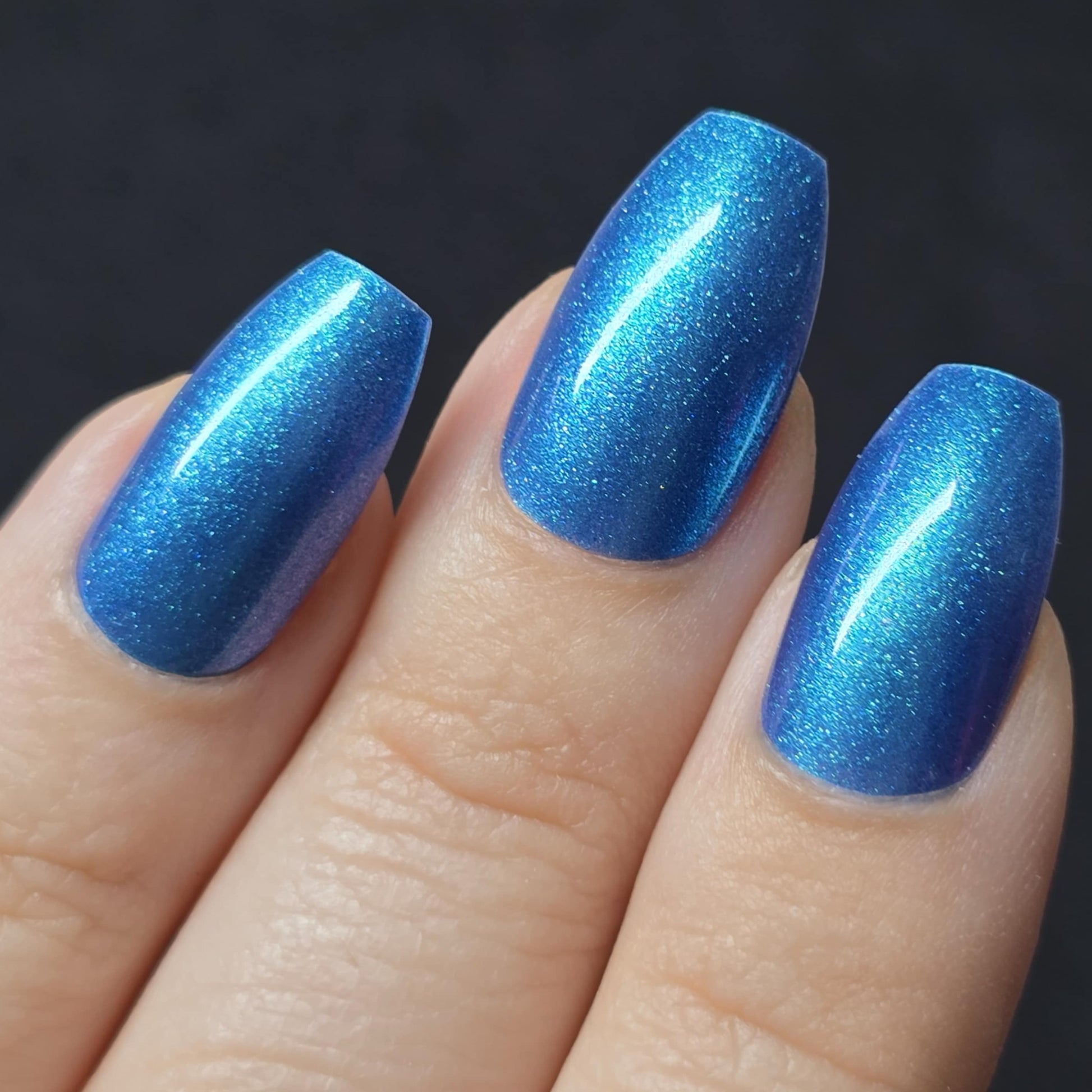 The strong blue tones give way to subtle green and purple shimmers as you layer. This color shift polish leans on the cool side of the palette. For best results, we suggest two even coats to get the deepest hues, and bright shimmers that will last a good period of time.
