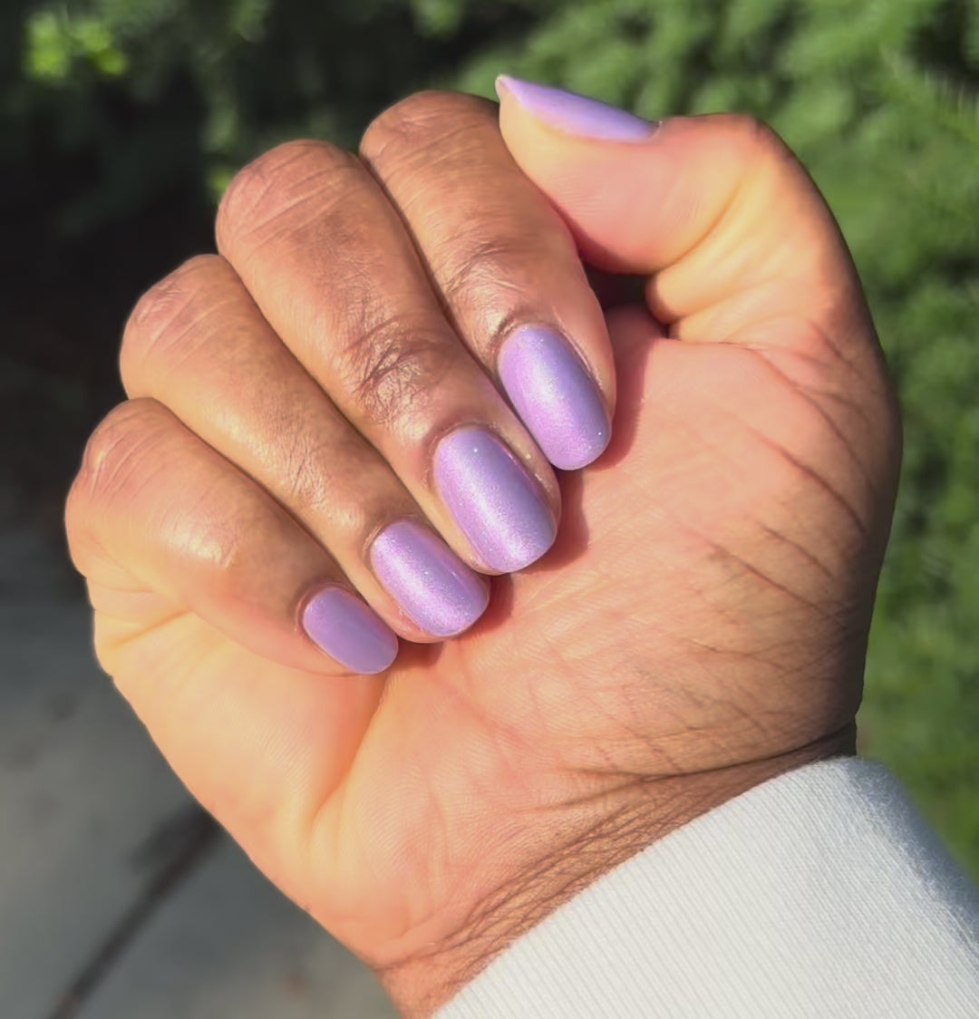 This is a solar reactive formula that changes from a light lavender to a deep purple in UV light including that big ball of light above us. (You can cheat and use a UV light to make it change inside too!) The color switch has infinite shades depending on how sunny it is, how long your nails are exposed, etc. and this is a fast change formula so it goes back to lavender within 2 minutes of being inside.