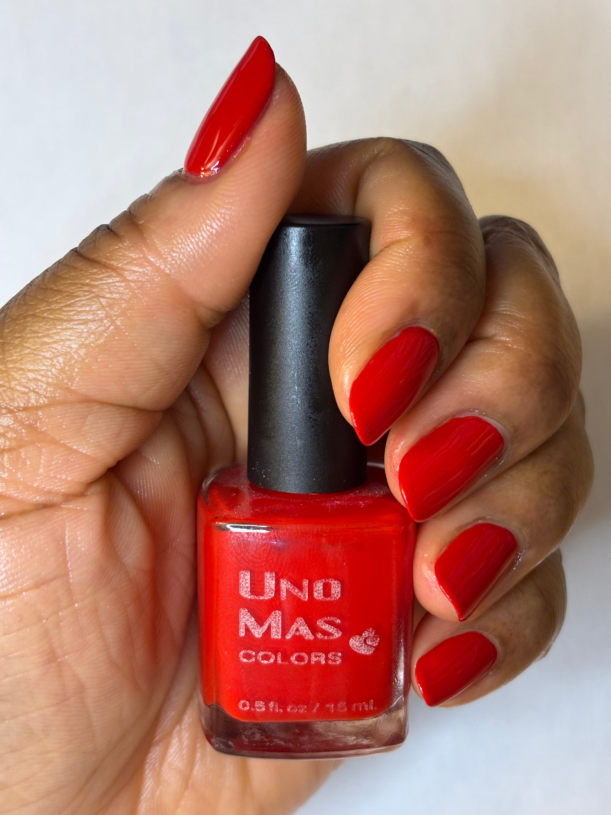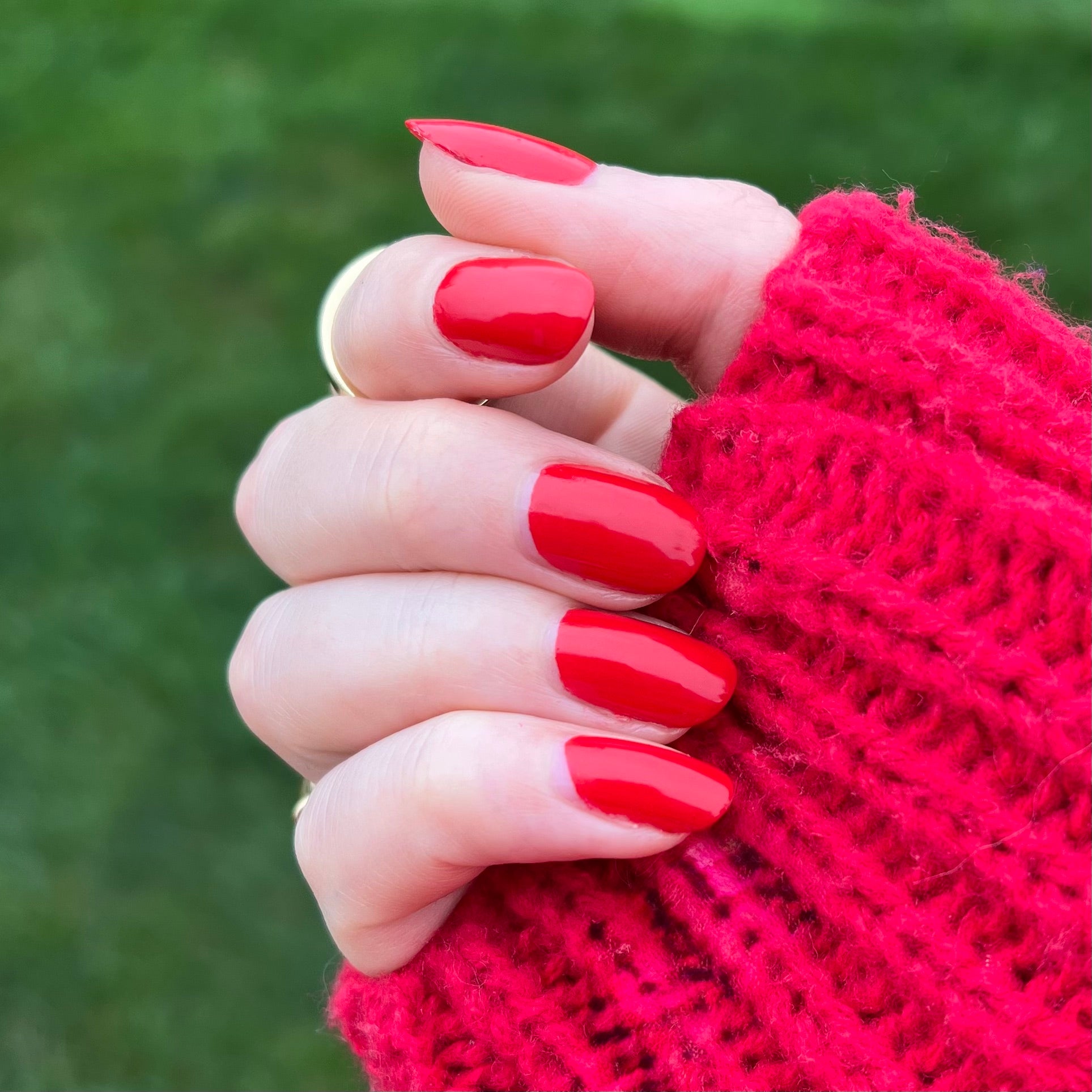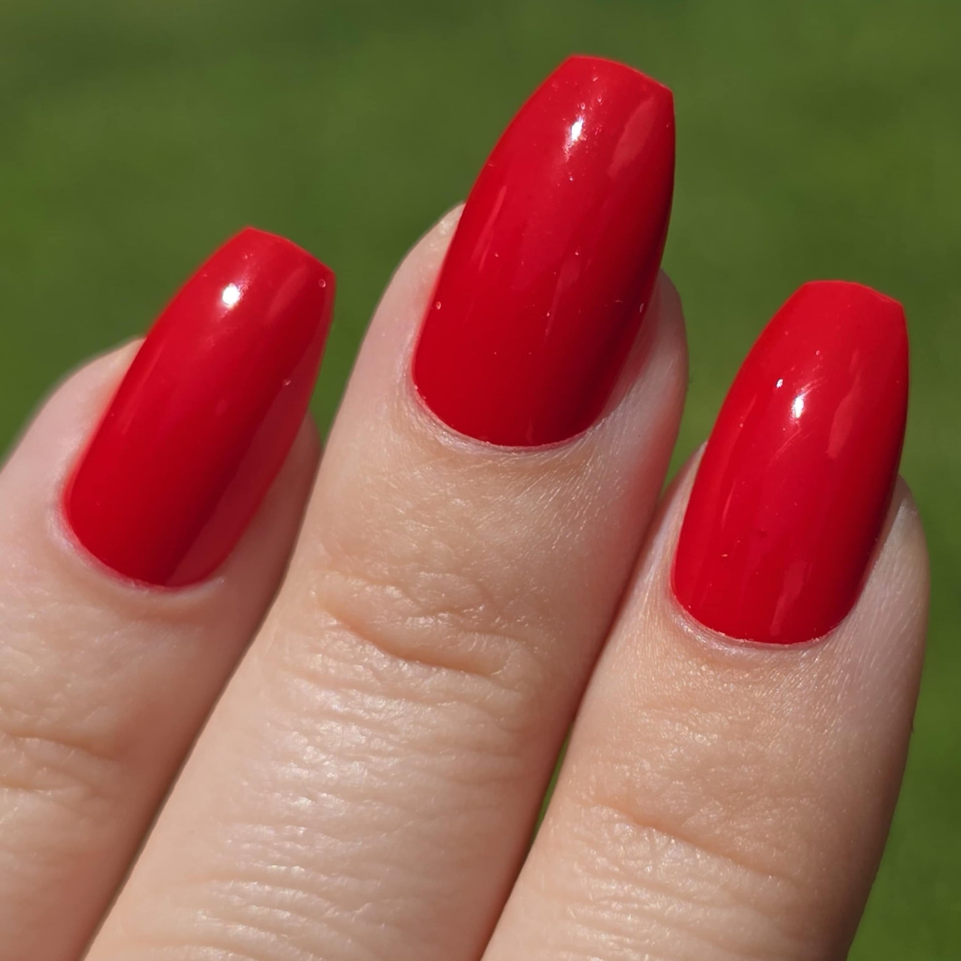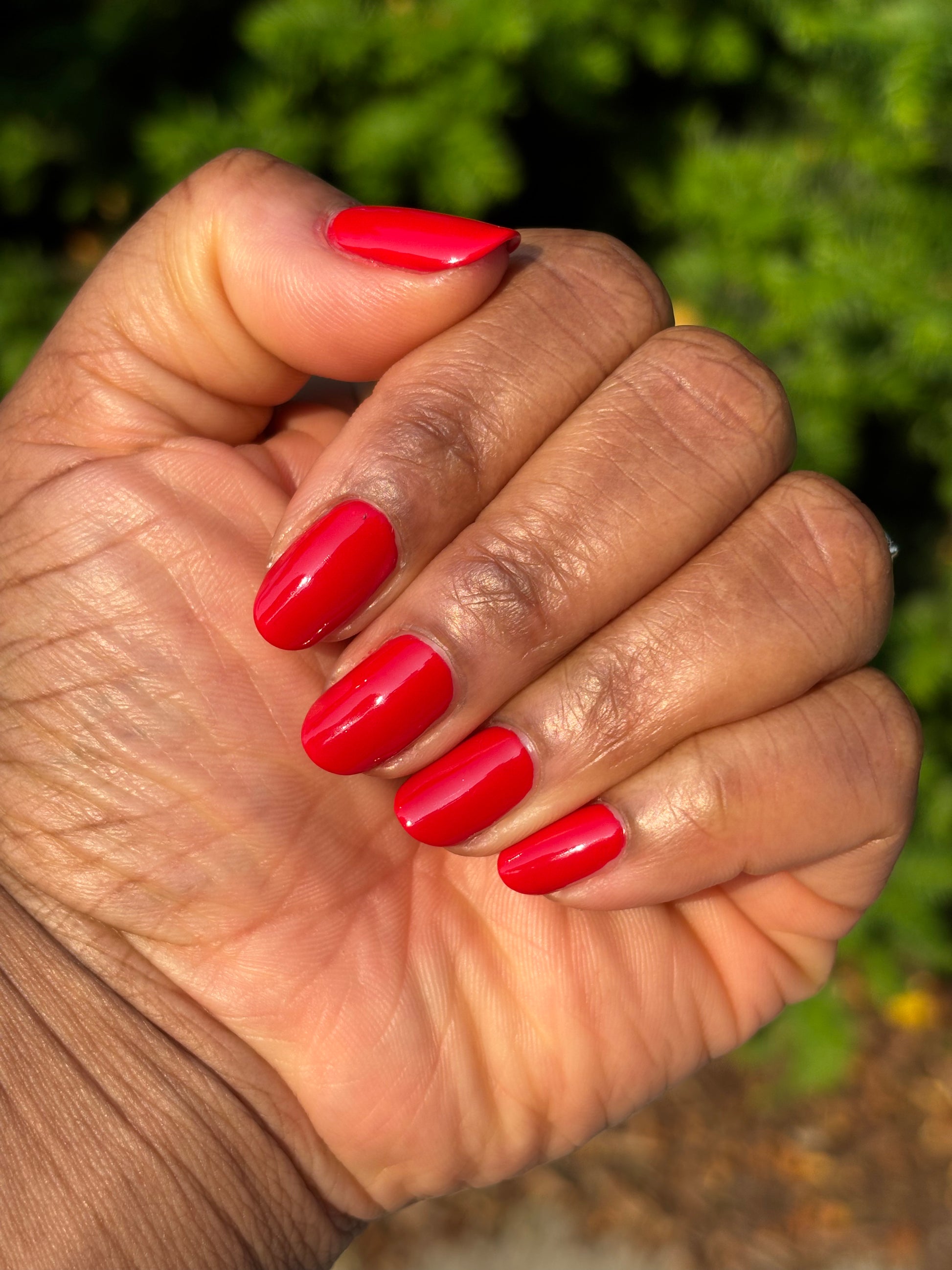 This polish is a custom red creme that's strong with one coat but we suggest two coats for a strong mani to match your energy!