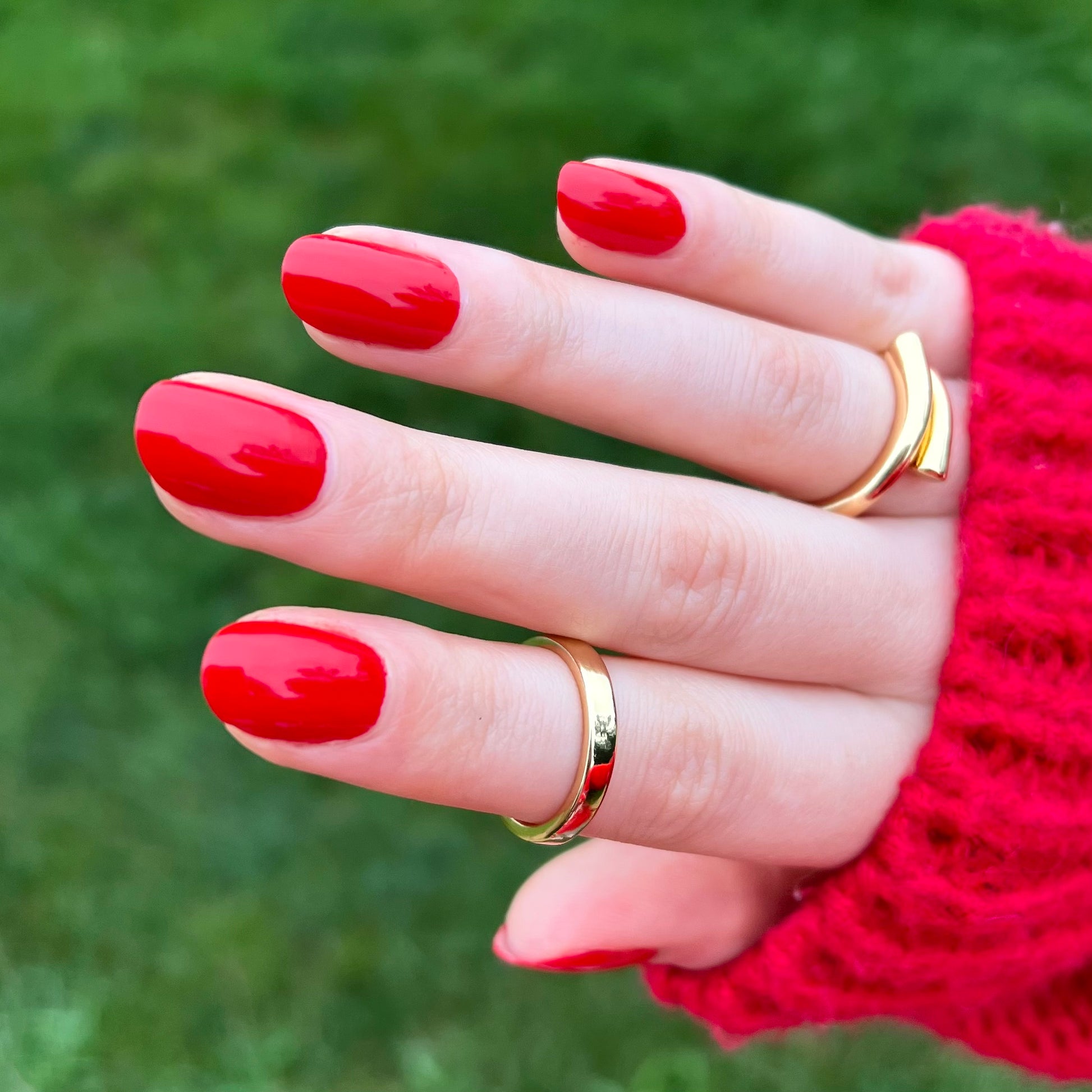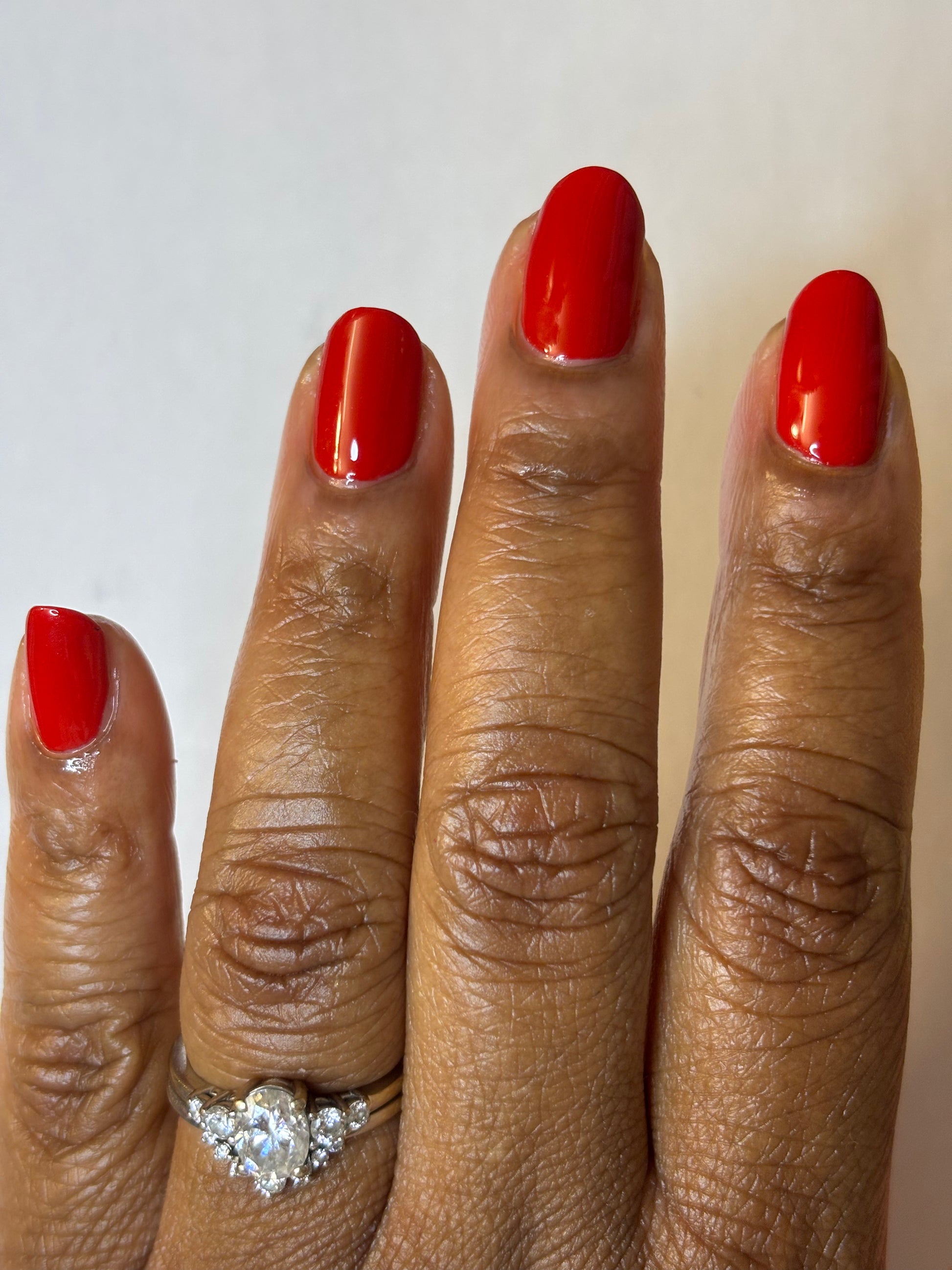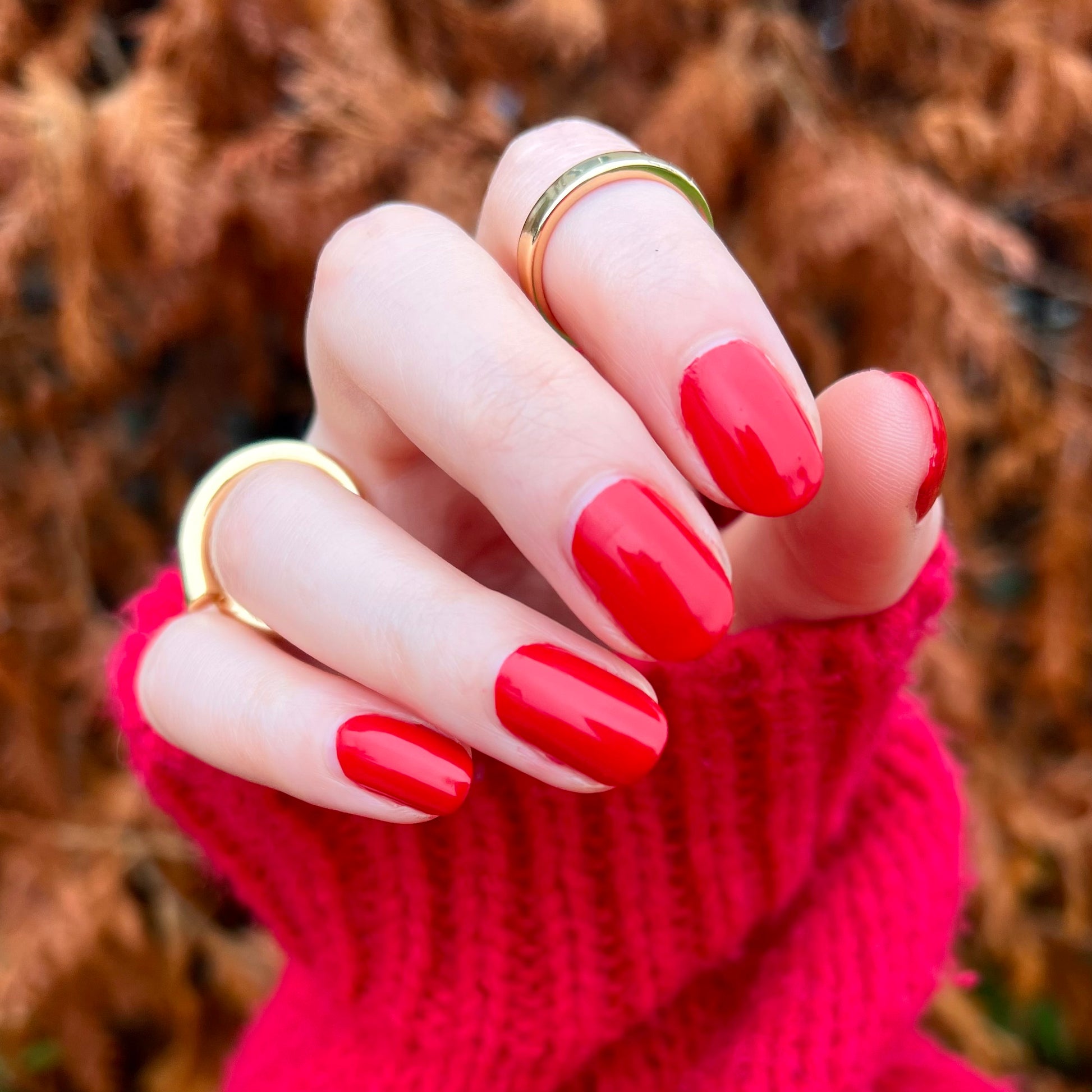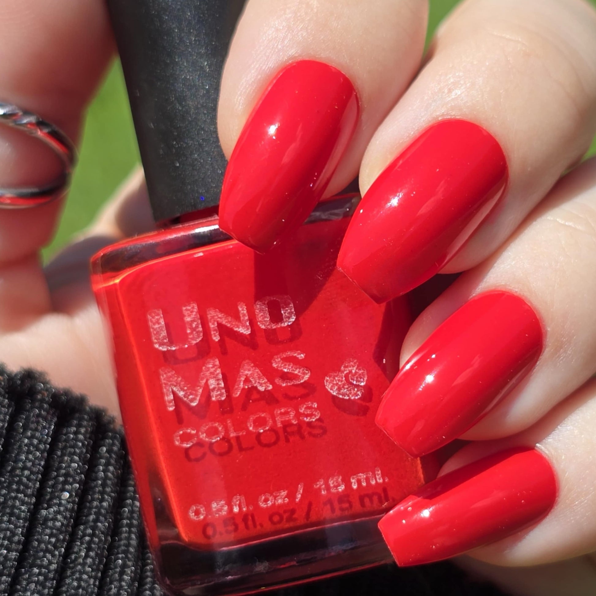 This polish is a custom red creme that's strong with one coat but we suggest two coats for a strong mani to match your energy!