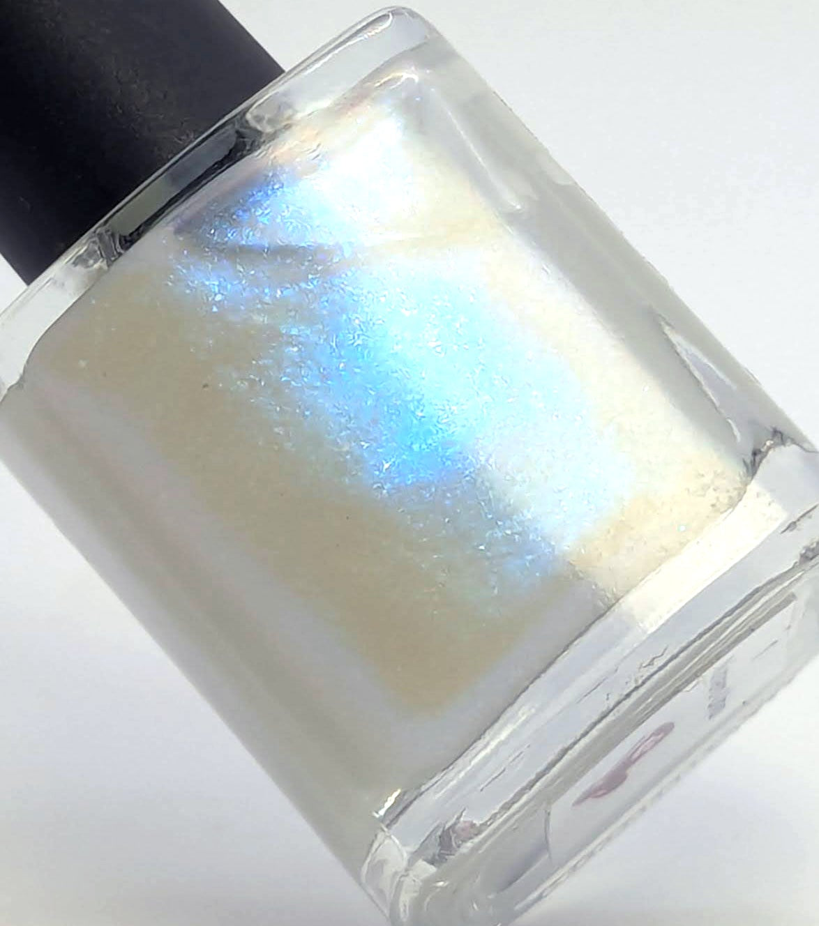 Like most blue shimmer toppers, this topper has a slight gold undertone which is invisible on almost all base colors except white. When applied to a stark white, you end up with an off-white base color with a blue shimmer.