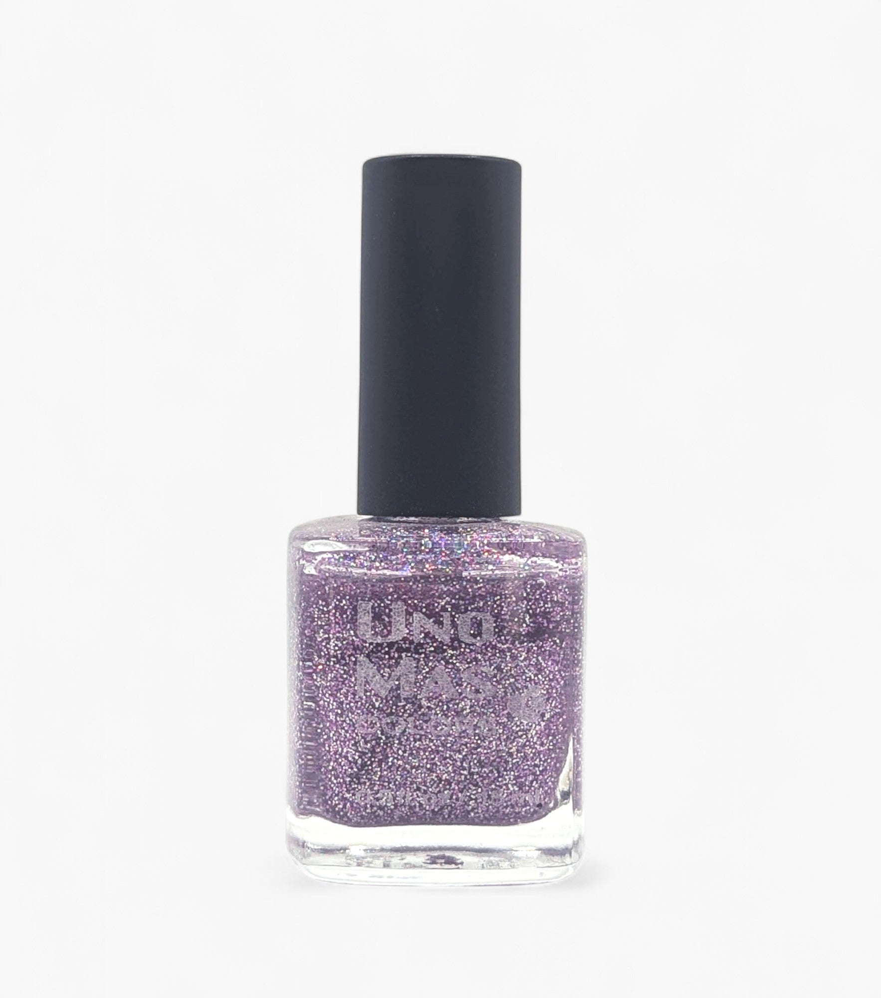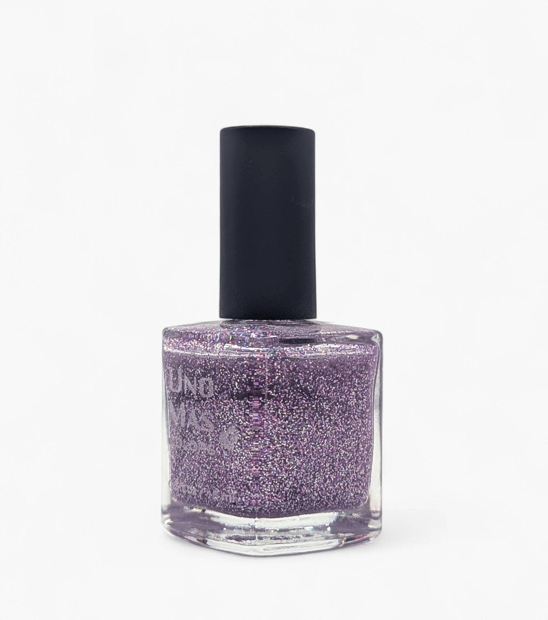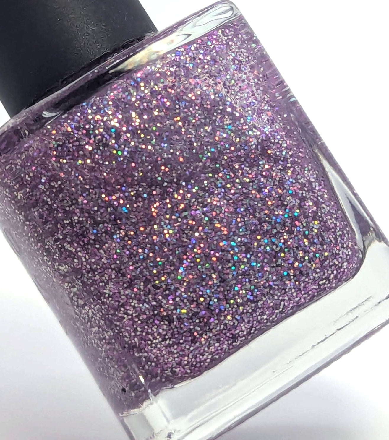 The purple tones are gentle and lean on the cooler side. This gives way for the dominant holographic glitter to sparkle in any light, and compliments all types of fashions for any occasion. The suggested application is two coats with a shiny top coat. However, we encourage you to play with different base coats and layers to fit your unique style.