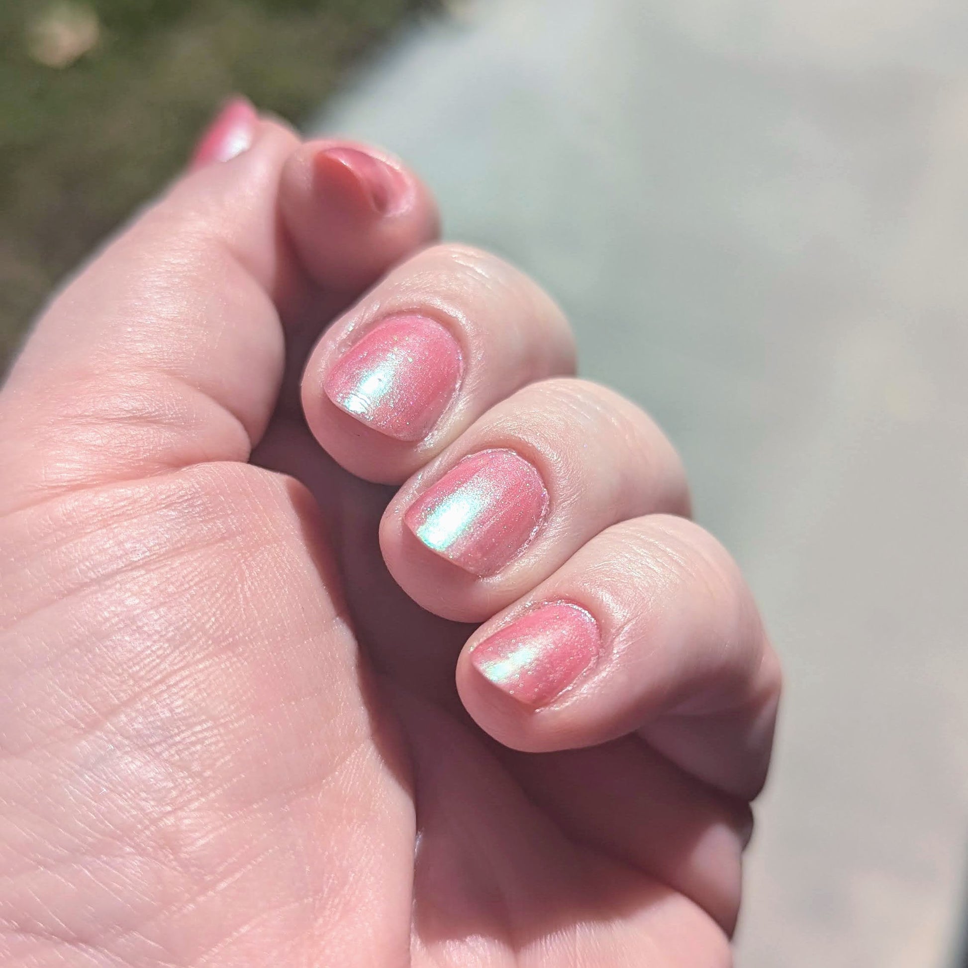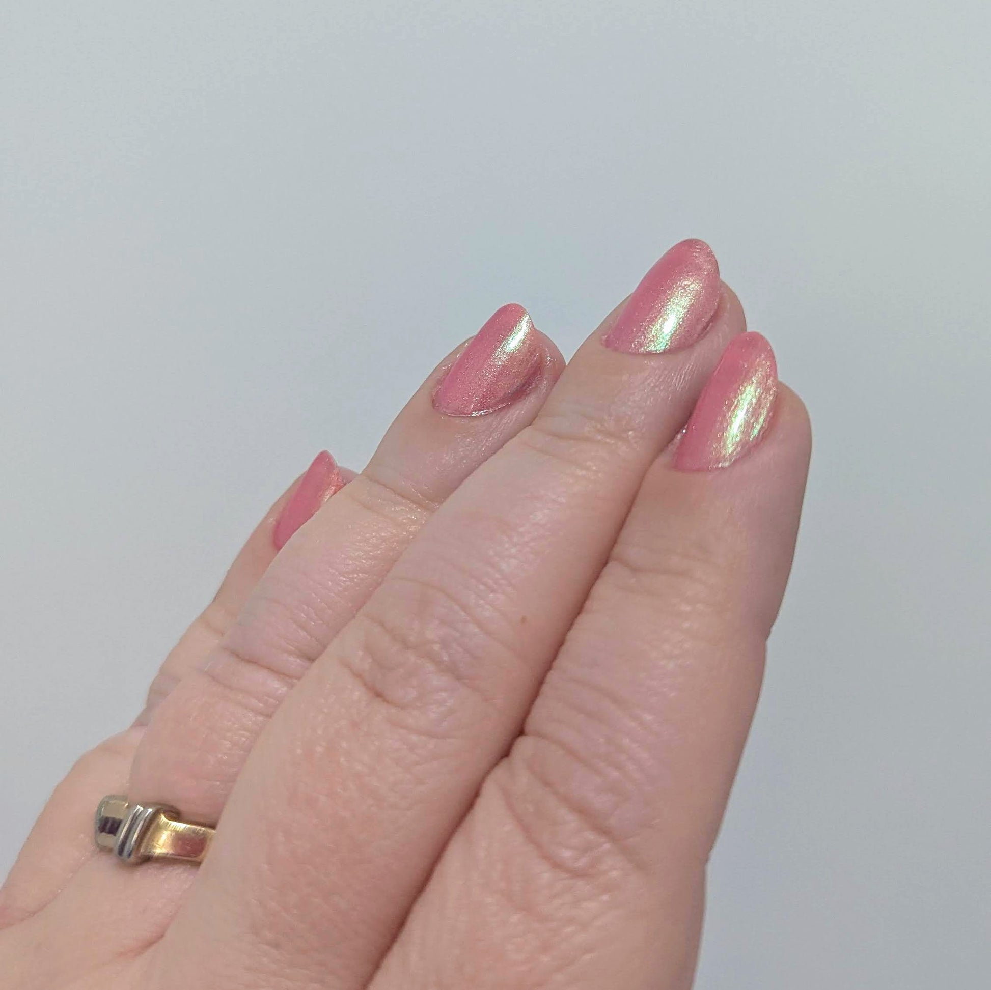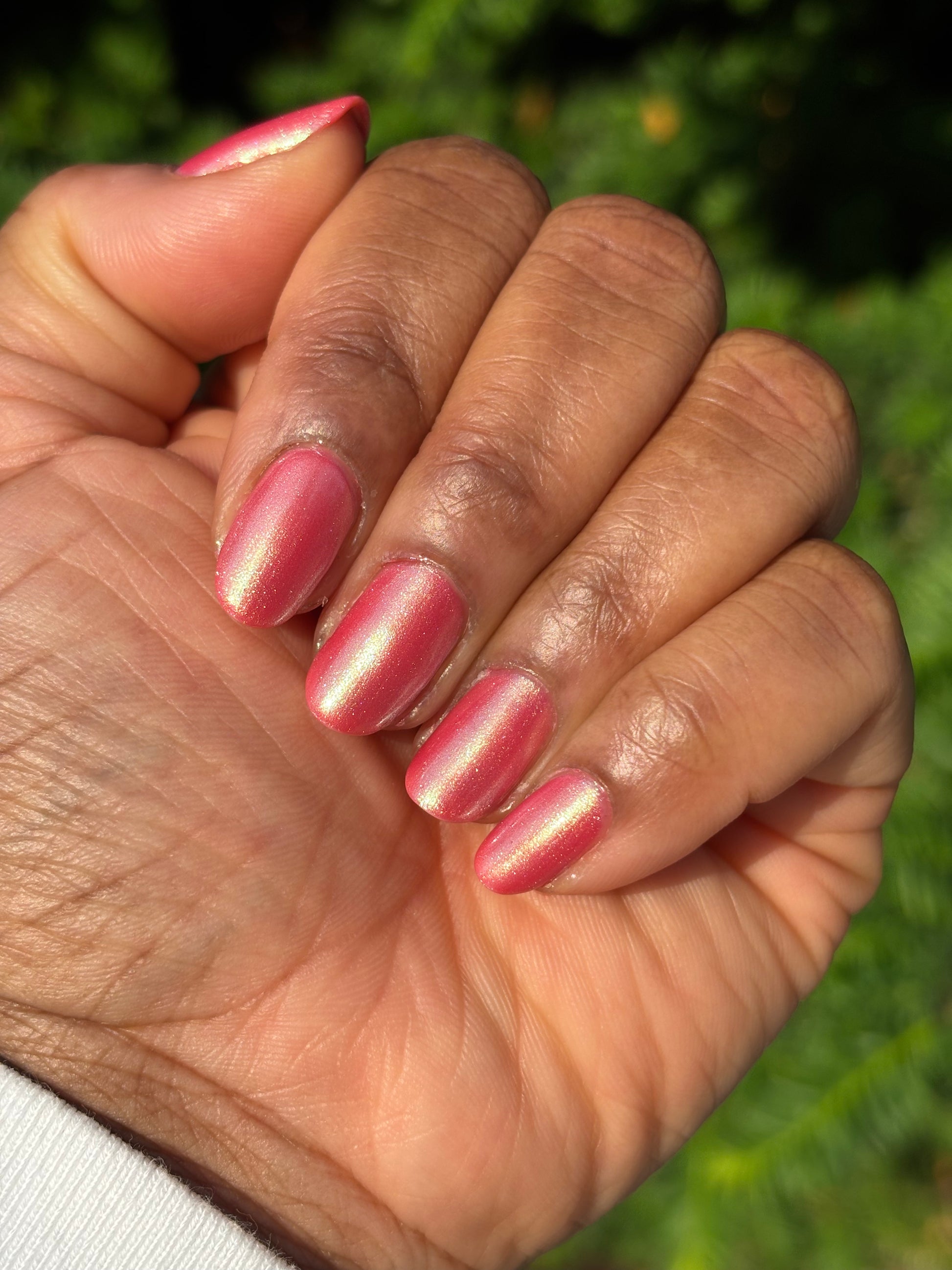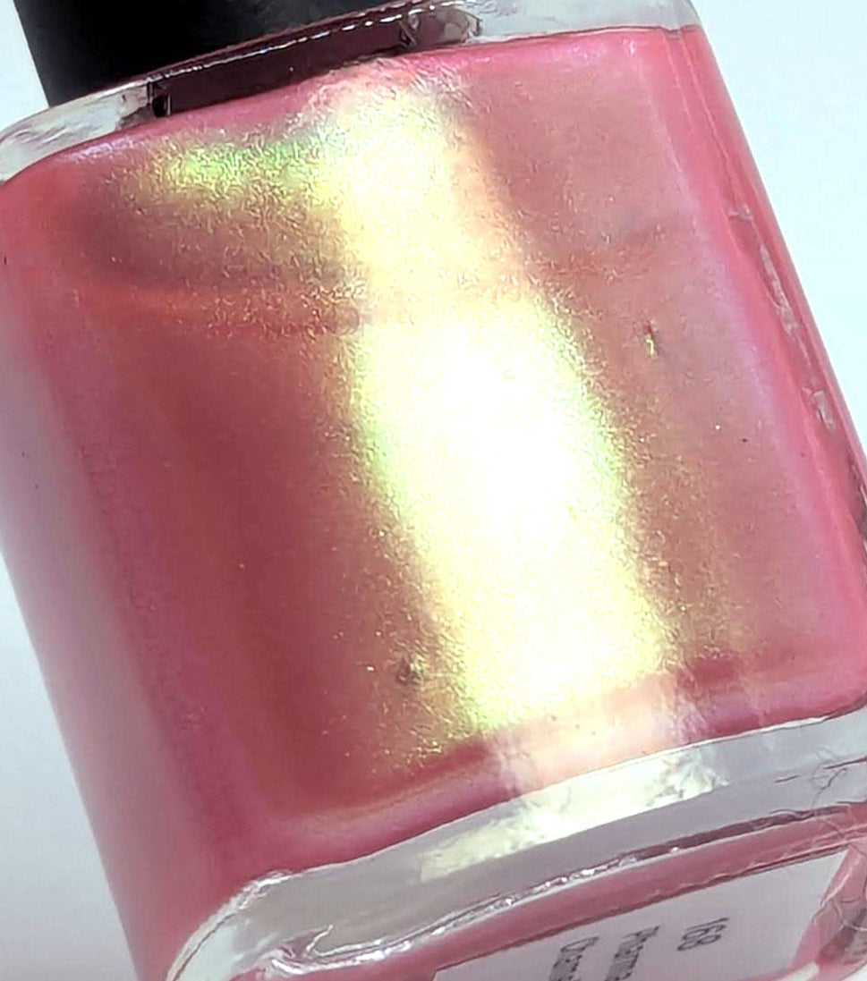 The iridescent properties of this primarily pink polish bring movement and shimmer in a complex yet simple fashion. You'll see a green shimmer in the right light and a soft golden glow pulling everything together. Even though this polish can be a single coat mani, the pink and green will continue to build as you add layers.