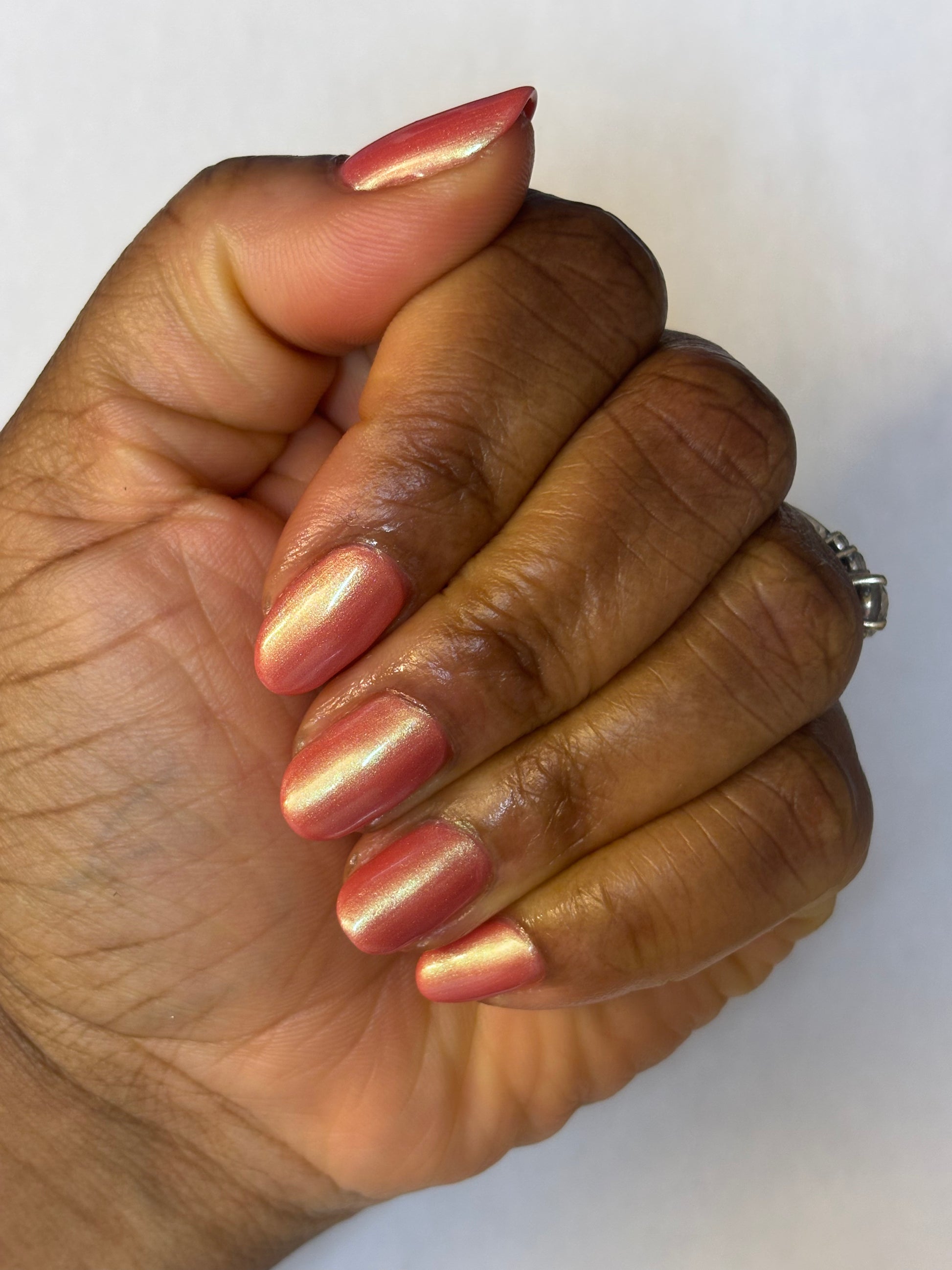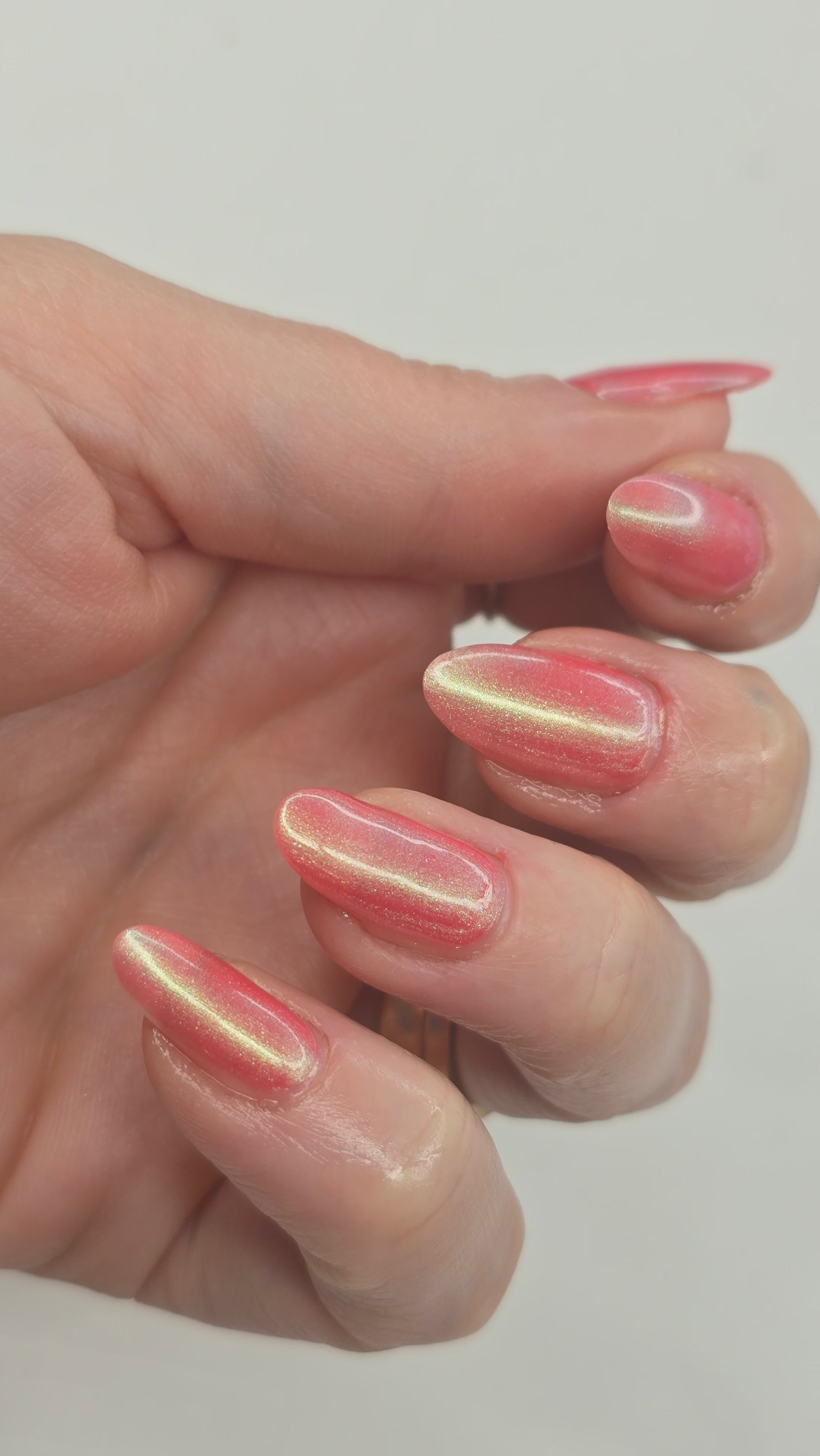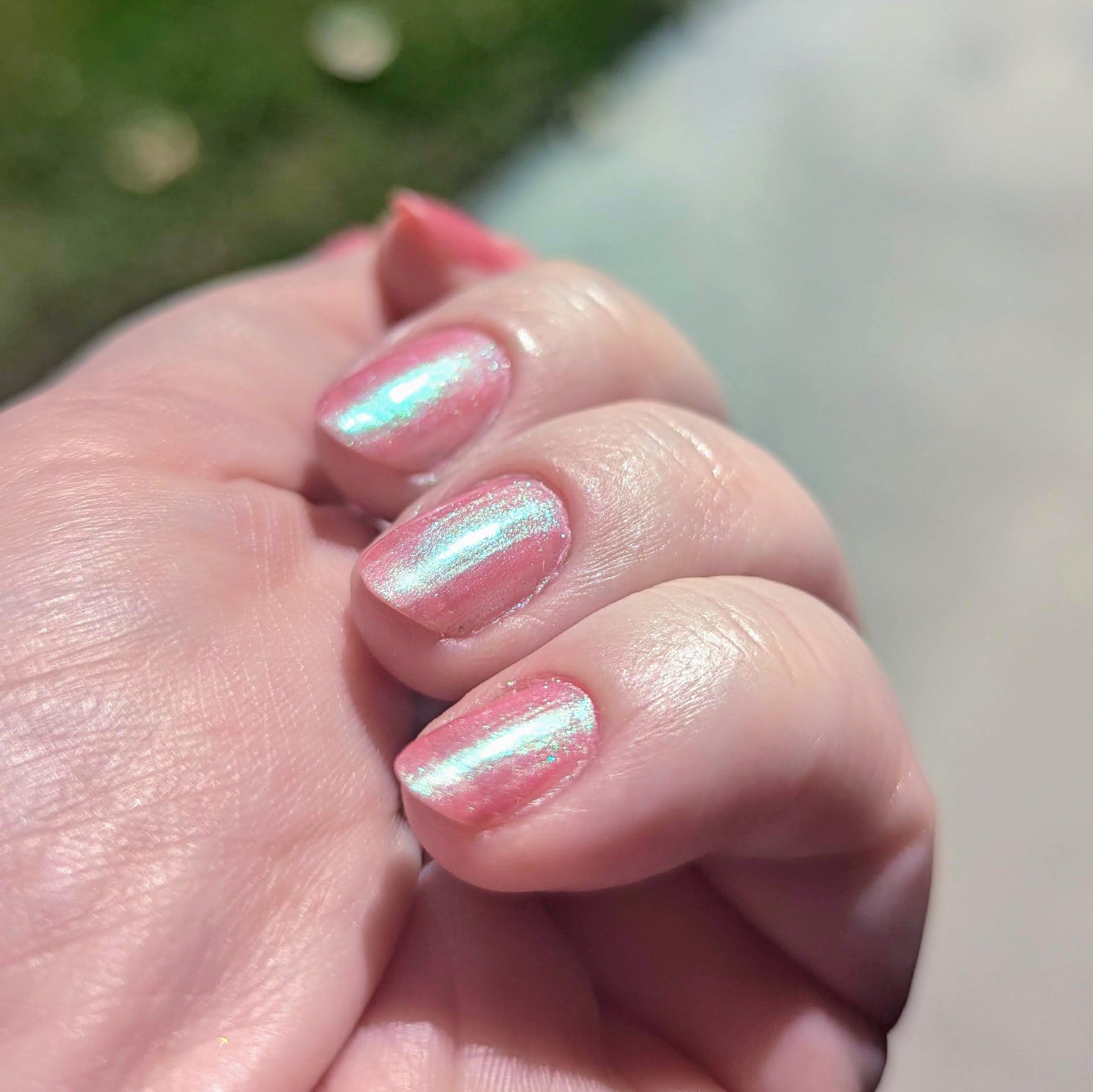 The iridescent properties of this primarily pink polish bring movement and shimmer in a complex yet simple fashion. You'll see a green shimmer in the right light and a soft golden glow pulling everything together. Even though this polish can be a single coat mani, the pink and green will continue to build as you add layers.