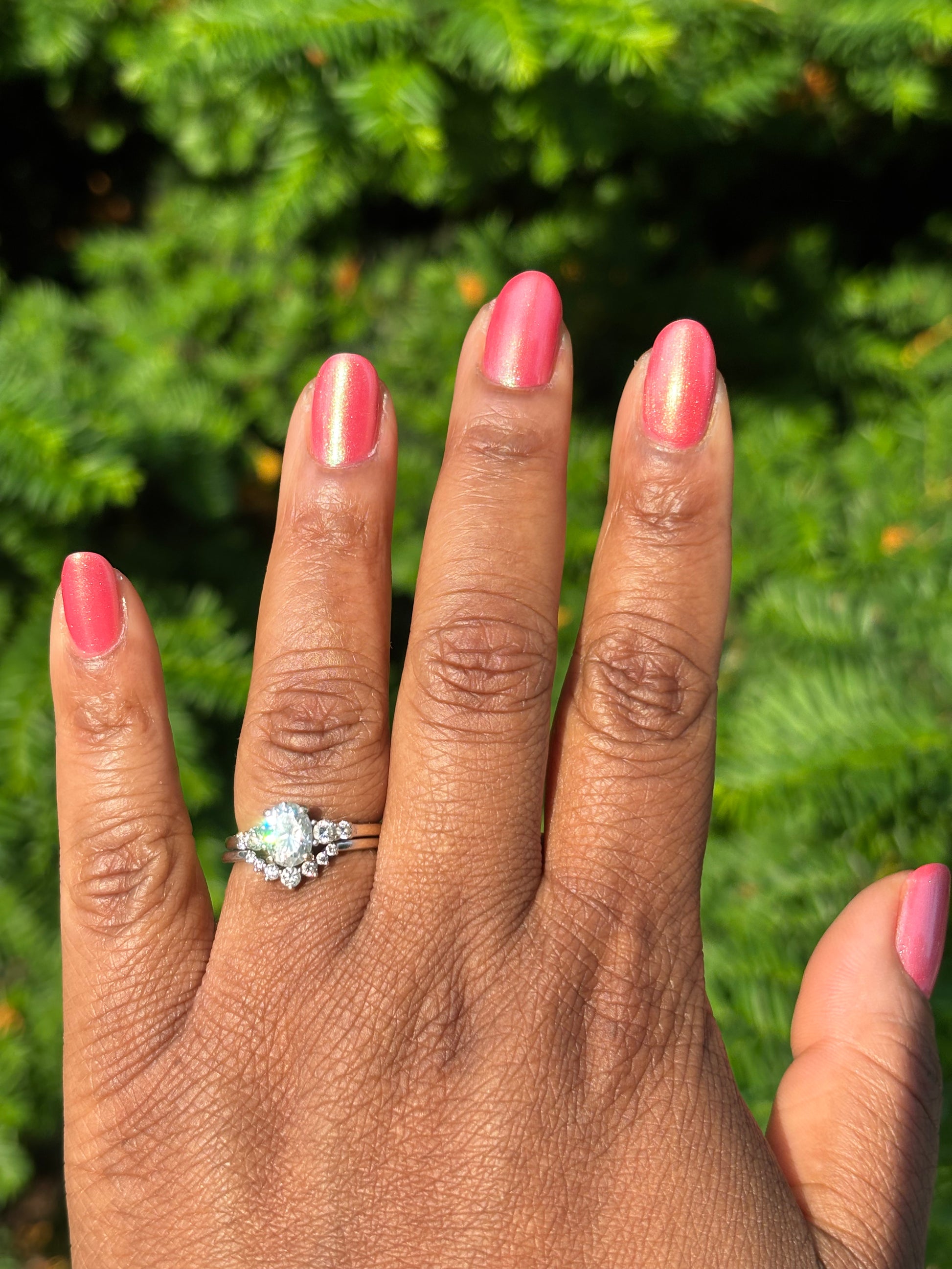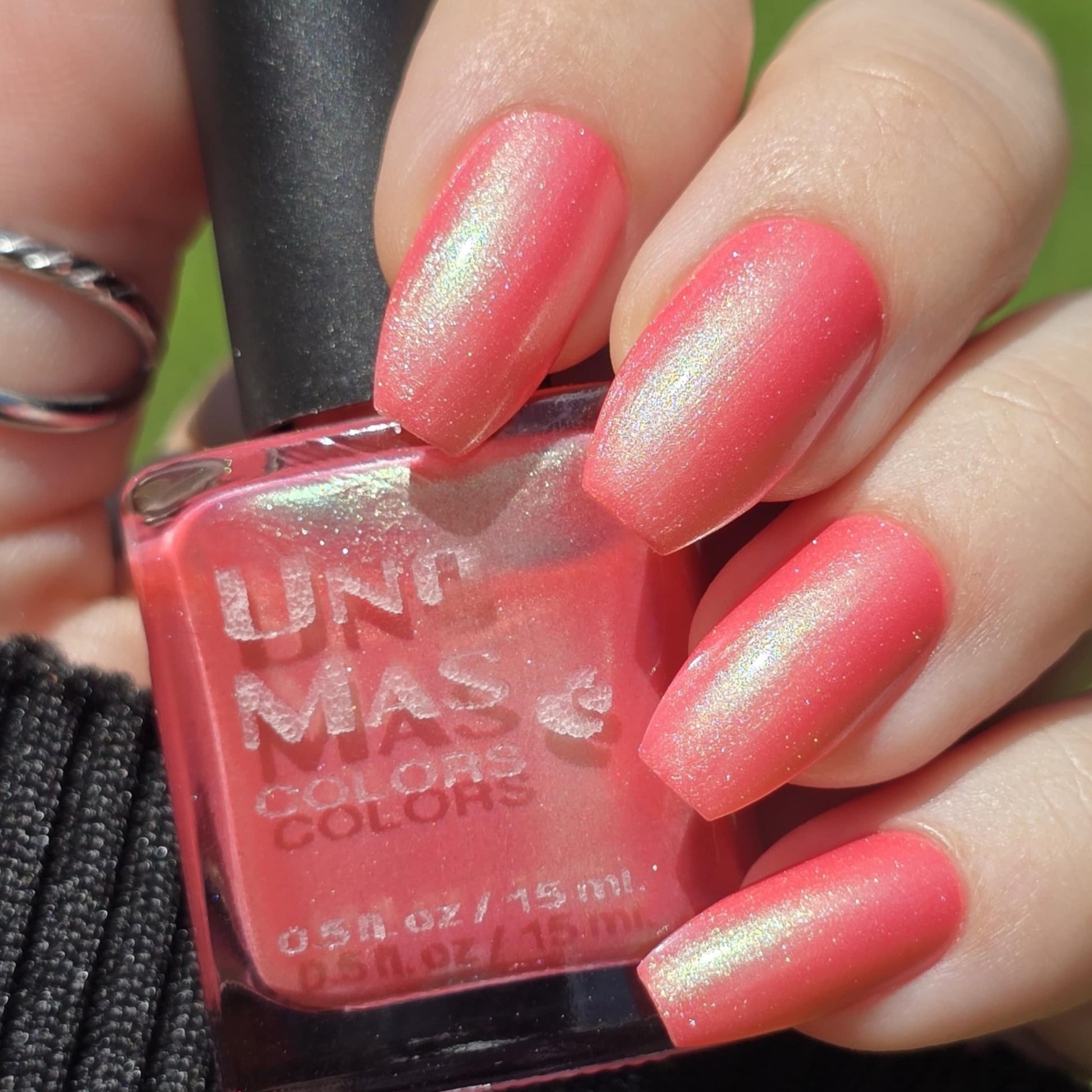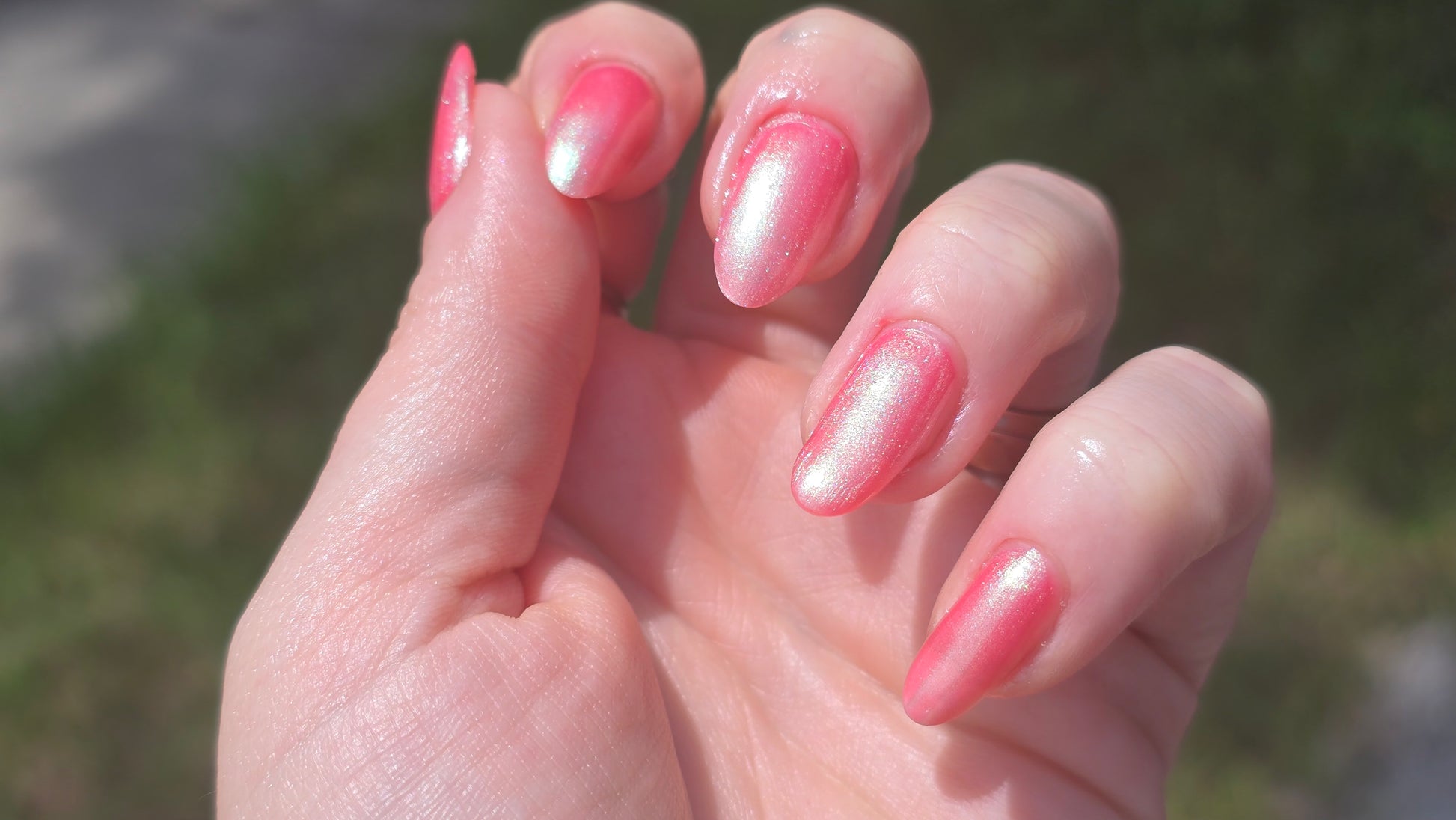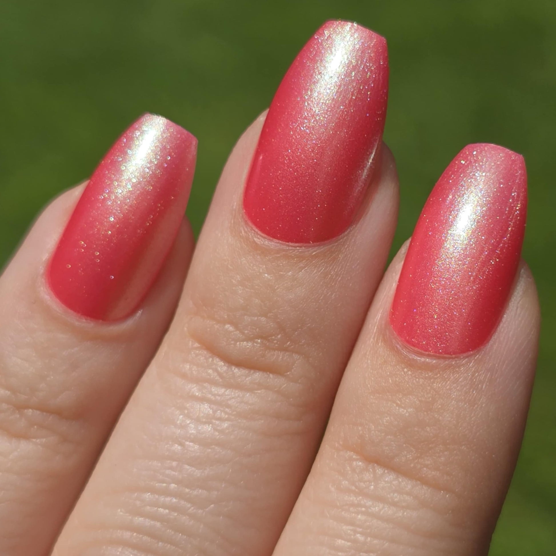 The iridescent properties of this primarily pink polish bring movement and shimmer in a complex yet simple fashion. You'll see a green shimmer in the right light and a soft golden glow pulling everything together. Even though this polish can be a single coat mani, the pink and green will continue to build as you add layers.