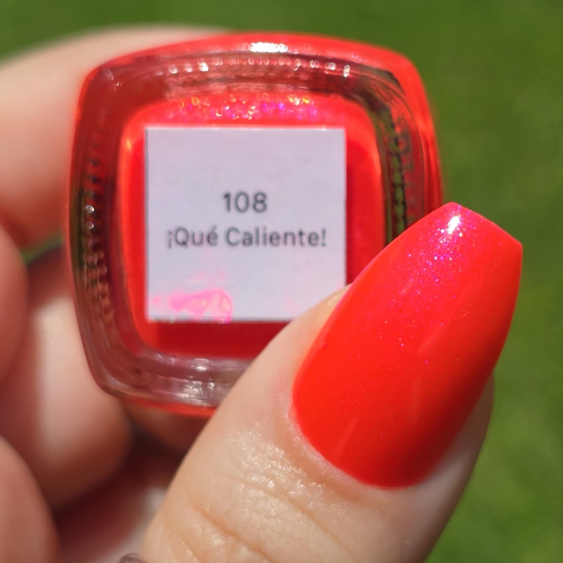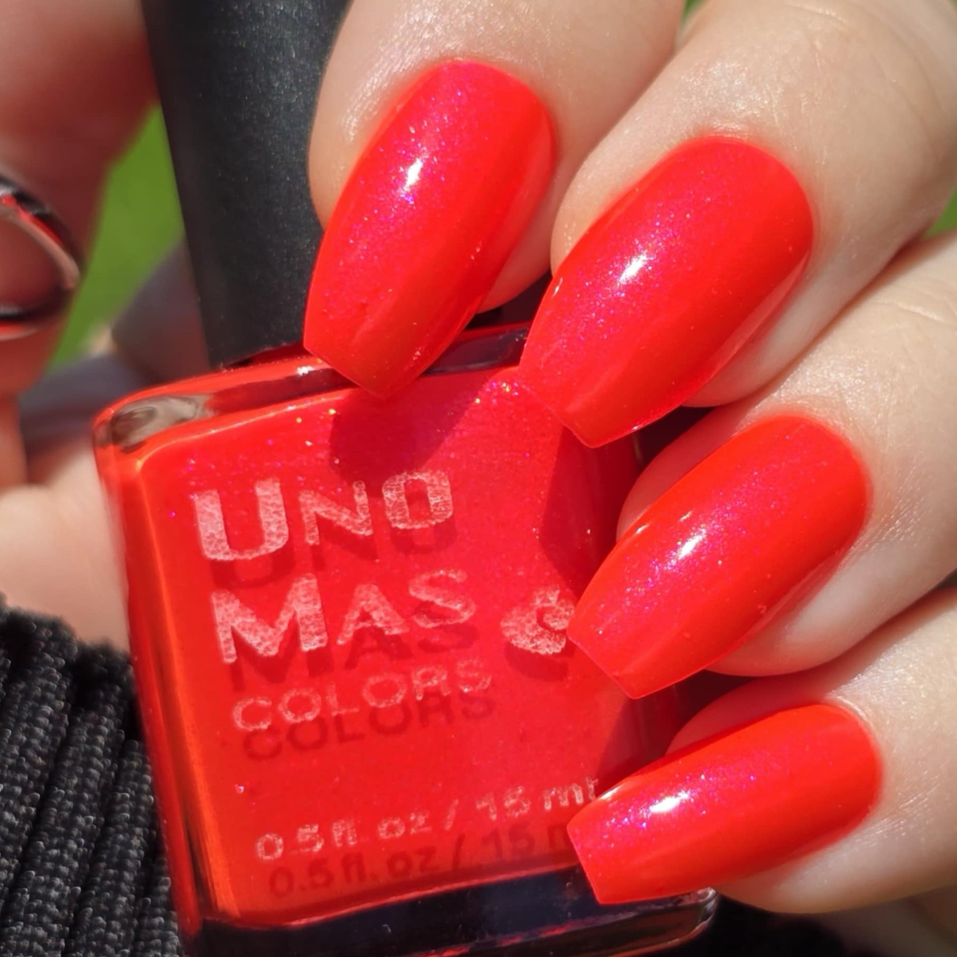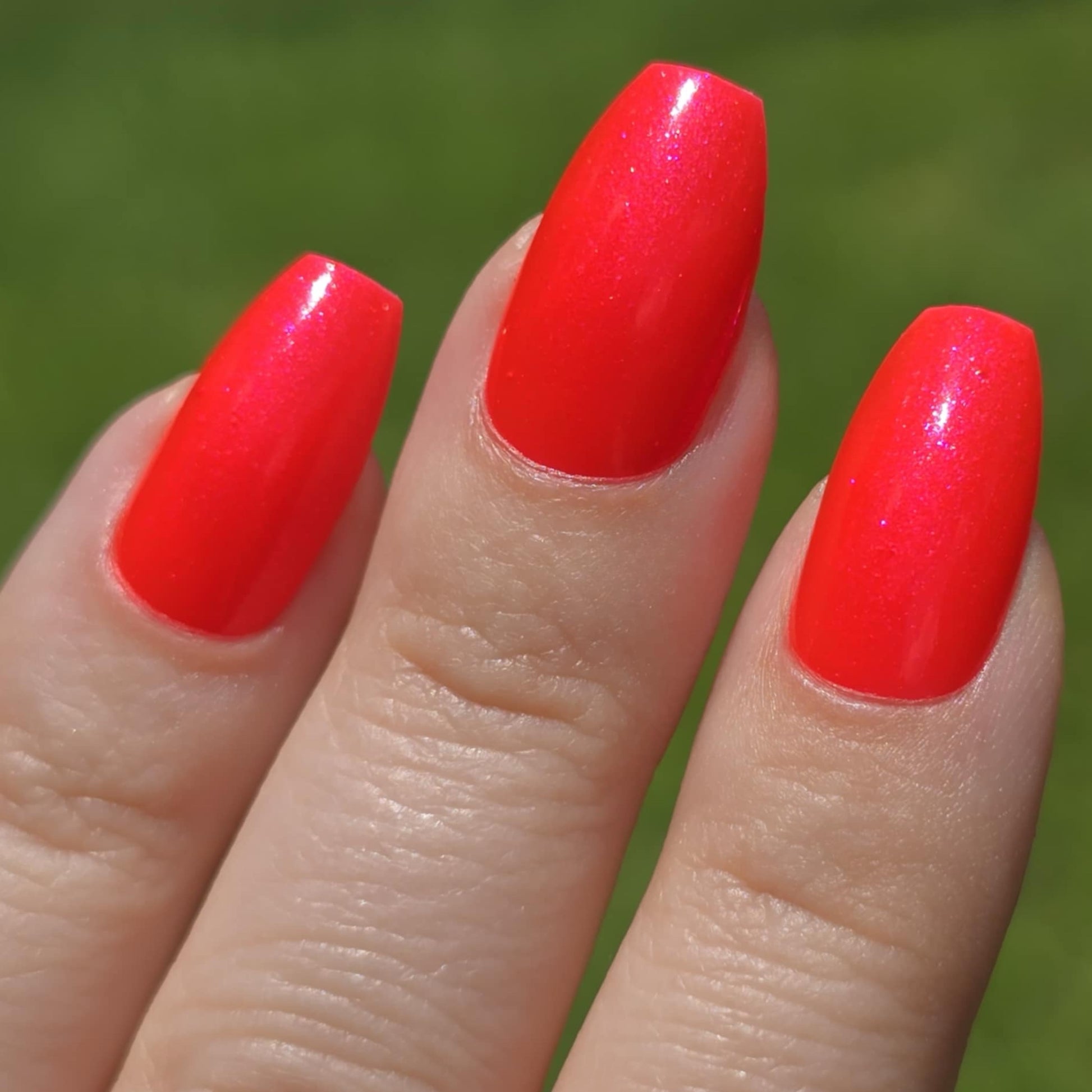 Bright neon red tones with a slight shimmer help this polish compliment any outfit for any occasion. Two to three thin coats should be applied for best results. Try a single coat over a dark base to see what combinations you can create!