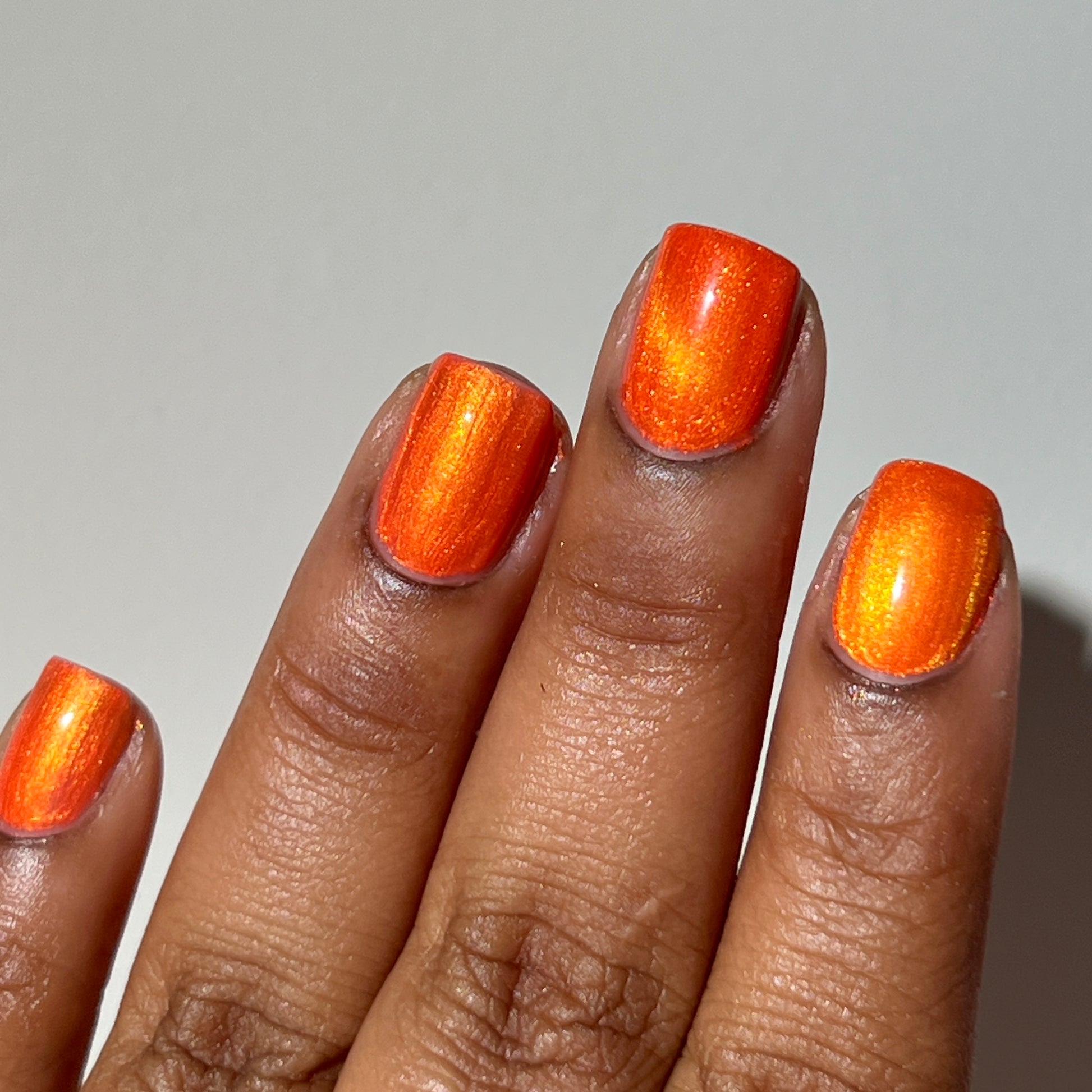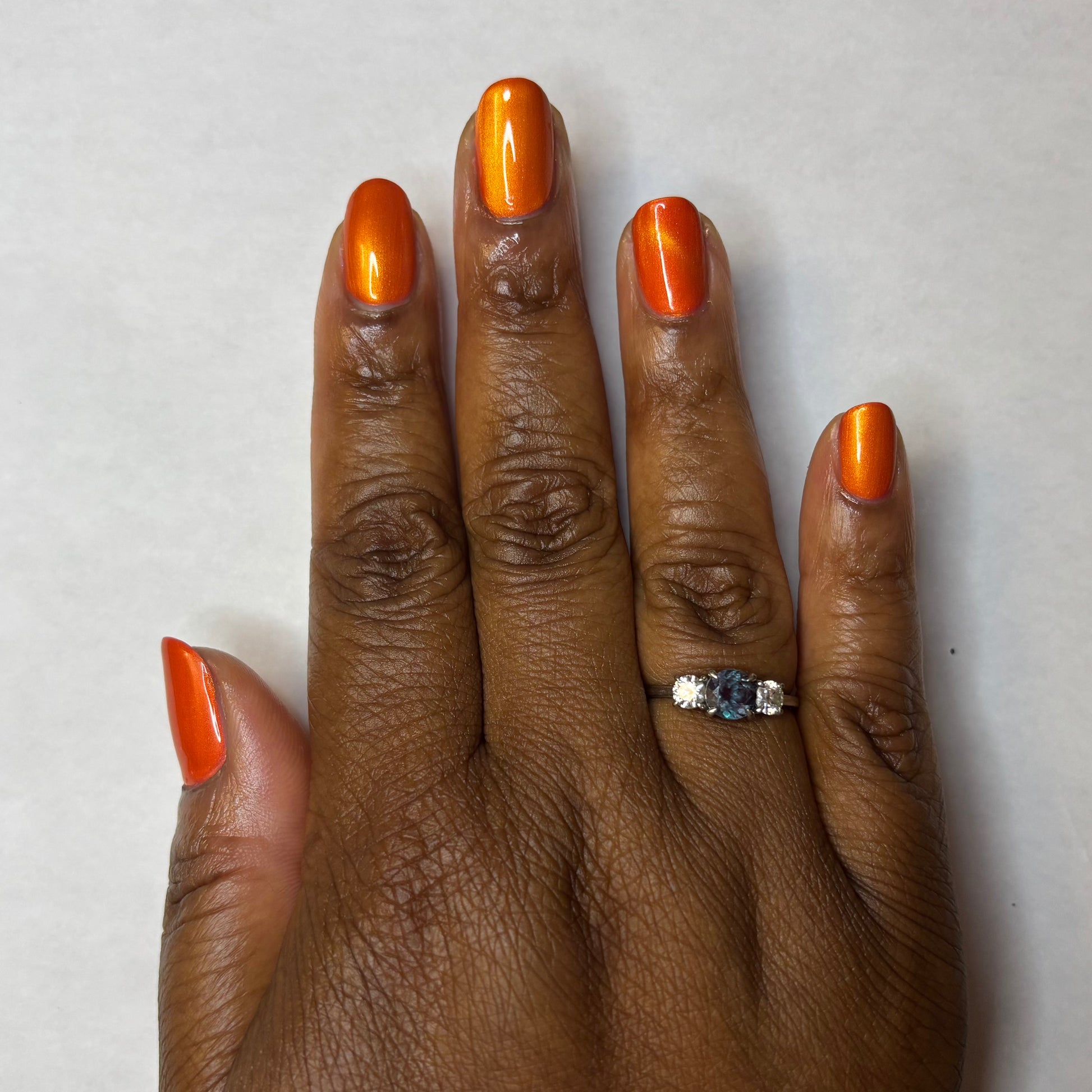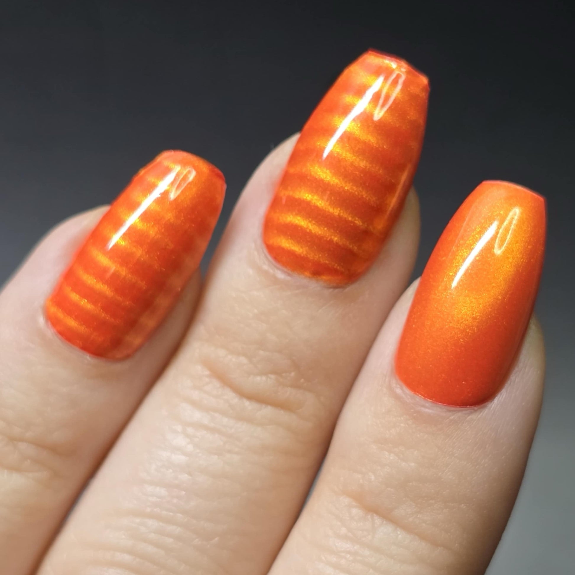 This magnetic beauty looks deceptively simple but is a perfect marriage of orange, yellow, and gold! It's developed to be worn either magnetized or not, depending on your preference and is opaque in 1 coat.