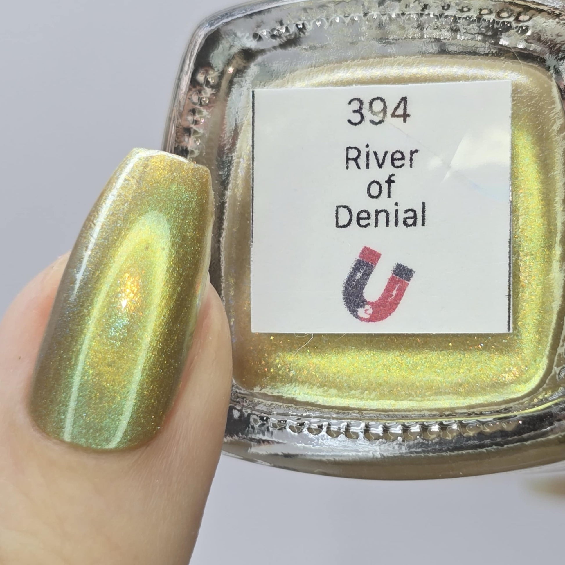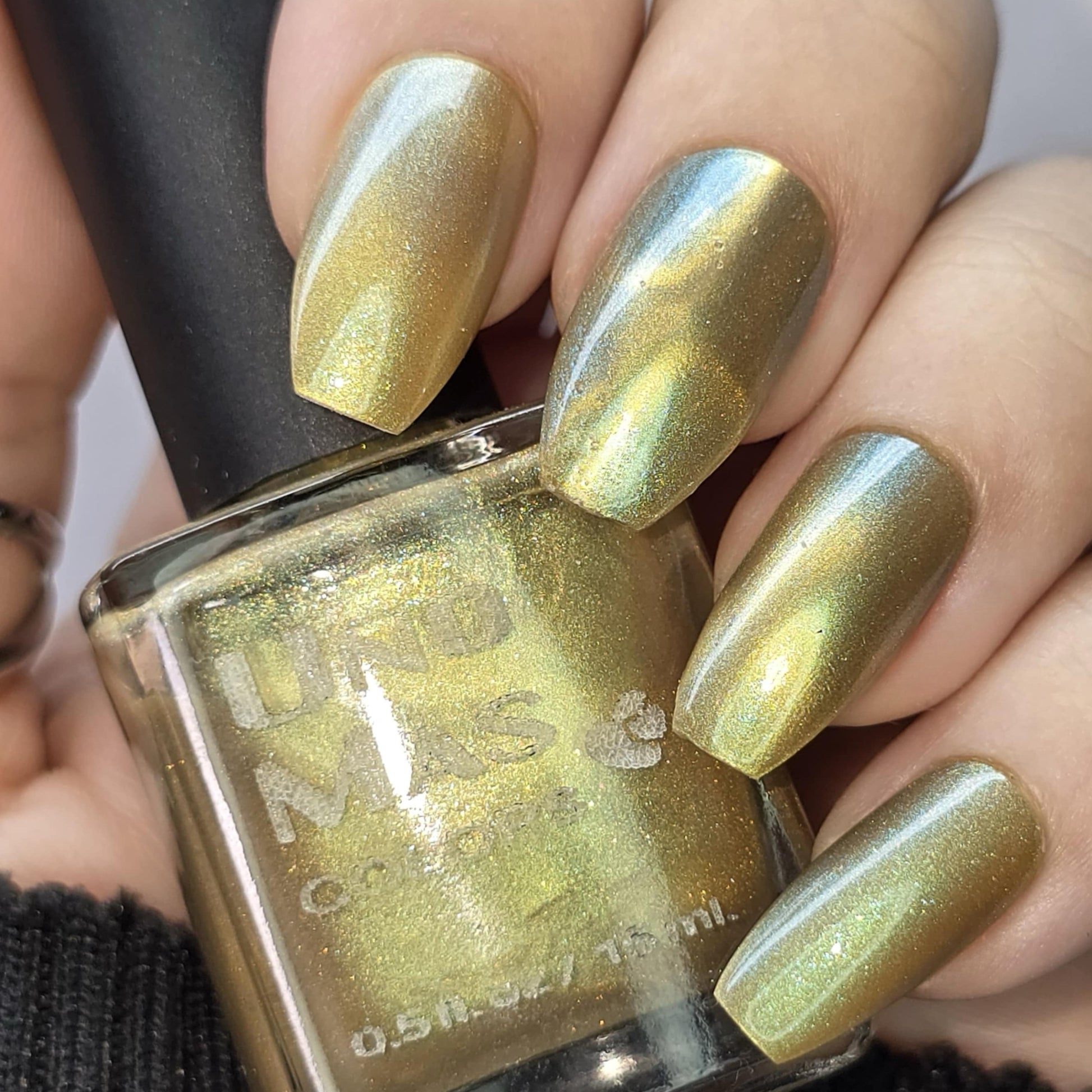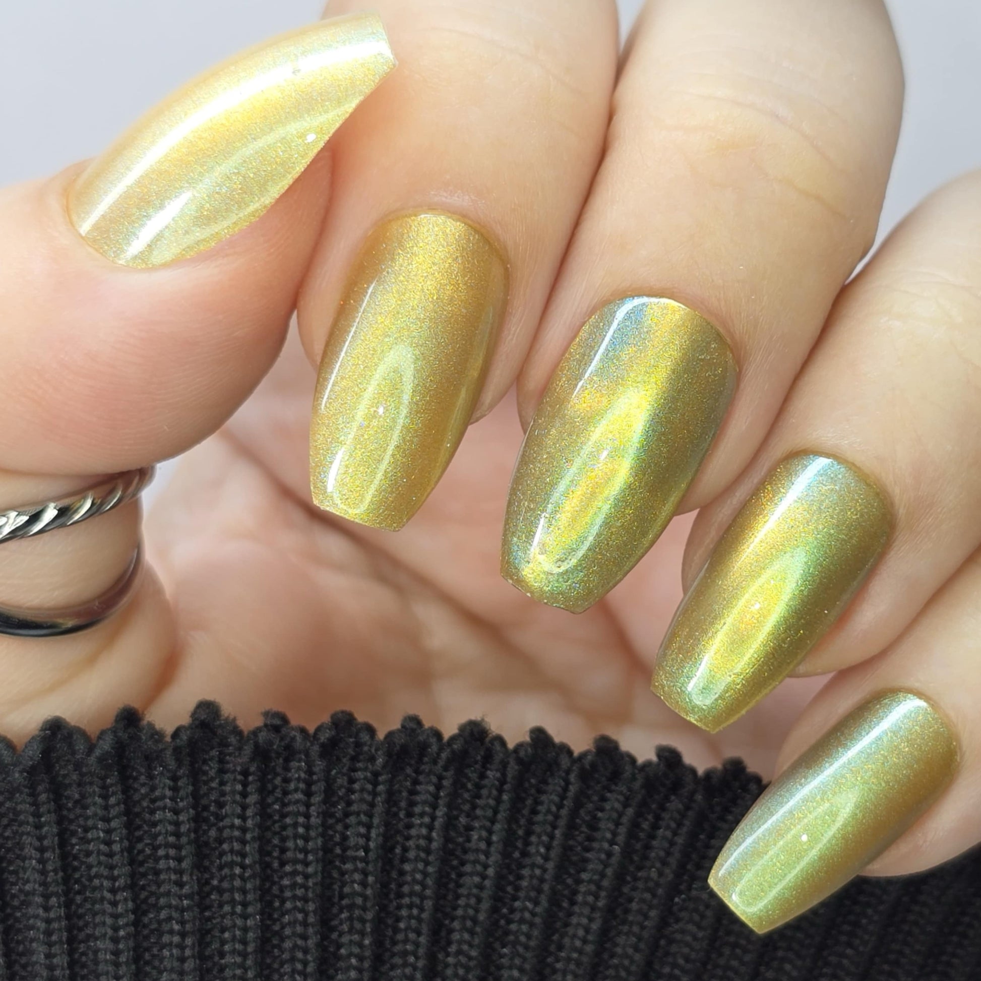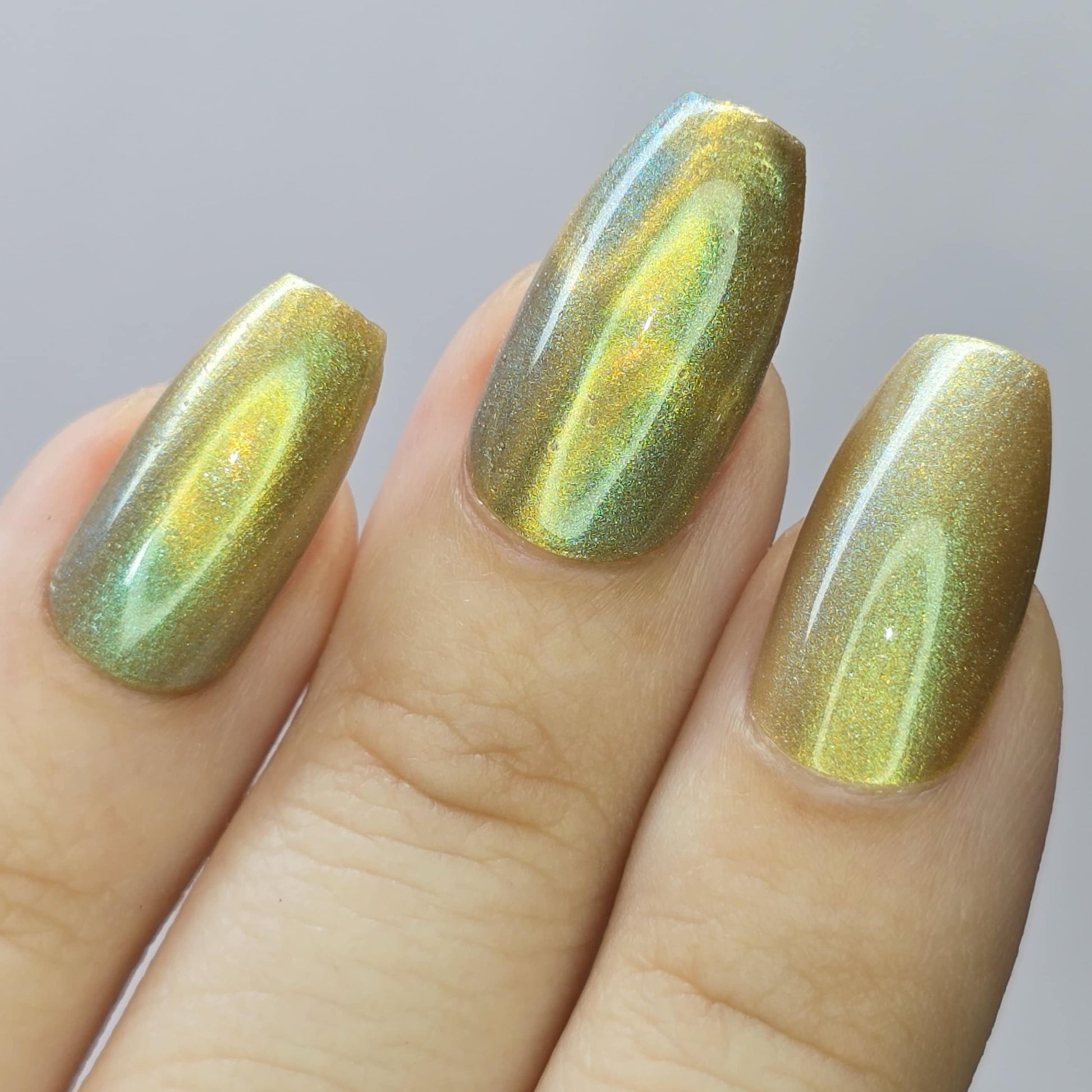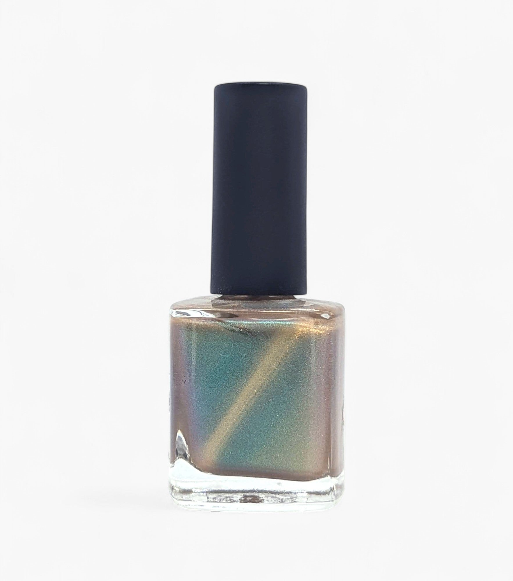 This is a magnetic polish with a gold magnetic component and a blue/green base surrounded by gold sparkles (think the Nile river and its bank). This bold magnetic looks amazing as a cat's eye but is simply mesmerizing as a velvet. Have fun with this one and let us know what technique you like best!