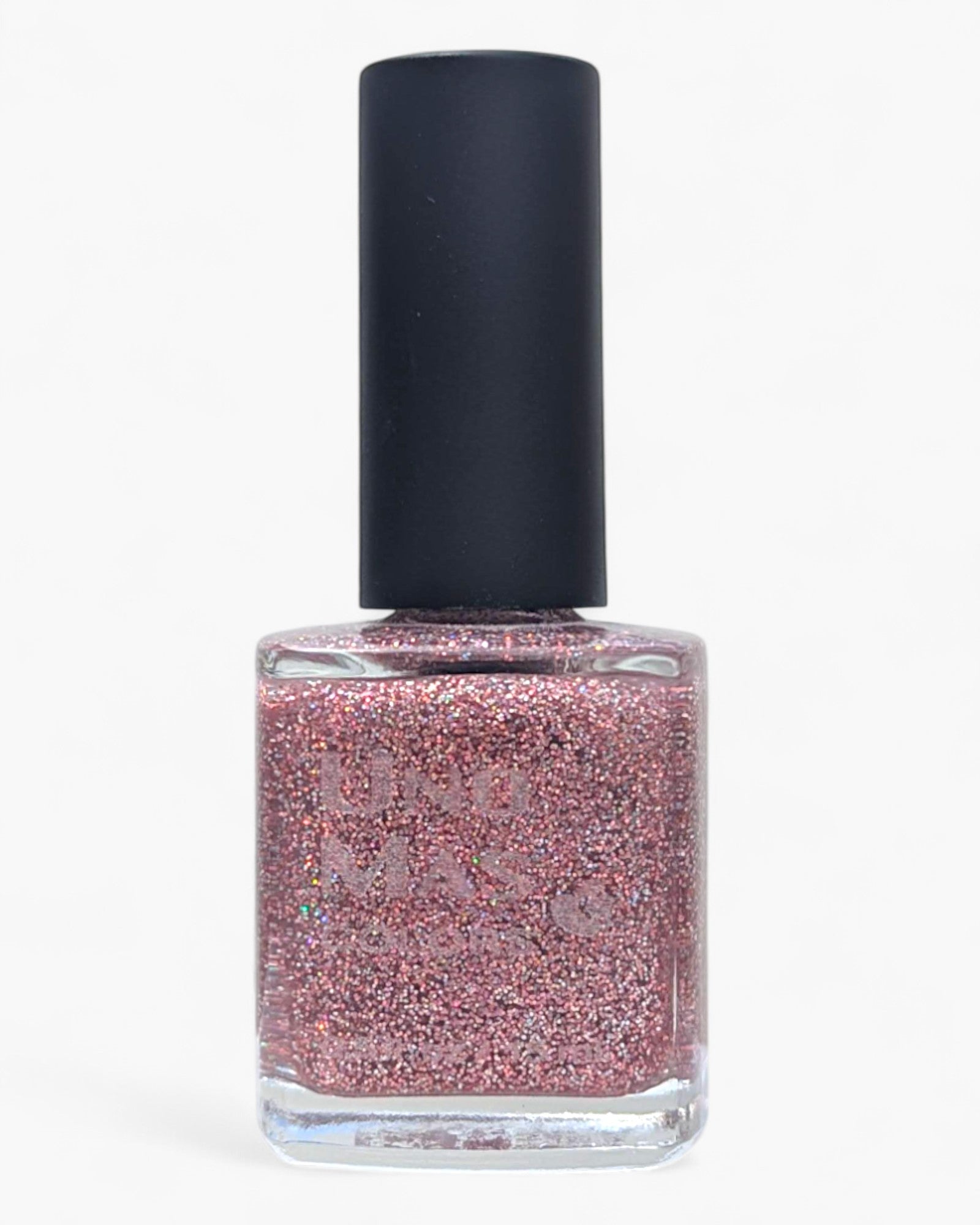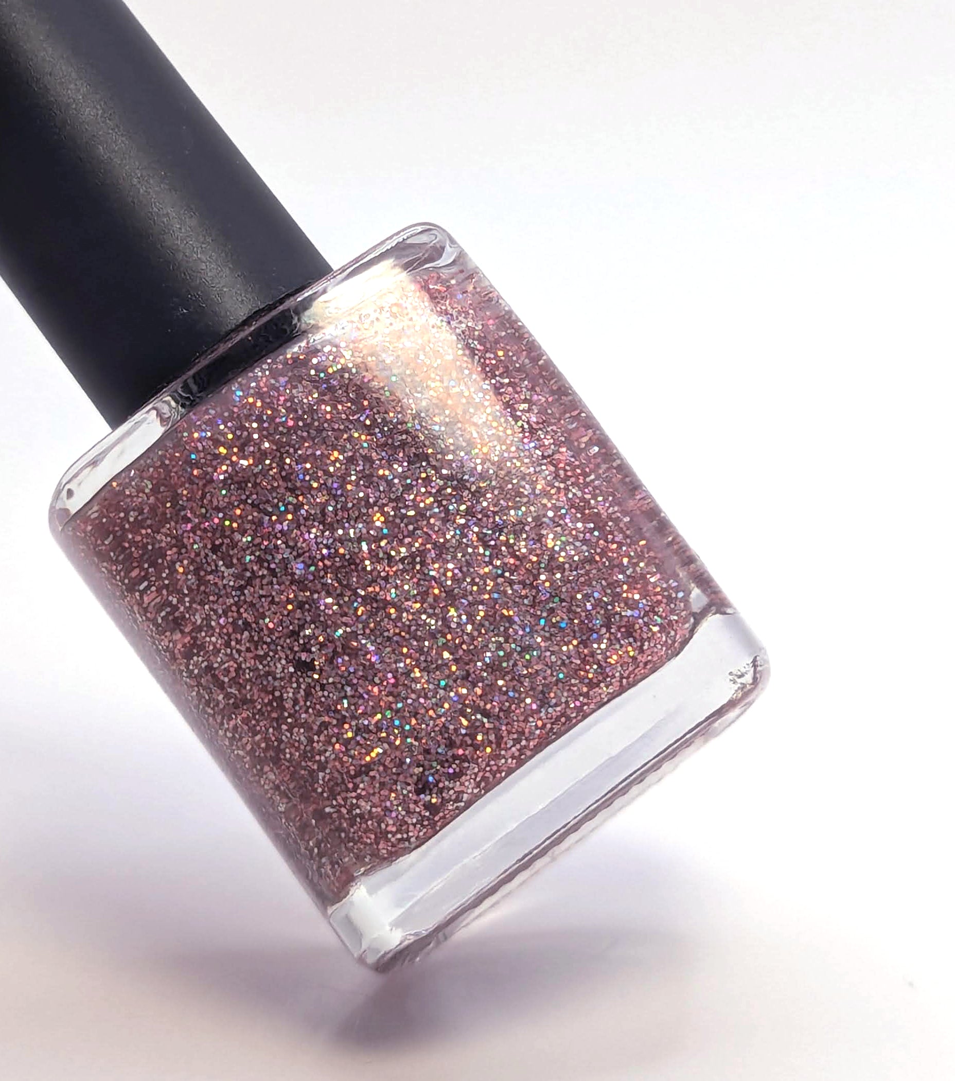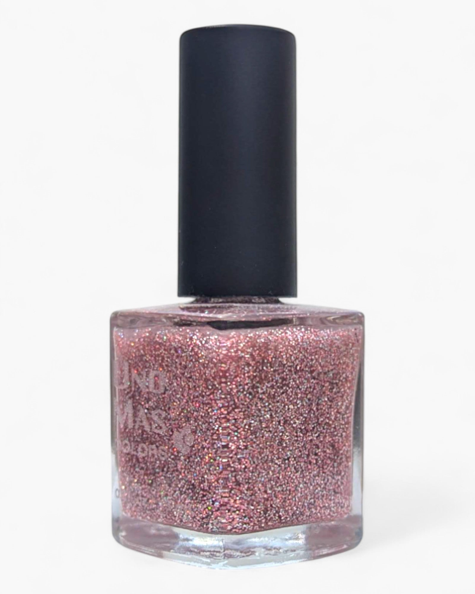 A soft pink creates the base of this nail polish, and the holographic glitter brings a bright contrast to the overall tones. We suggest a minimum of two coats to get the best coverage. Try using this above a white base coat to lighten the overall polish and cause more movement.