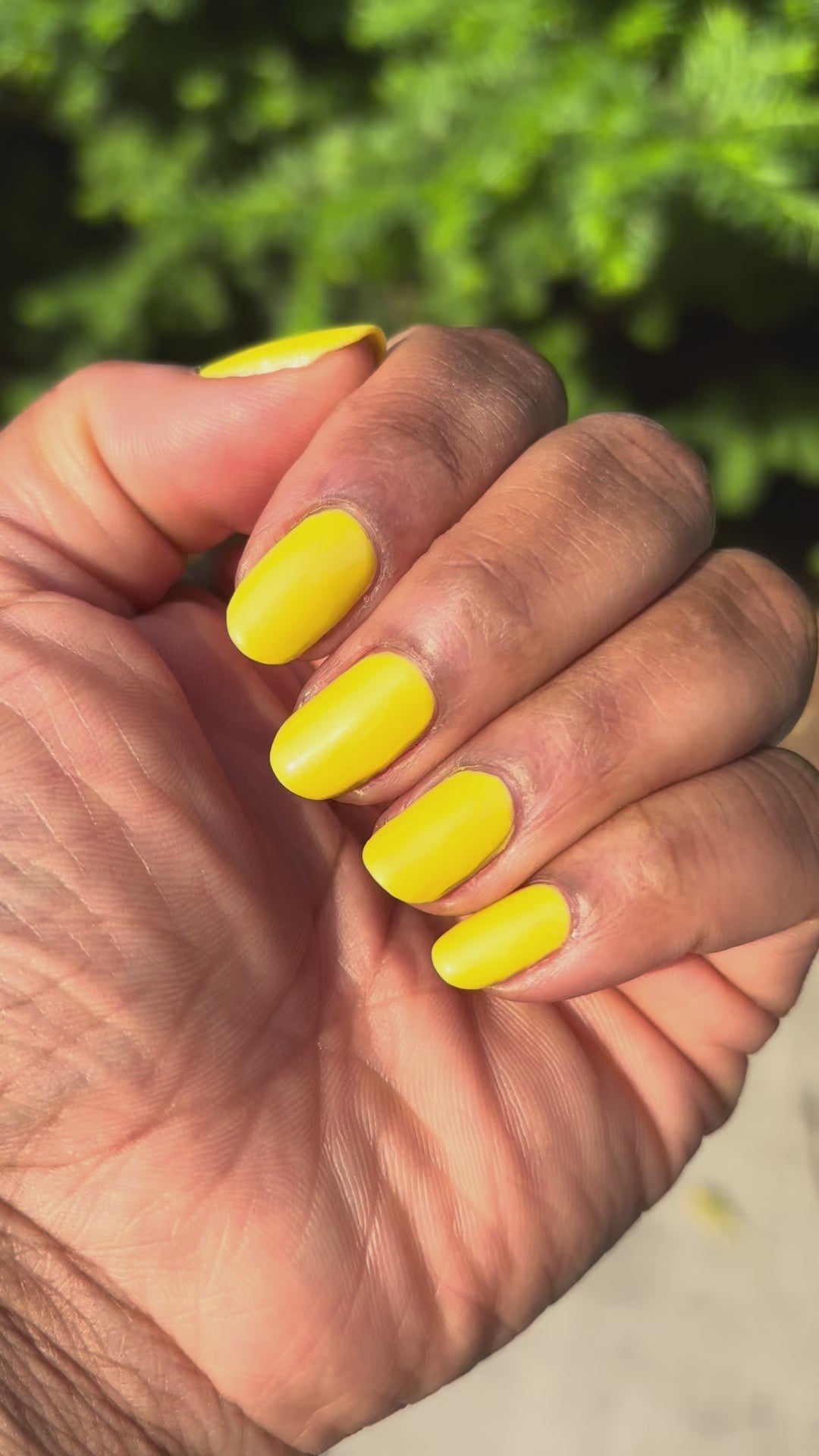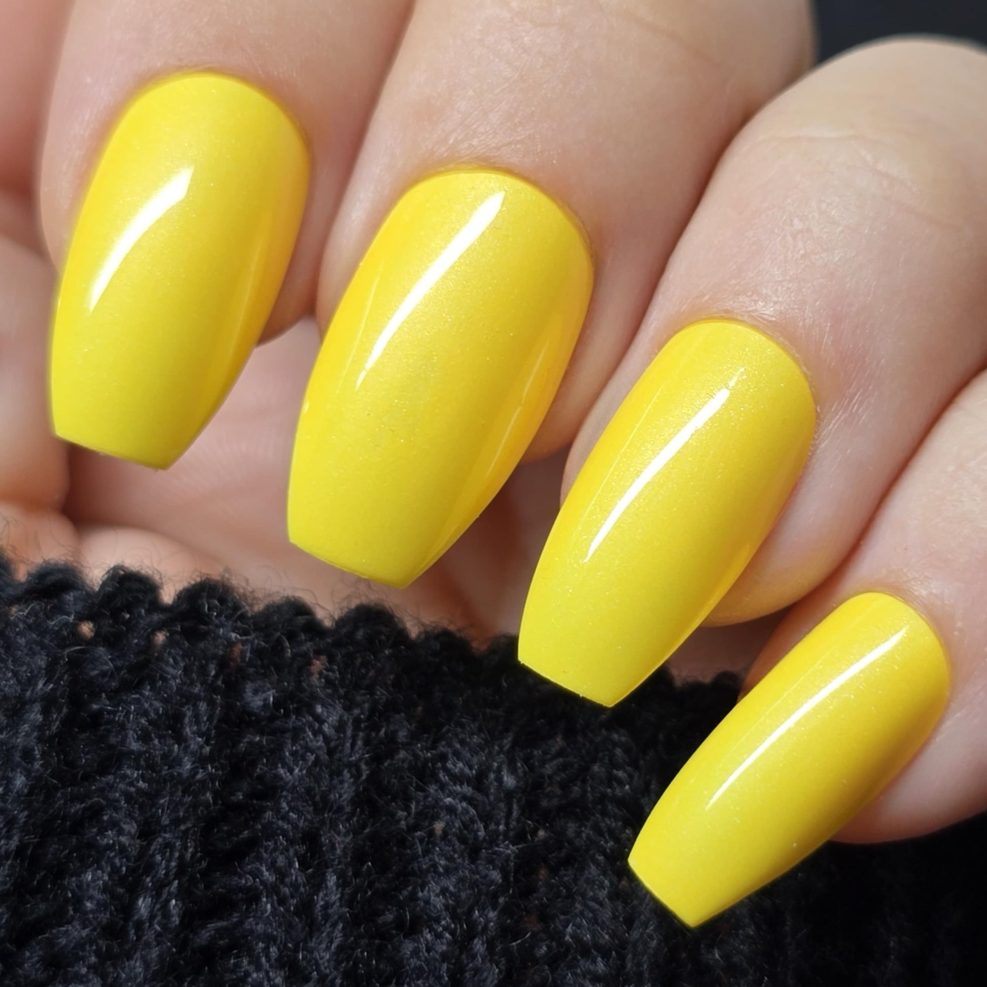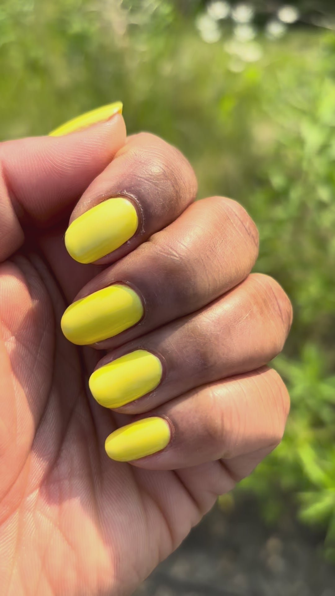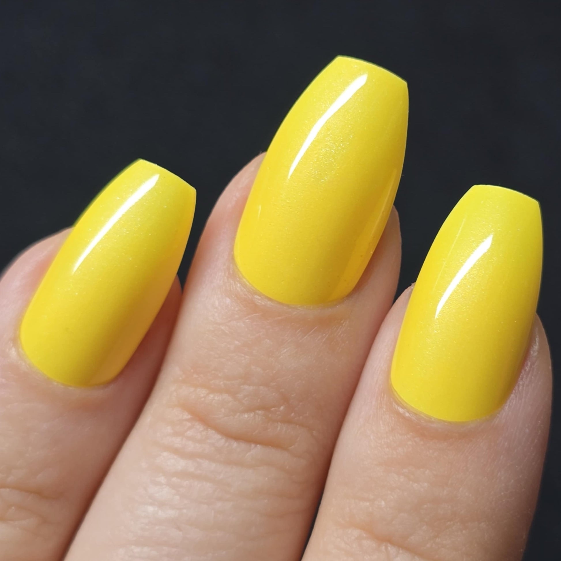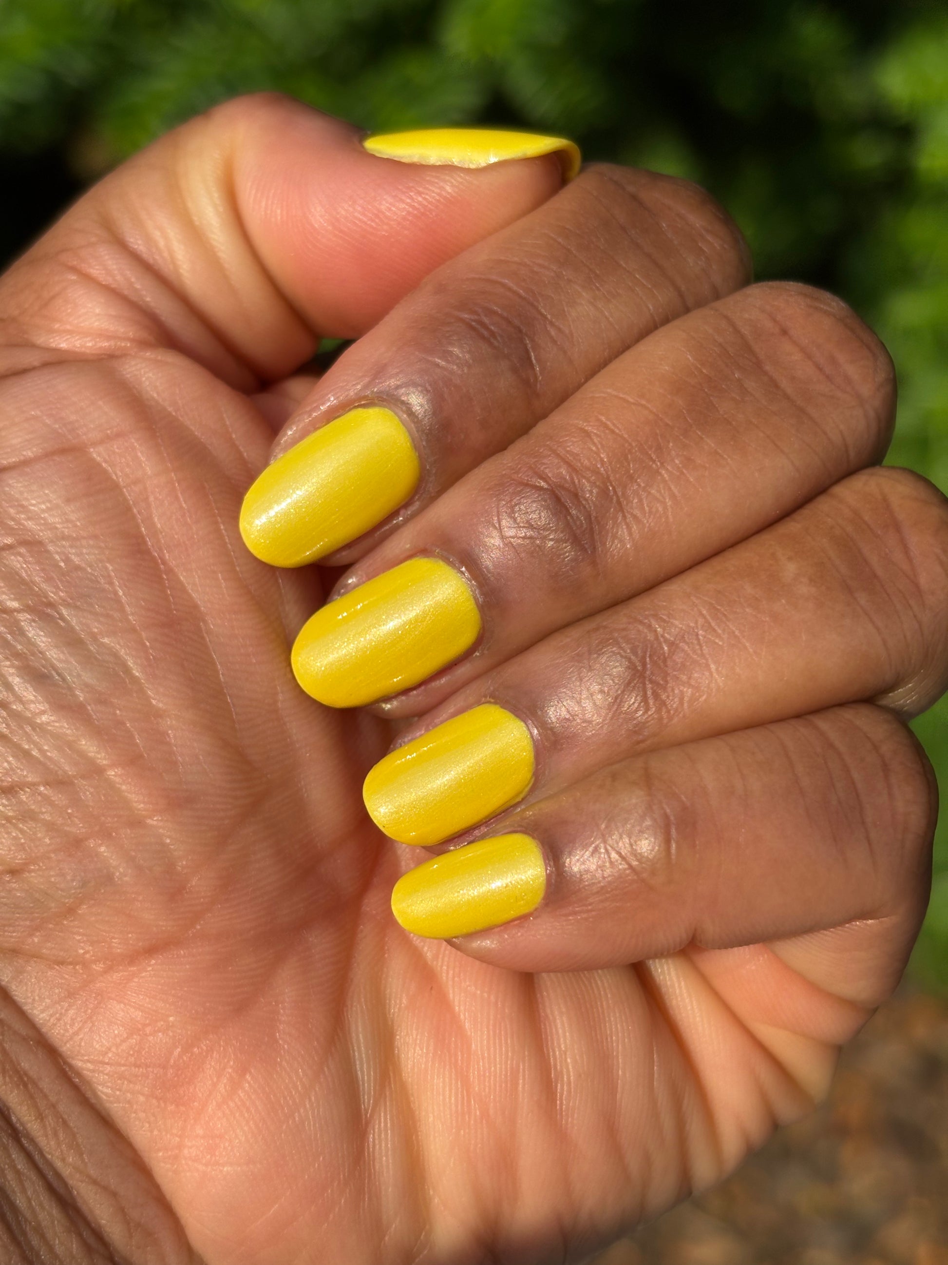 This vibrant yellow polish shines with a nice yellow shimmer that gives a soft glow in natural light. While a single coat will give a gentle wash of color, two to three coats will bring the full body tones of the color in this polish. Please try various applications to find your favorite way to express your imagination!