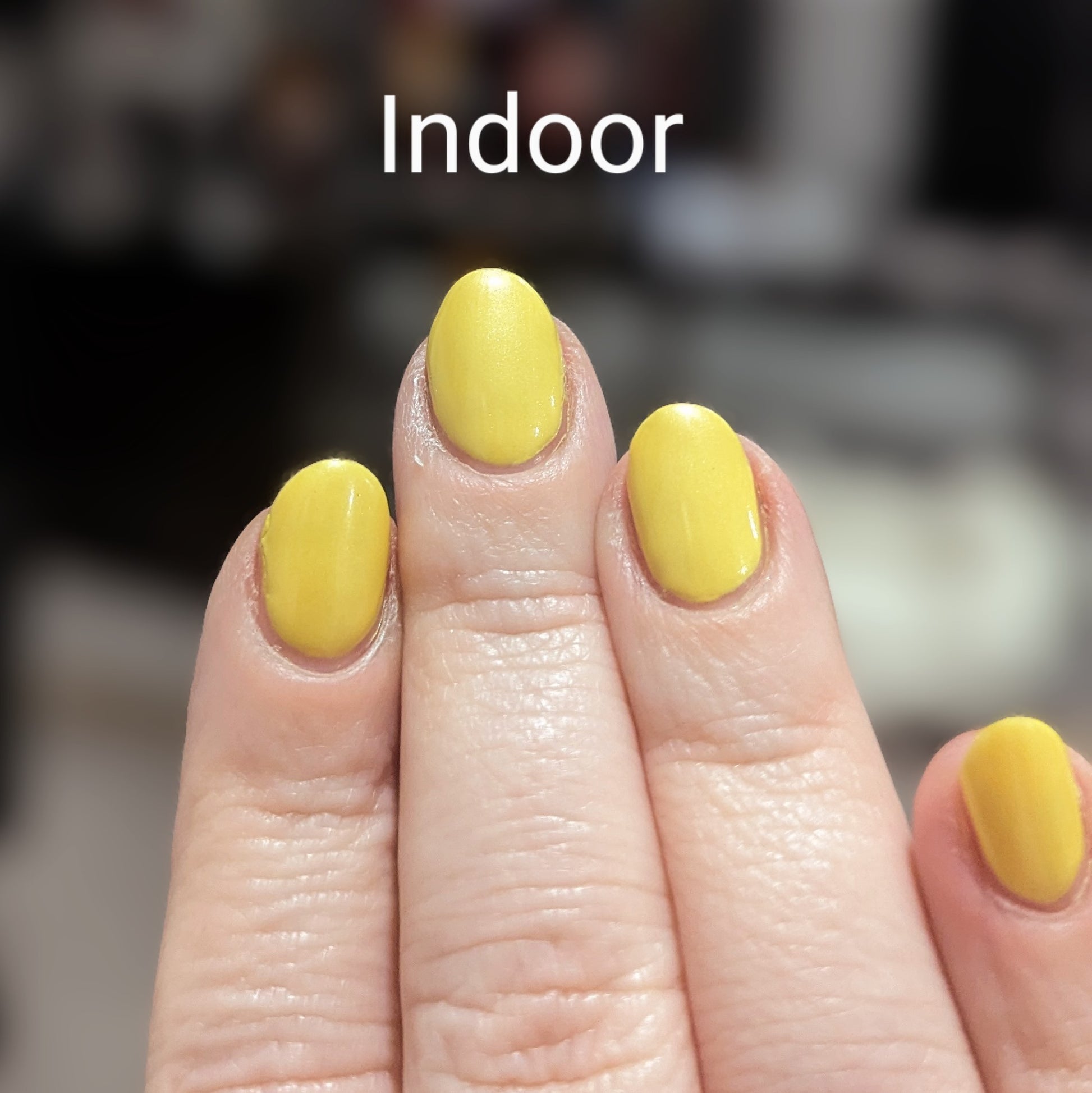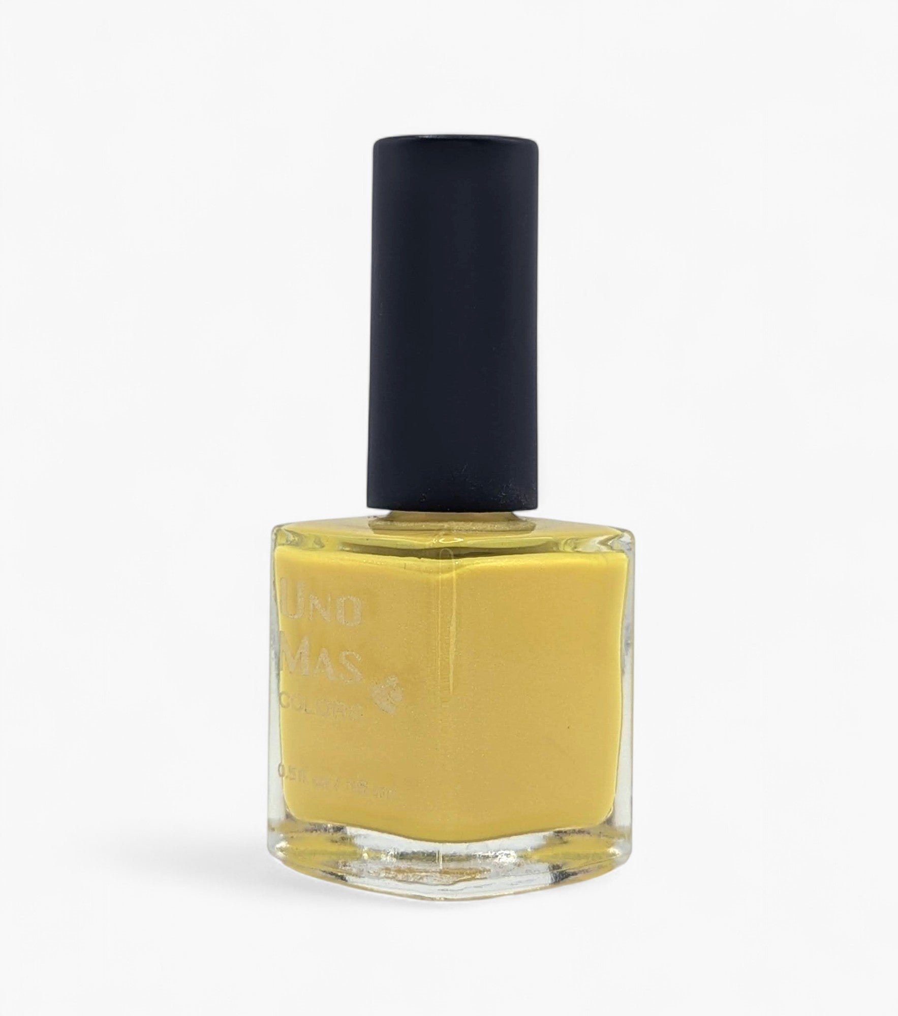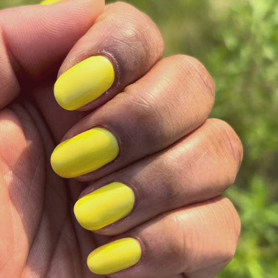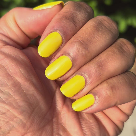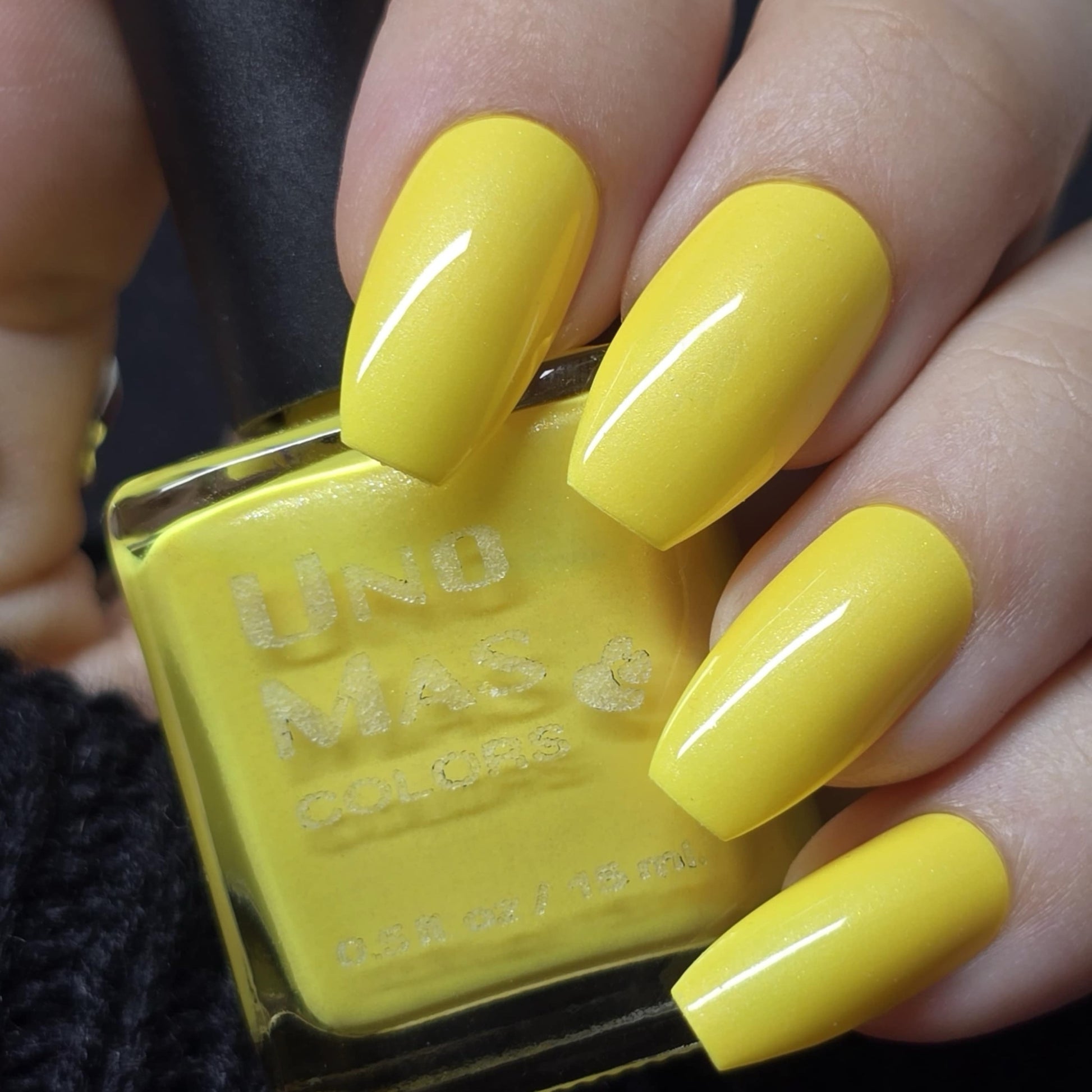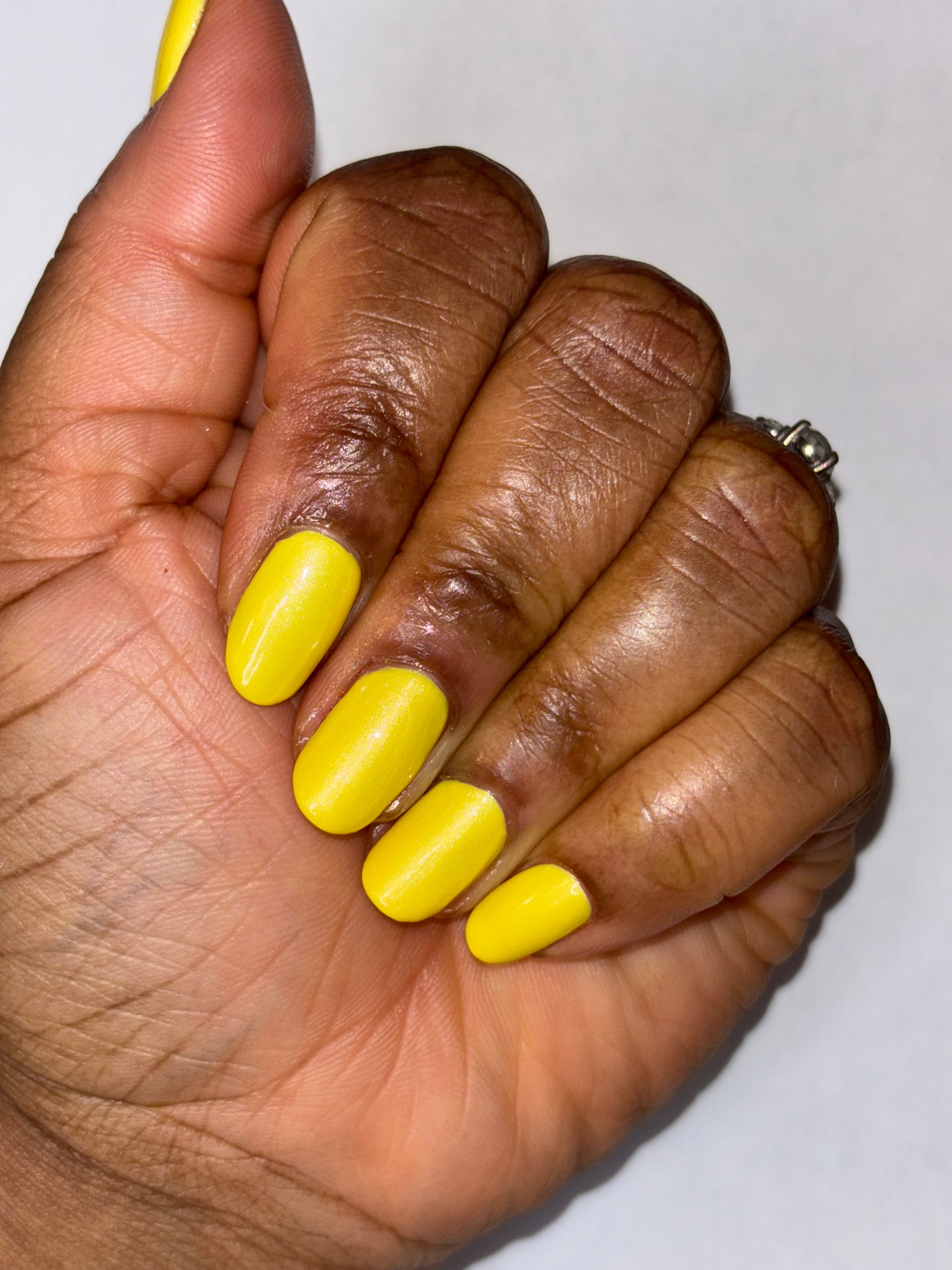 This vibrant yellow polish shines with a nice yellow shimmer that gives a soft glow in natural light. While a single coat will give a gentle wash of color, two to three coats will bring the full body tones of the color in this polish. Please try various applications to find your favorite way to express your imagination!