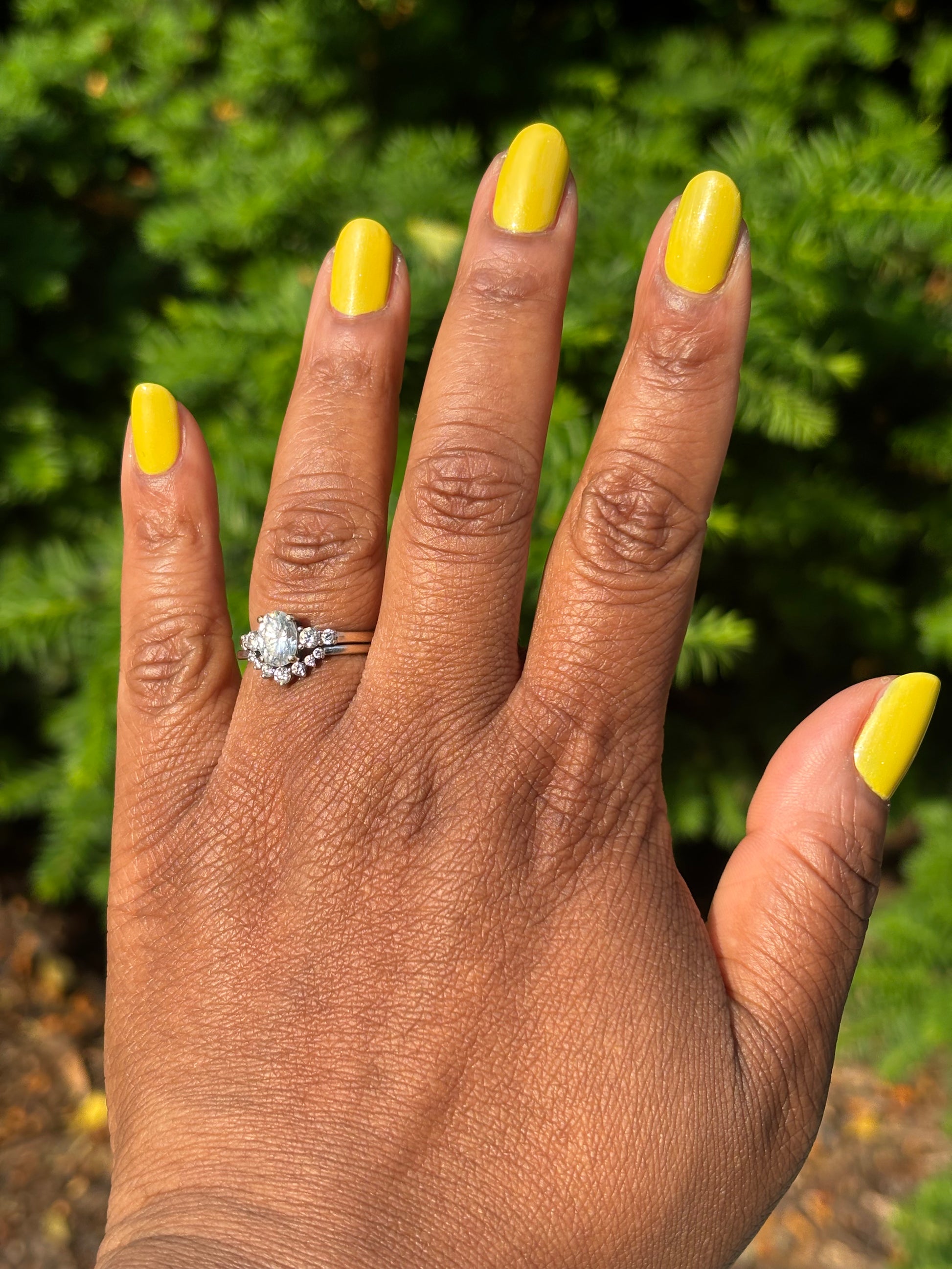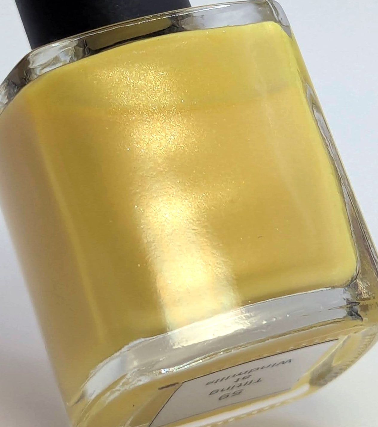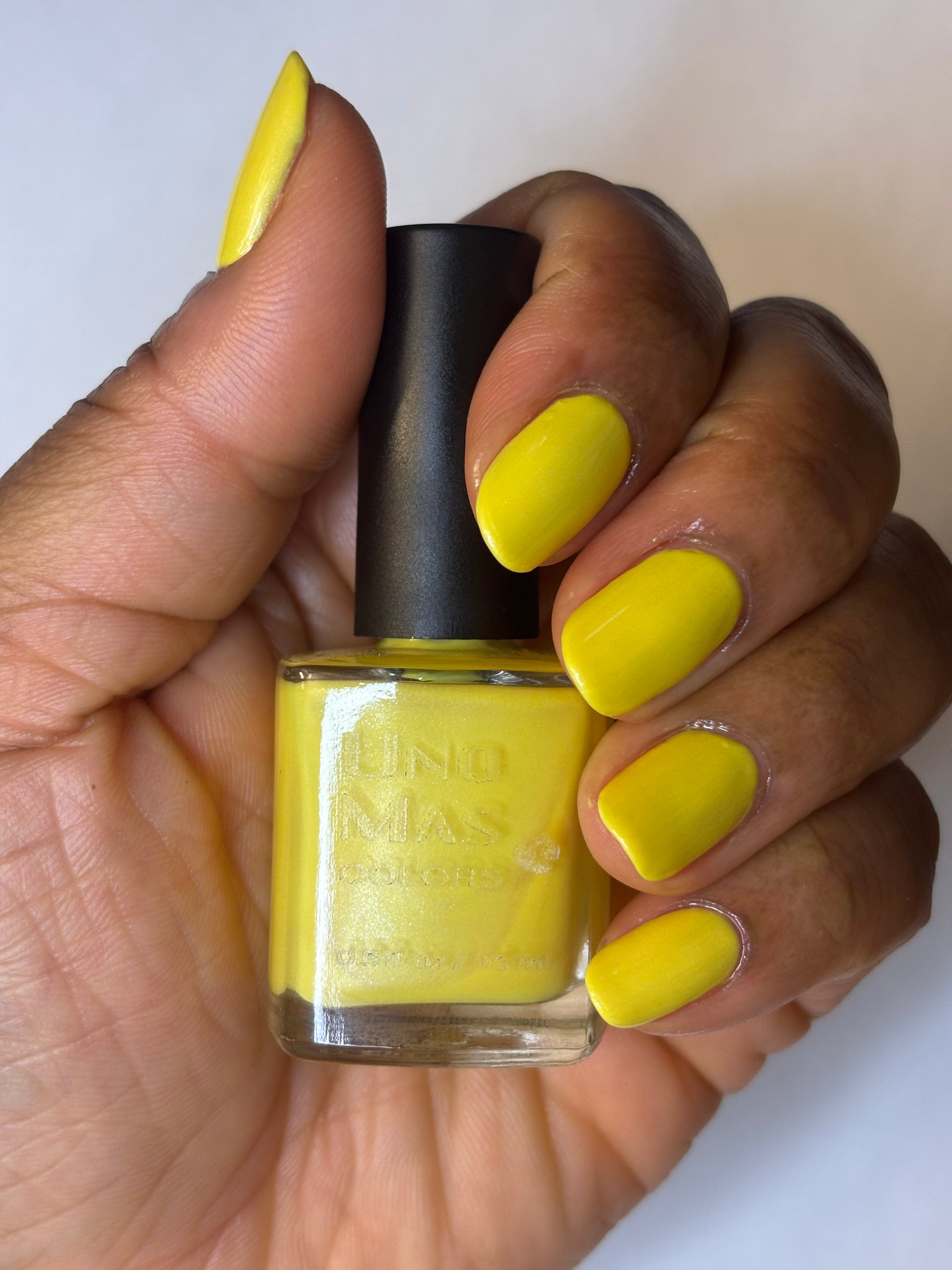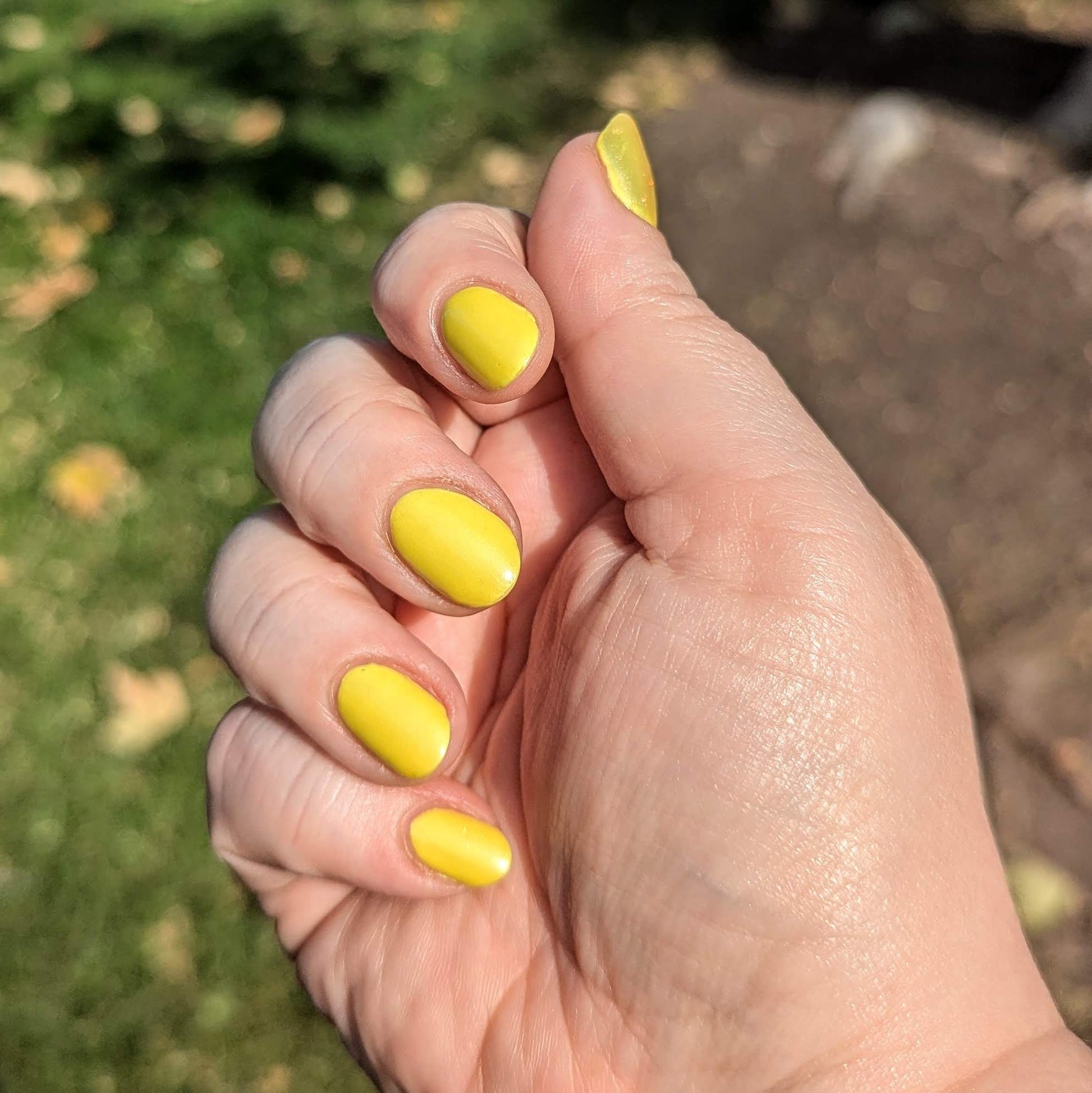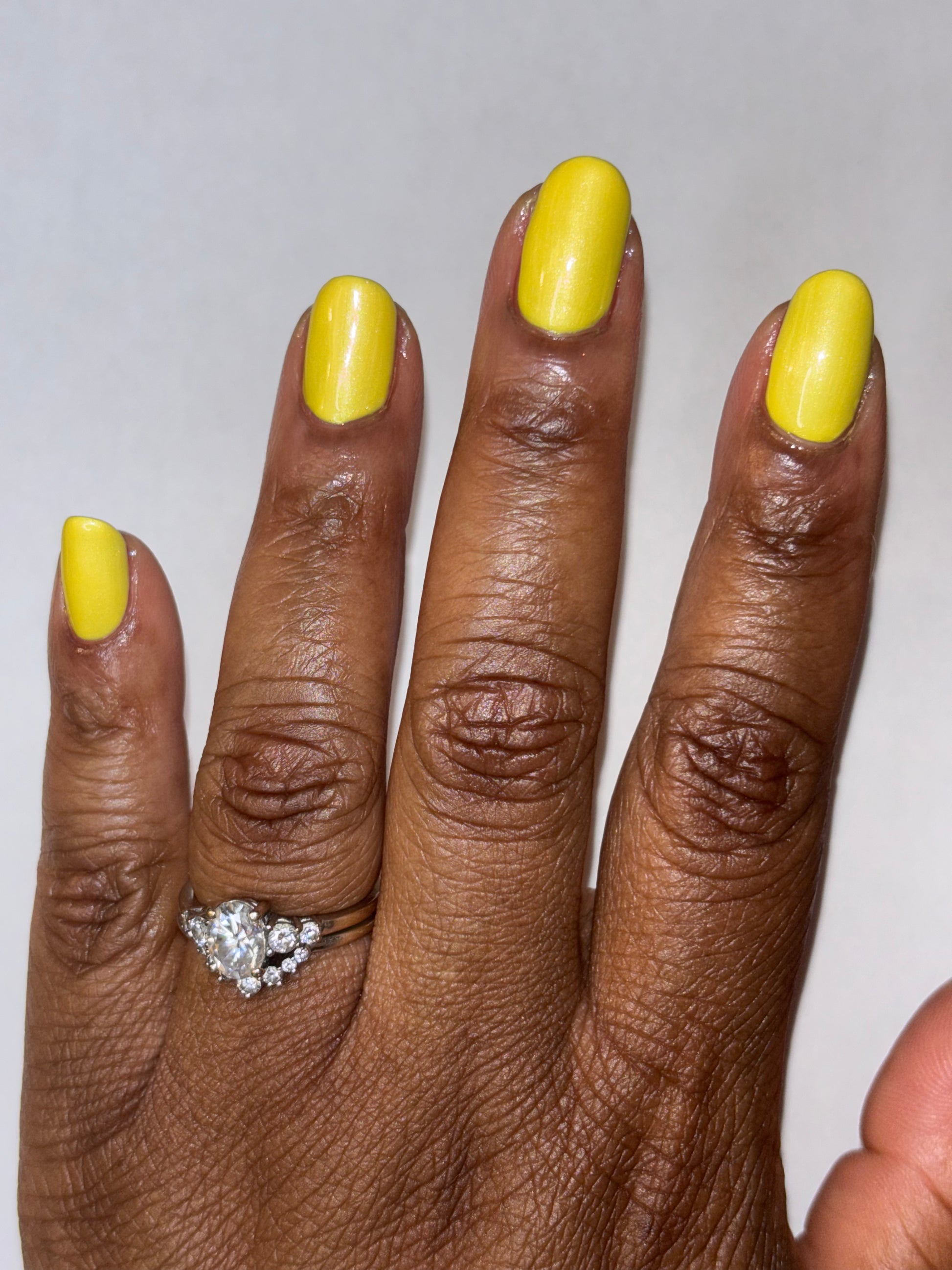This vibrant yellow polish shines with a nice yellow shimmer that gives a soft glow in natural light. While a single coat will give a gentle wash of color, two to three coats will bring the full body tones of the color in this polish. Please try various applications to find your favorite way to express your imagination!
