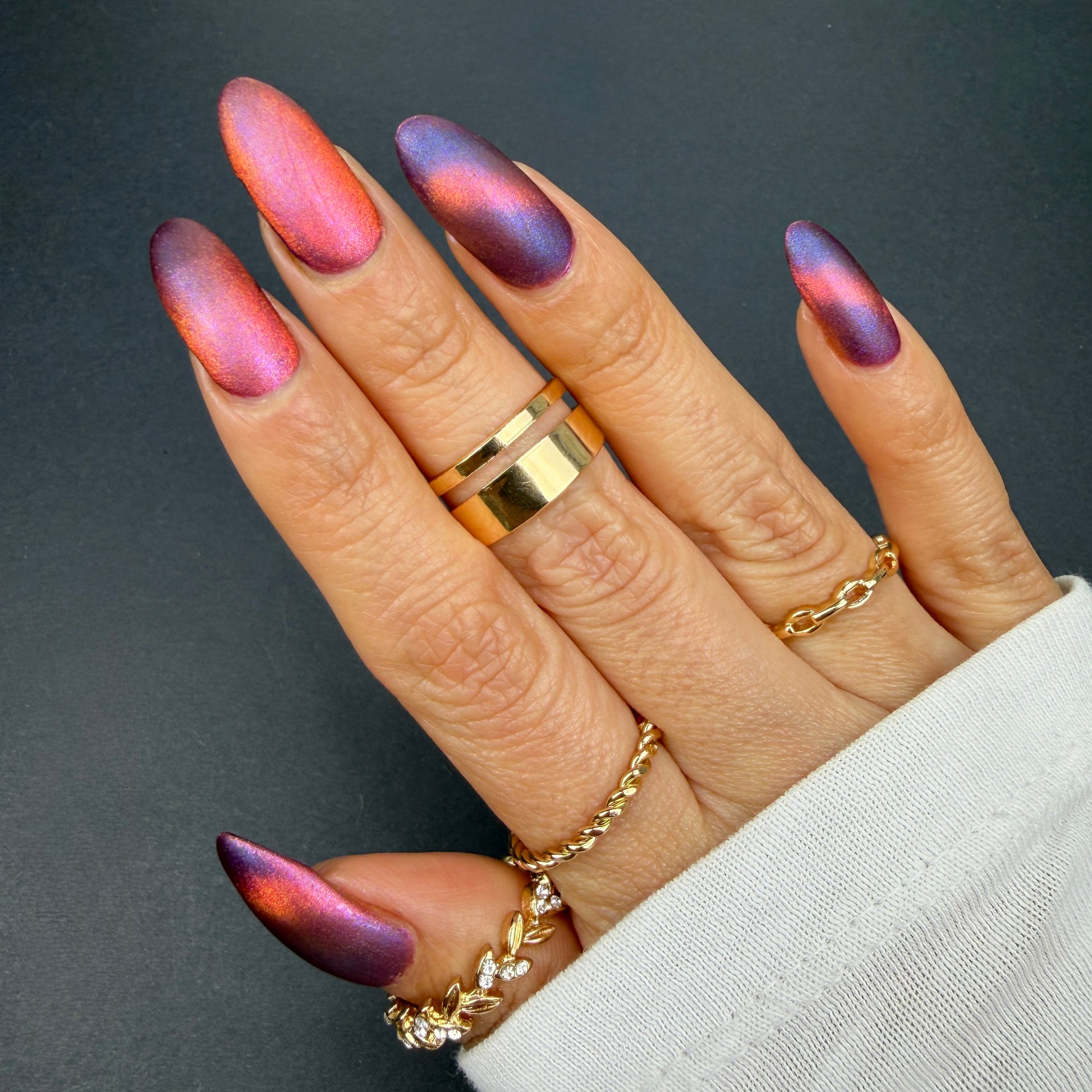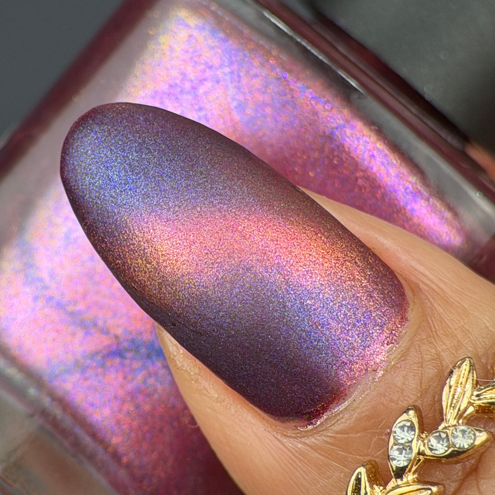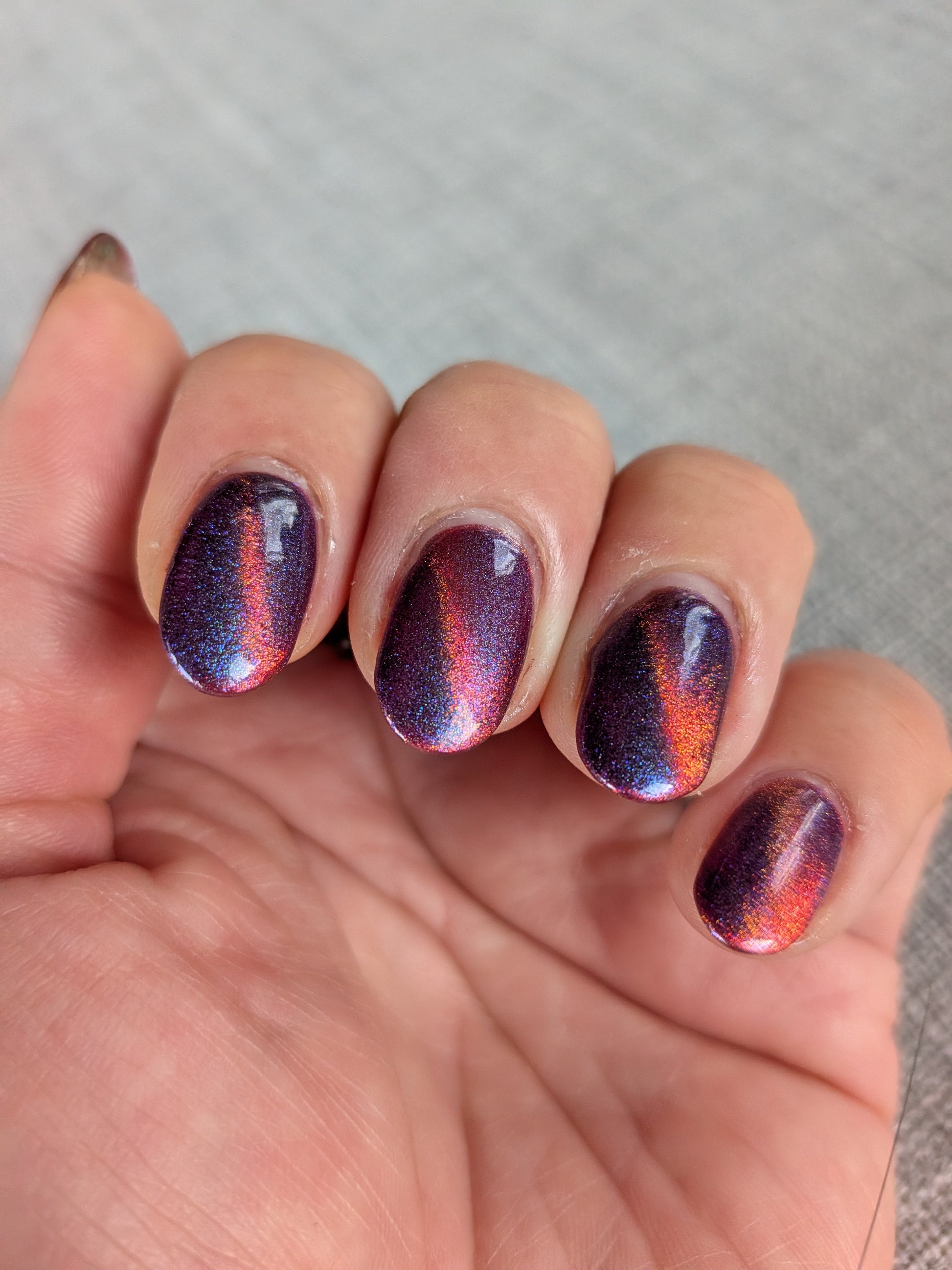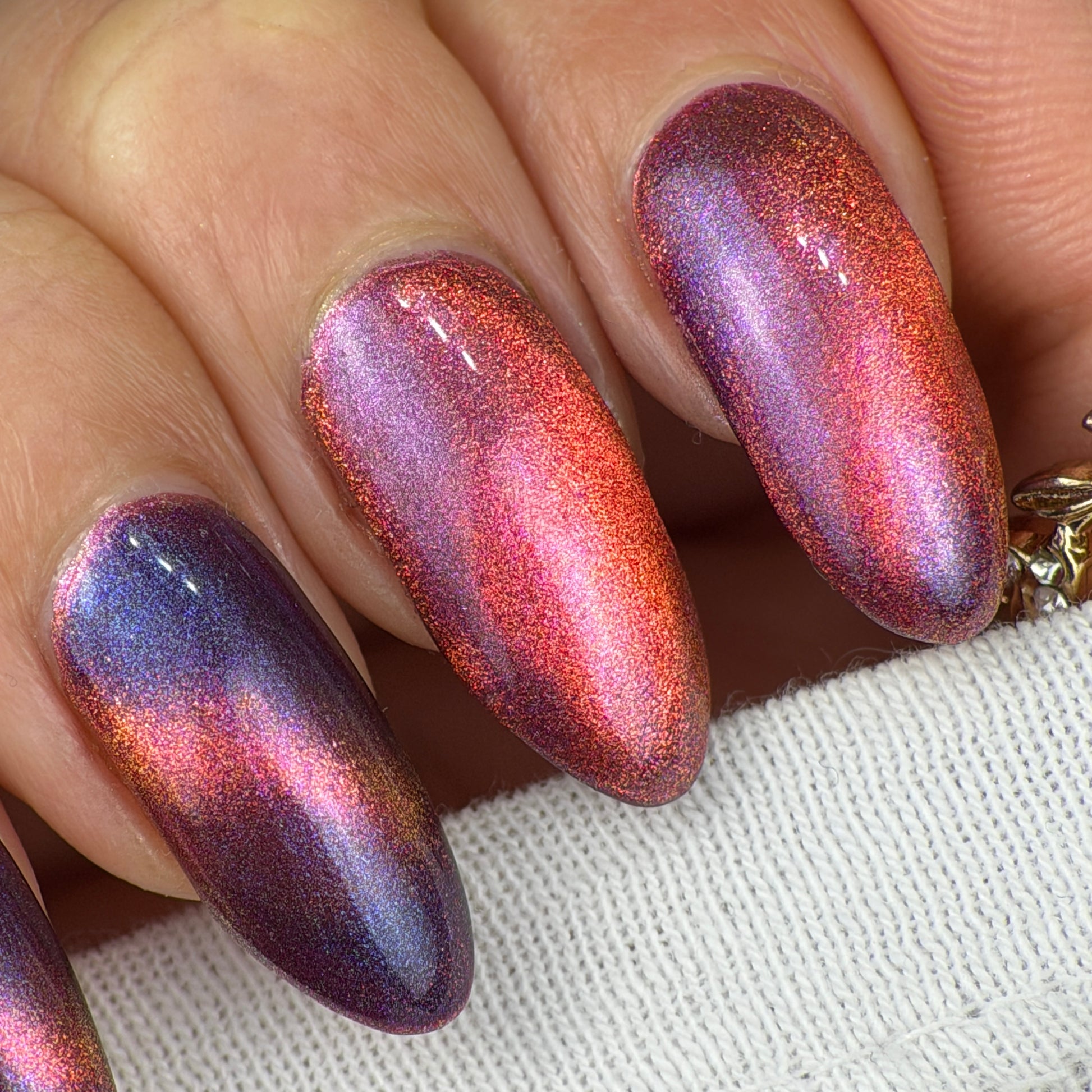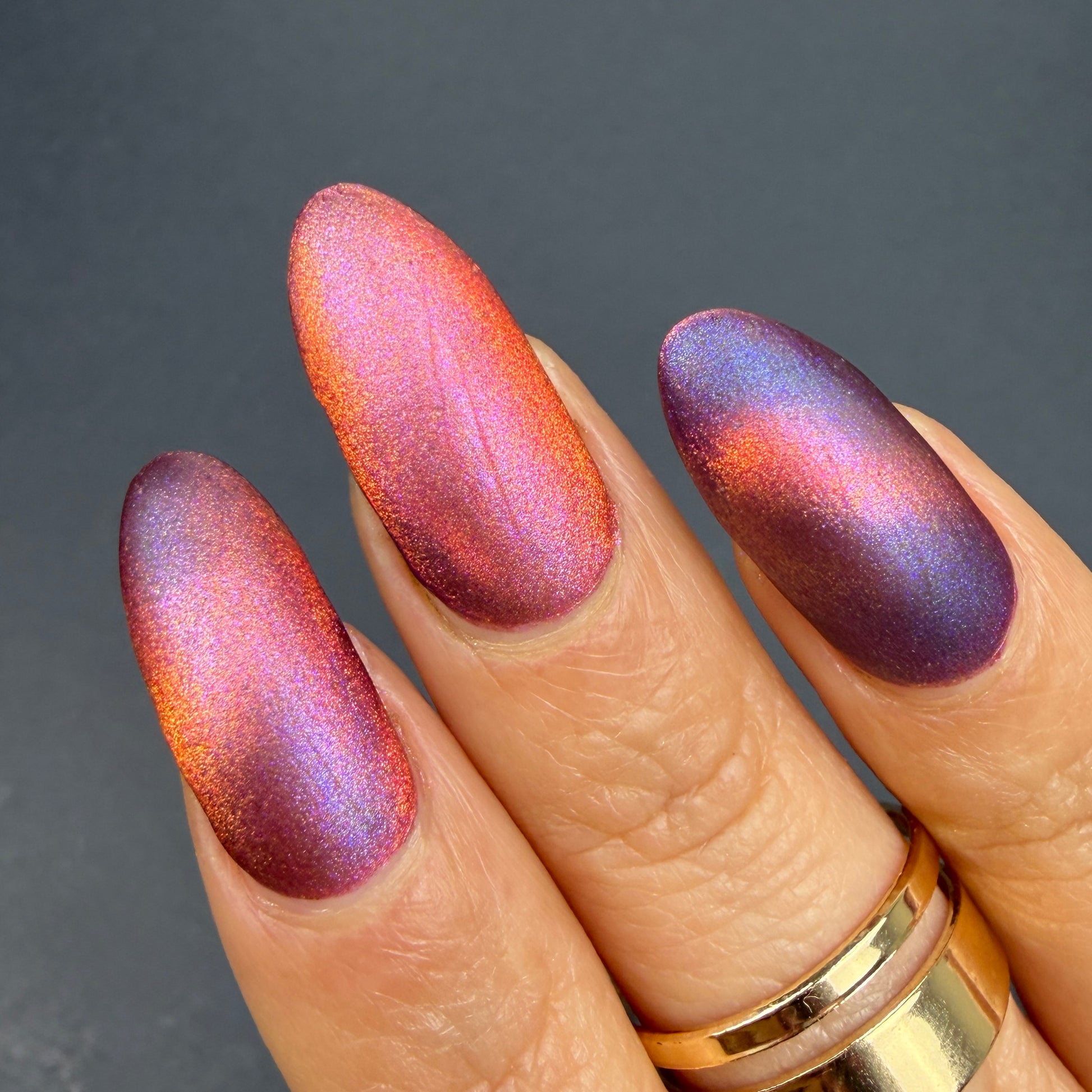 This is a chameleon magnetic on a purple base that ranges from purple, pink, gold, and orange when magnetized.