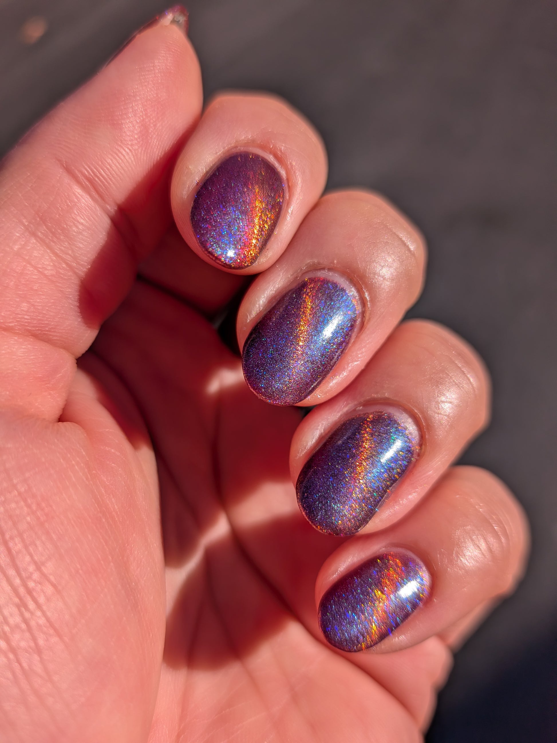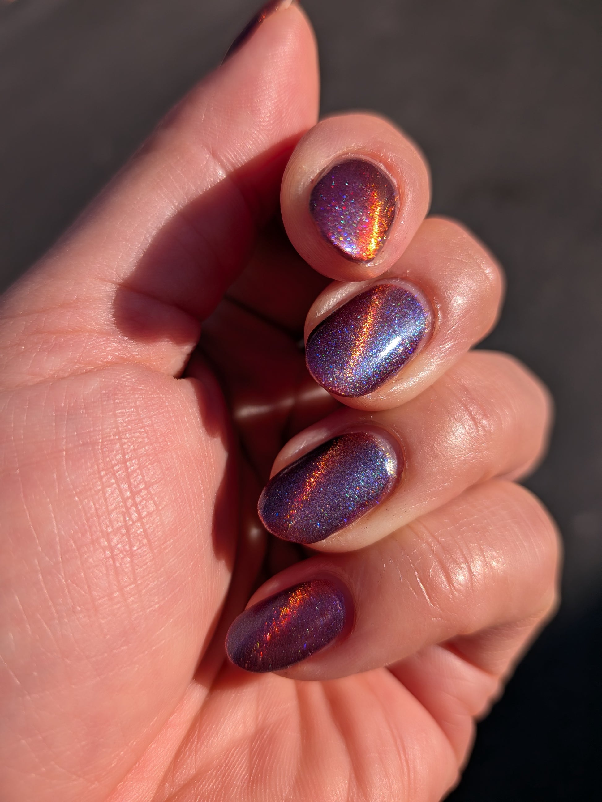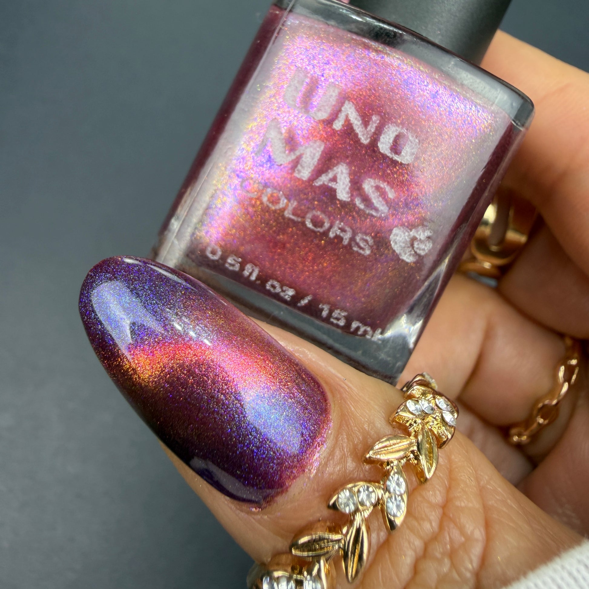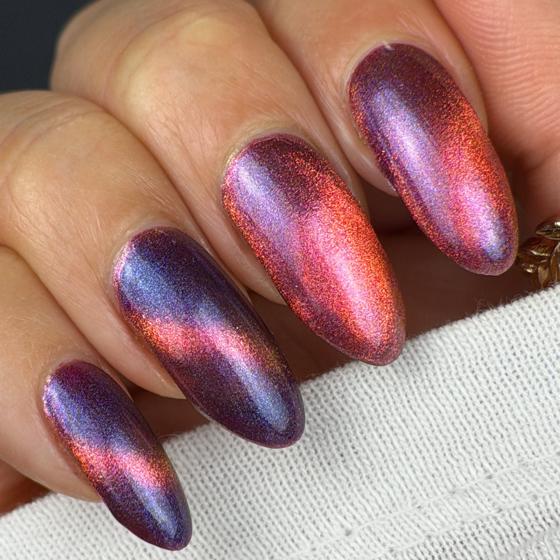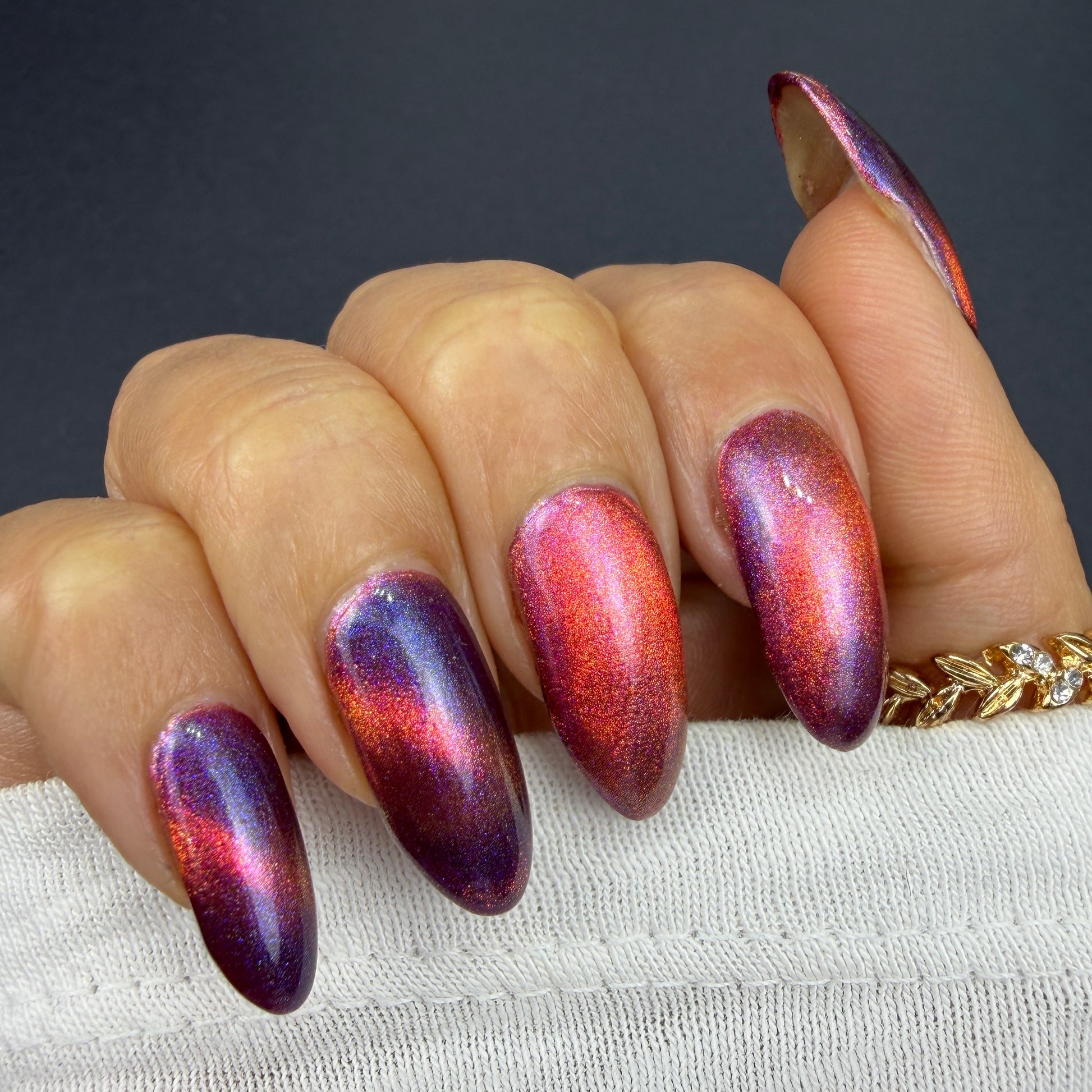 This is a chameleon magnetic on a purple base that ranges from purple, pink, gold, and orange when magnetized.