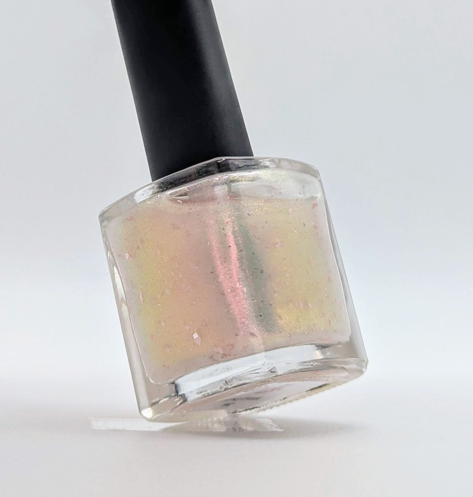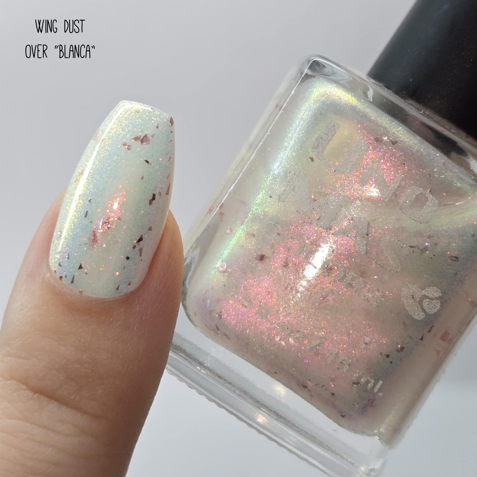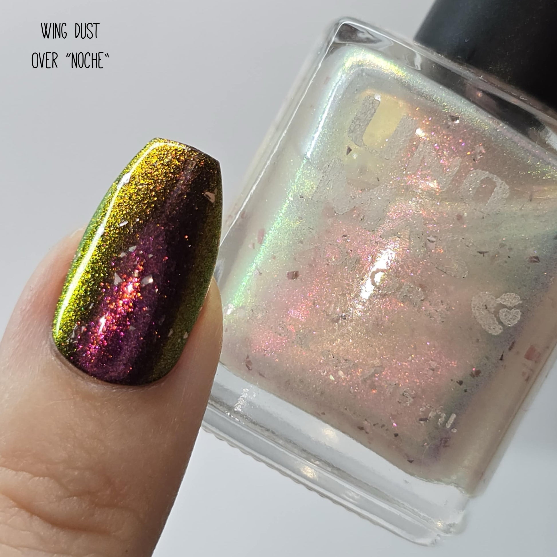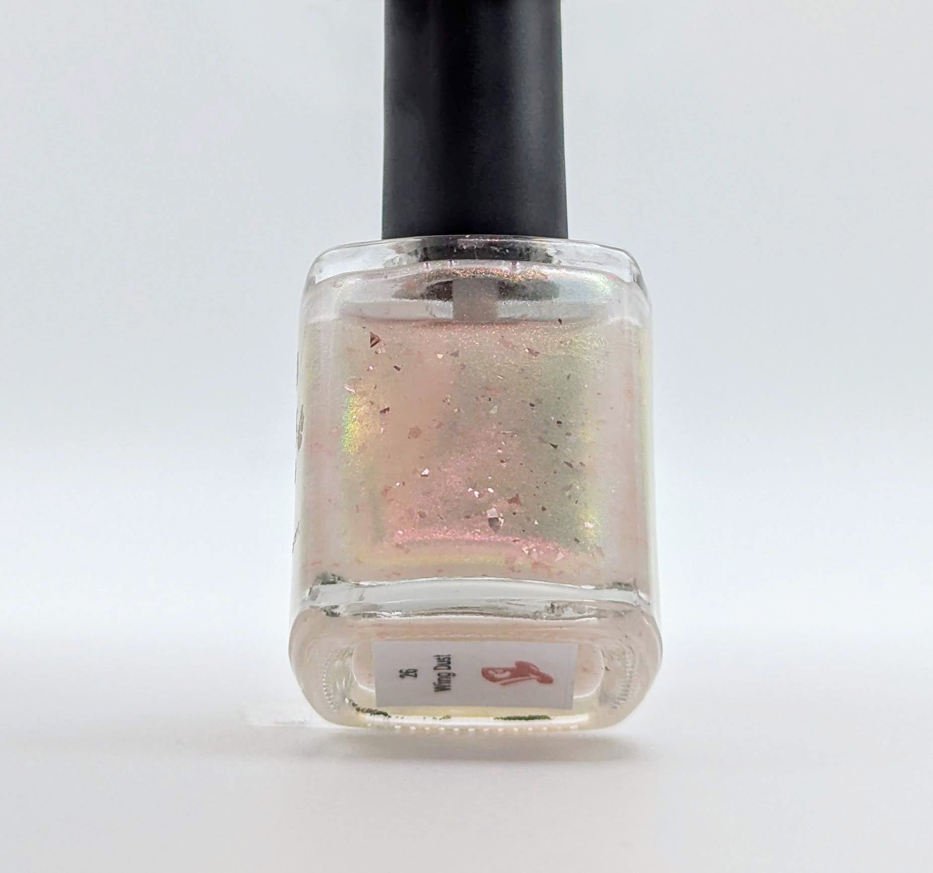 Wing Dust is a light pink/gold iridescent shimmer with pink sparkle and small pink/silver flakies designed to enhance any base color. We suggest 1 coat for a faint shimmer, 2 coats for a strong shimmer. You can also use this topper as a stand alone polish, just play with the layering to create what you like!