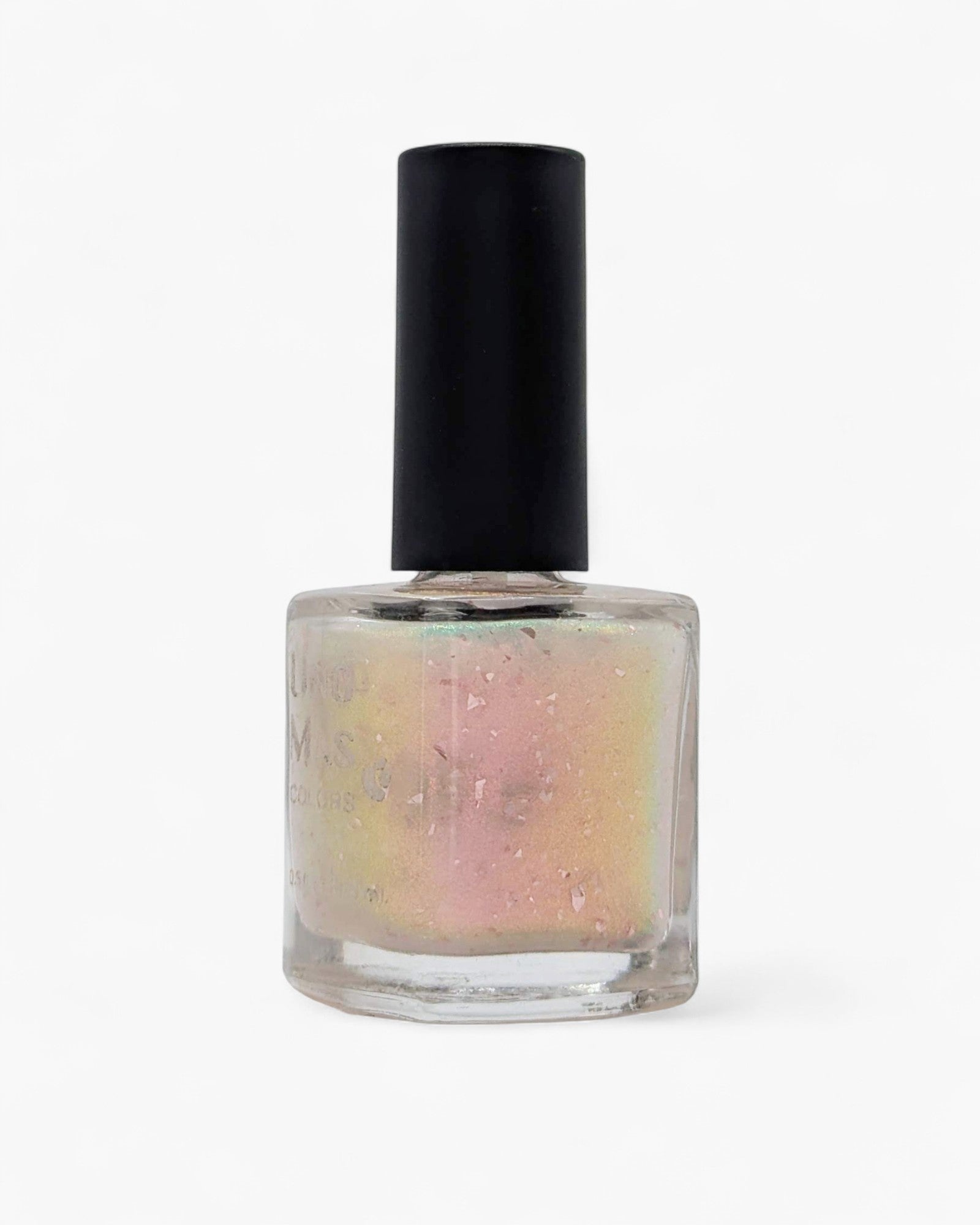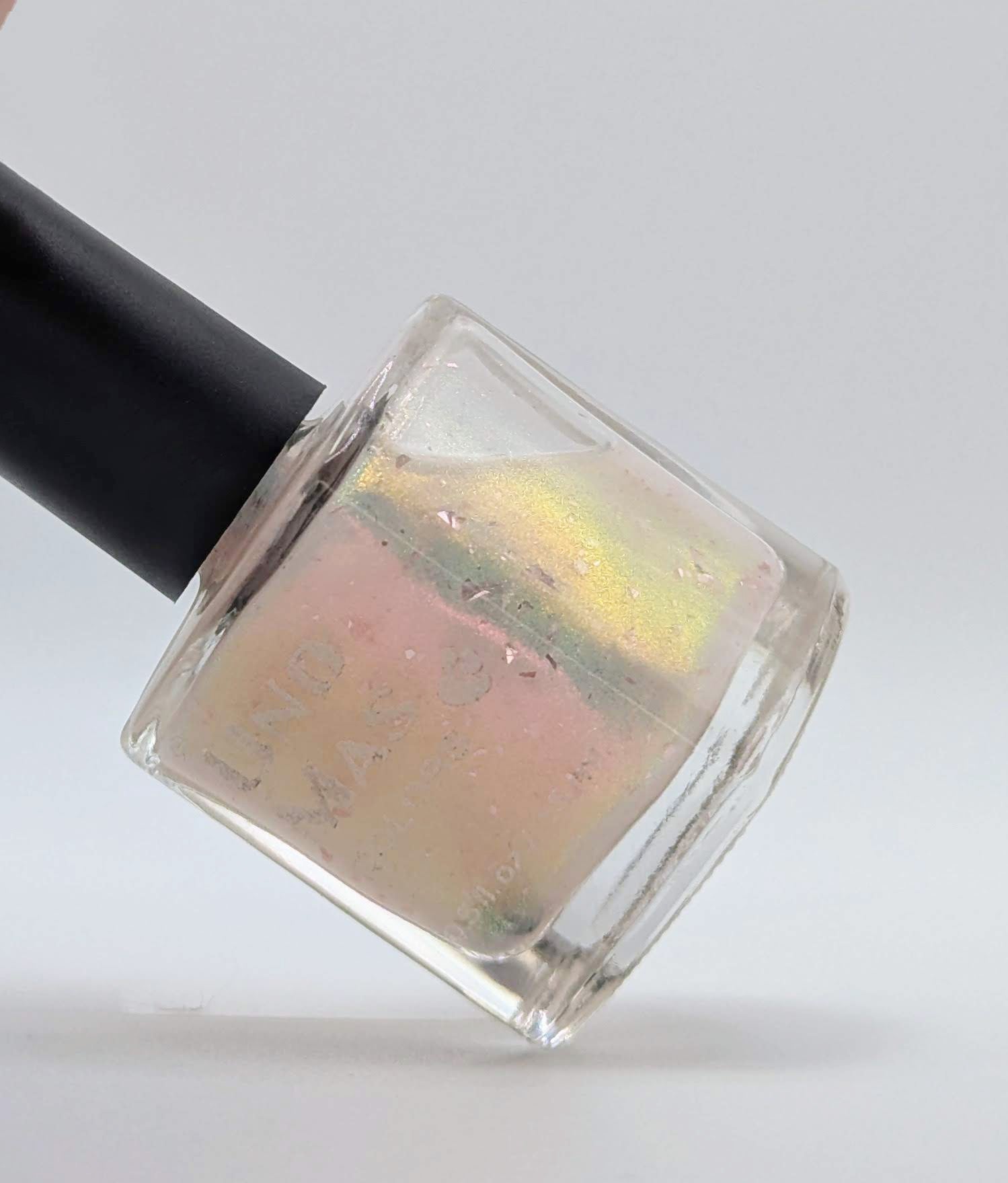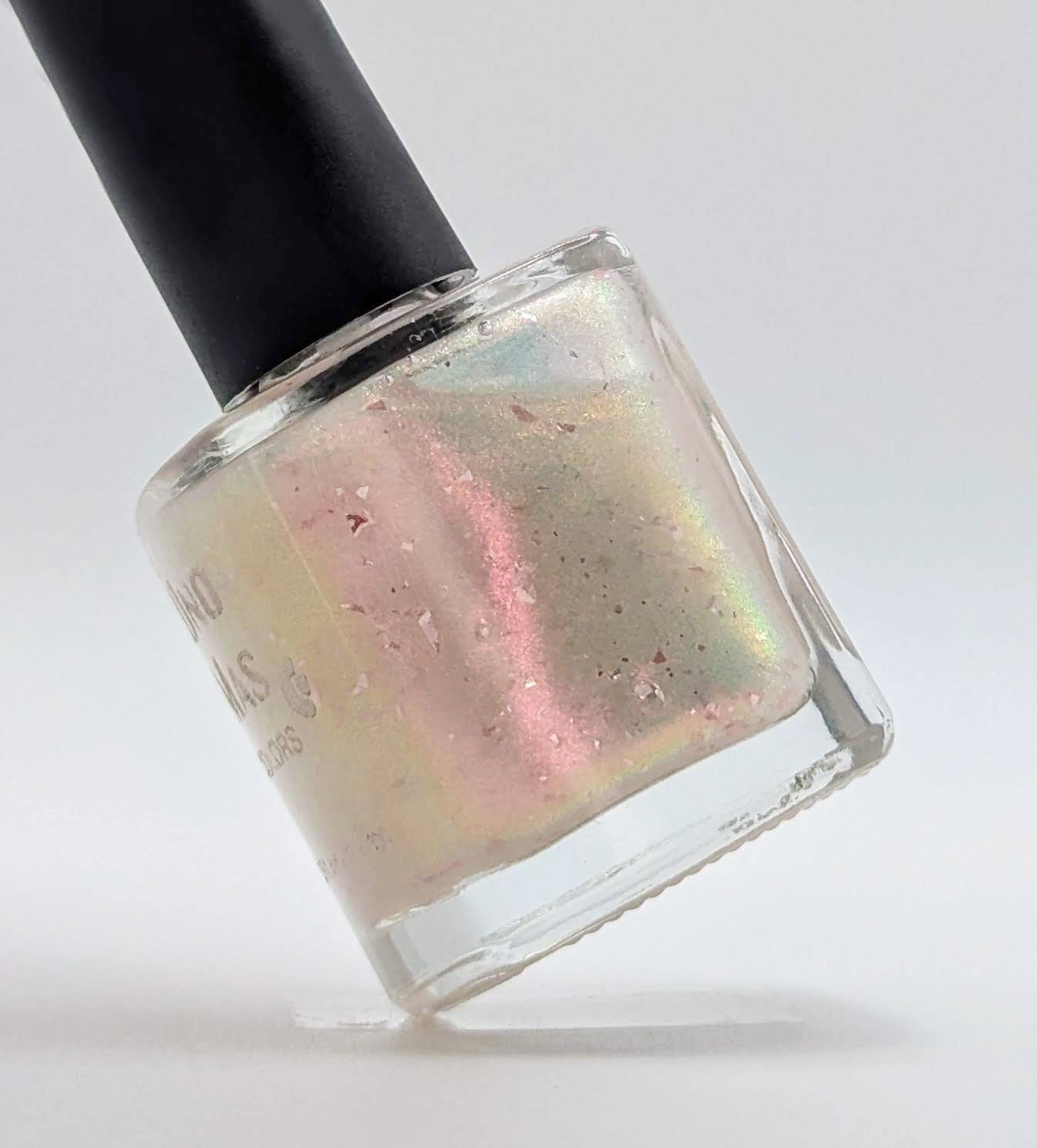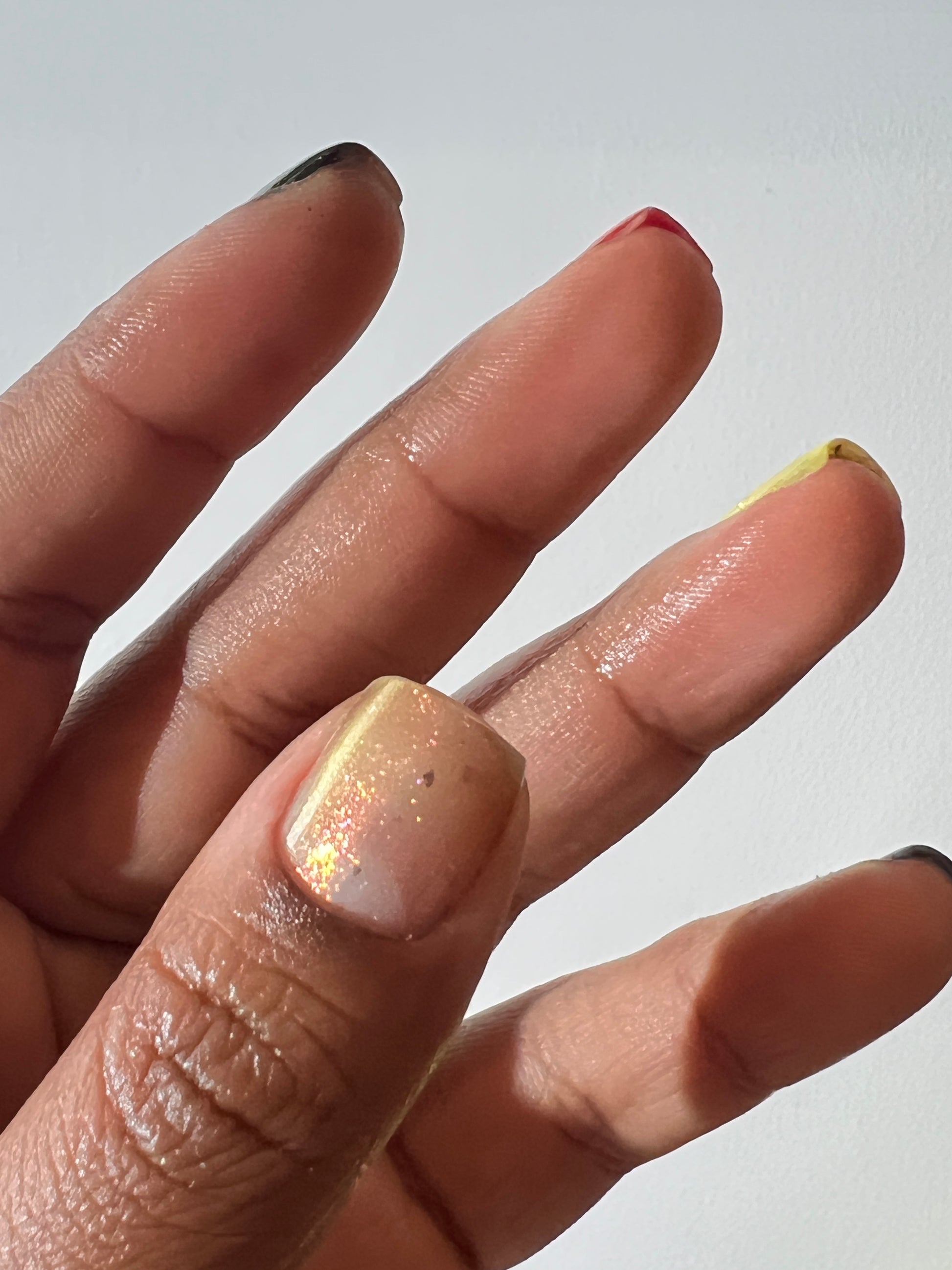 Wing Dust is a light pink/gold iridescent shimmer with pink sparkle and small pink/silver flakies designed to enhance any base color. We suggest 1 coat for a faint shimmer, 2 coats for a strong shimmer. You can also use this topper as a stand alone polish, just play with the layering to create what you like!