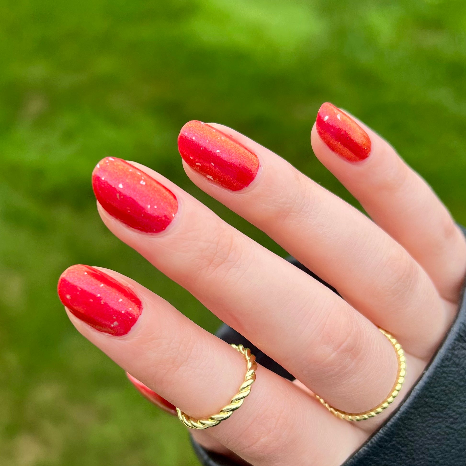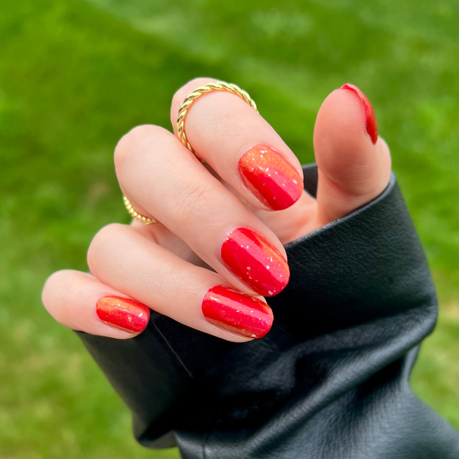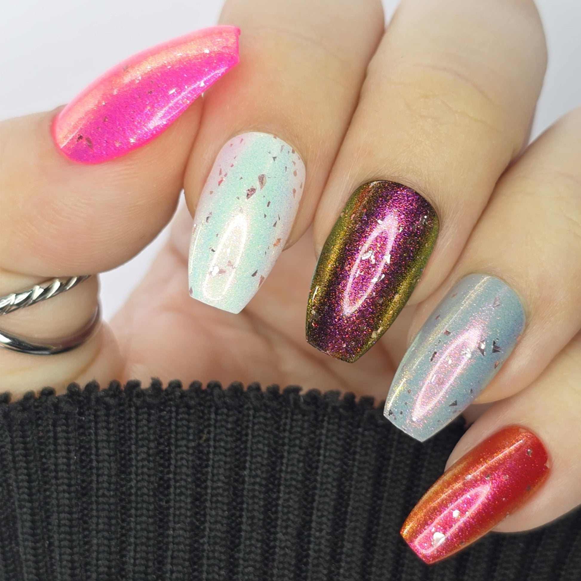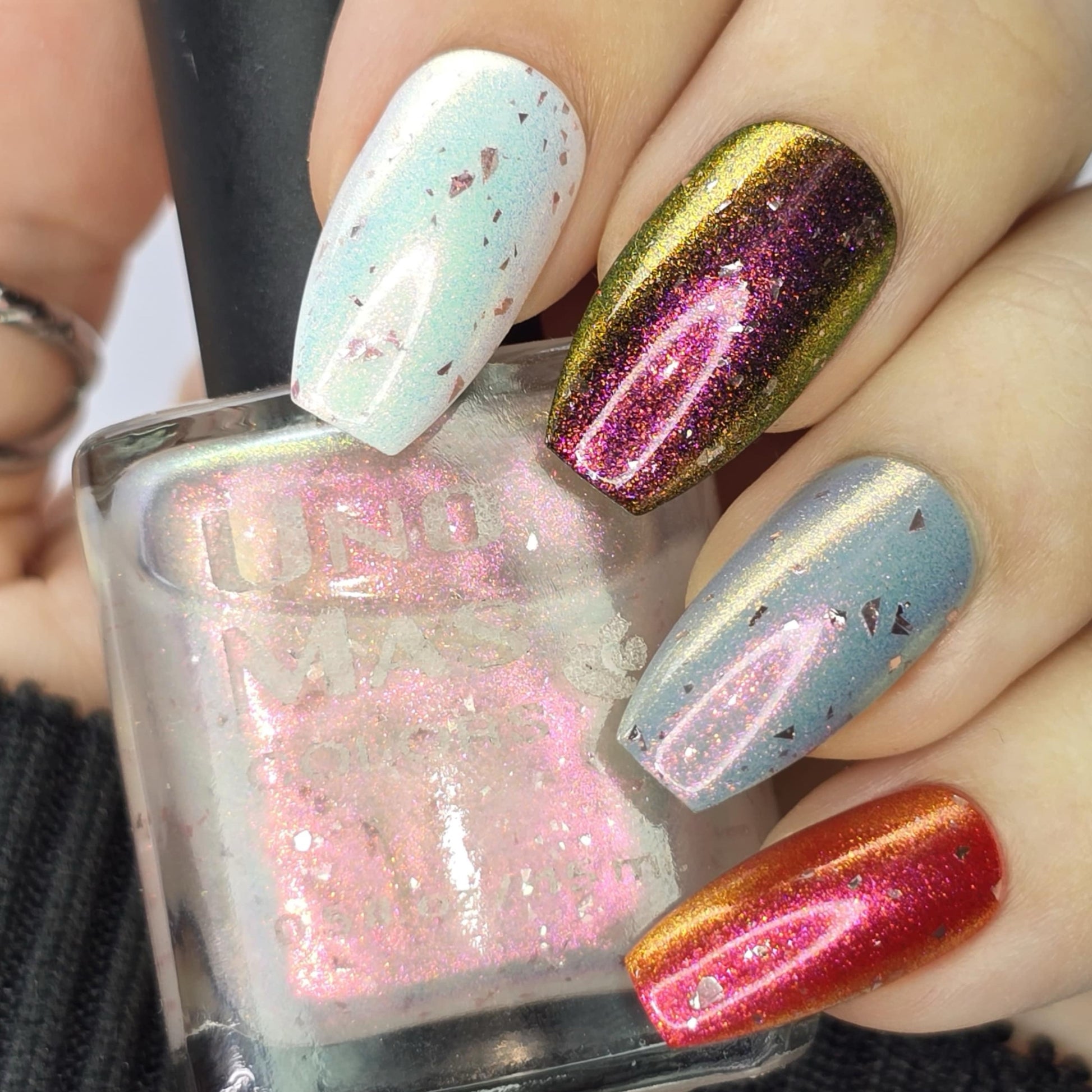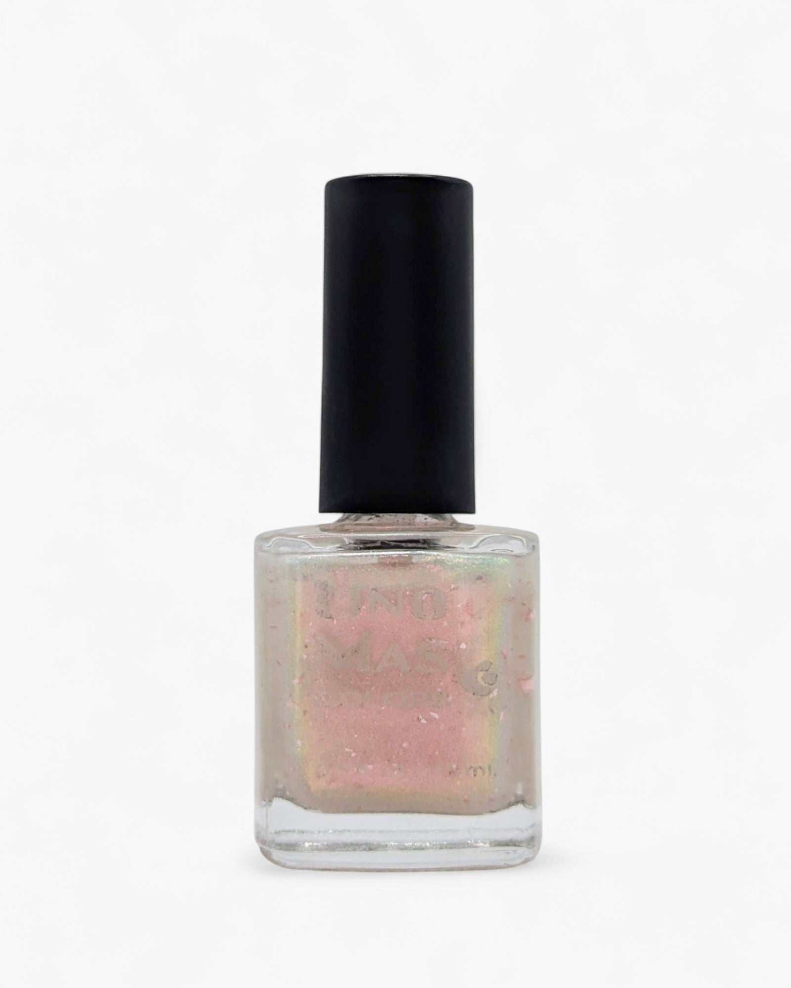 Wing Dust is a light pink/gold iridescent shimmer with pink sparkle and small pink/silver flakies designed to enhance any base color. We suggest 1 coat for a faint shimmer, 2 coats for a strong shimmer. You can also use this topper as a stand alone polish, just play with the layering to create what you like!