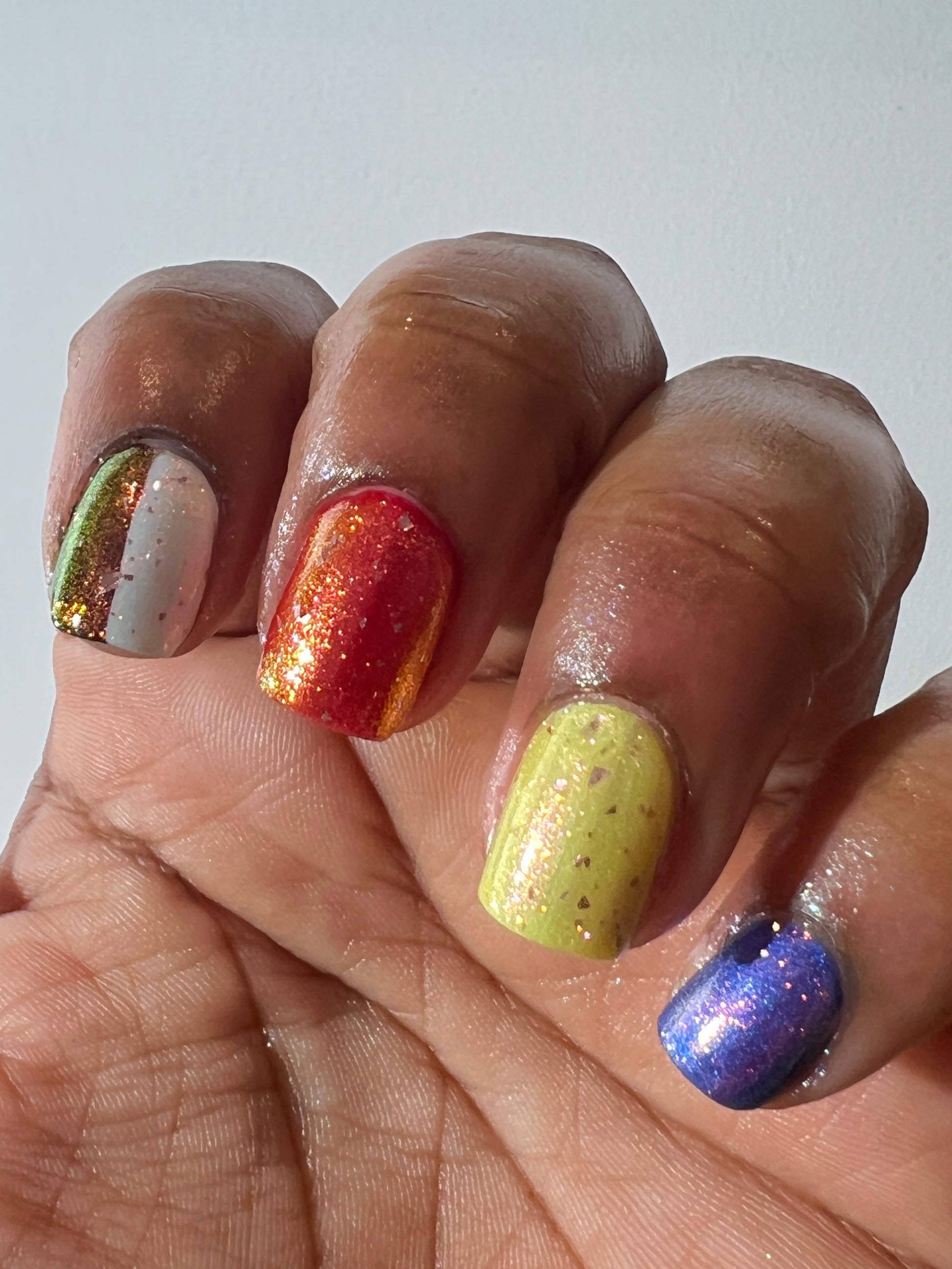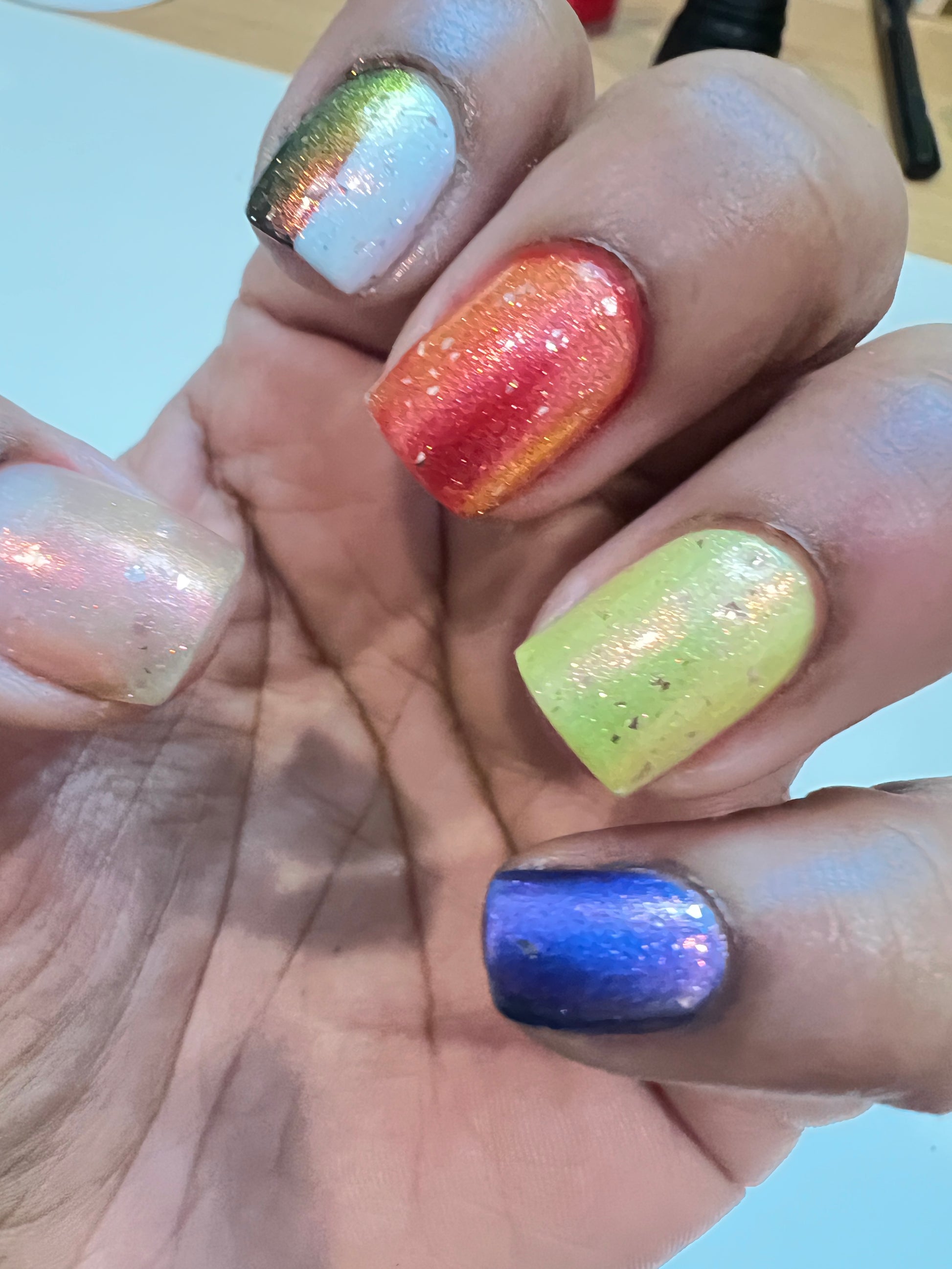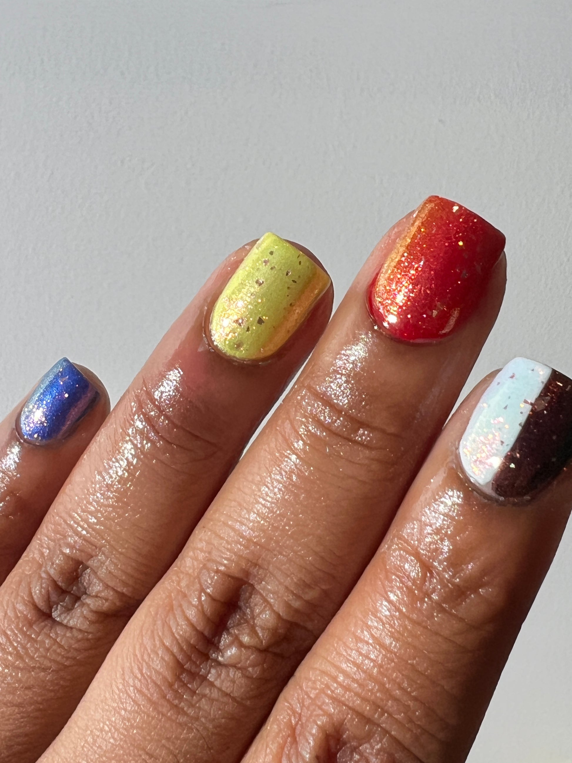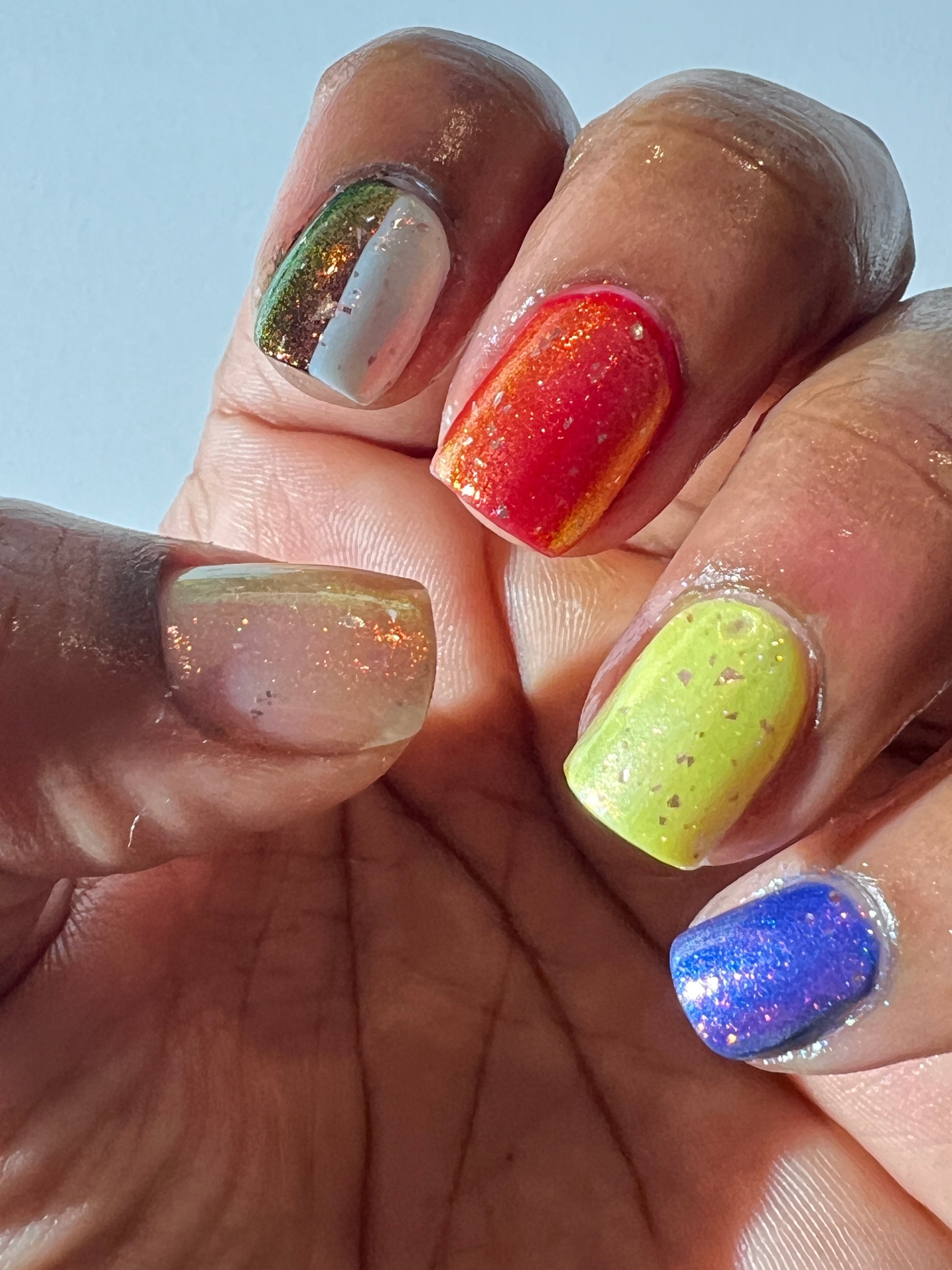 Wing Dust is a light pink/gold iridescent shimmer with pink sparkle and small pink/silver flakies designed to enhance any base color. We suggest 1 coat for a faint shimmer, 2 coats for a strong shimmer. You can also use this topper as a stand alone polish, just play with the layering to create what you like!